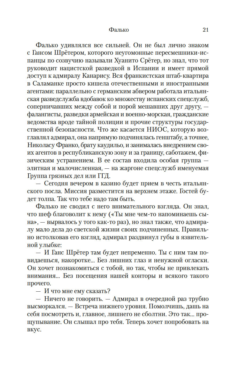 Шпион и плейбой, светский лев и добрый знакомый всех контрабандистов и владельцев кабаре Европы, изысканный денди и тонкий знаток оружия, беззаботный хищник и блестящий профессионал своего циничного дела. Перед вами Лоренсо Фалько – агент правительства Франко, умудренный и опасный волк-одиночка в диких джунглях гражданской войны в Испании. Его направляют в Аликанте, где он должен устроить побег из тюрьмы крупному франкистскому чину; в Танжер, где его начальство надеется заполучить золото Республики; в Париж, где надо скомпрометировать героя войны, а заодно помешать Пабло Пикассо обнародовать монументальное полотно на Всемирной выставке. Фалько – свободный радикал, ложка дегтя, козырь в рукаве. Он ценит храбрость, в том числе и храбрость противника, но в его мире честь – роскошь, и порой непозволительная. В его мире выживают только искушенные хищники, которым, когда рассеется дым, остается лишь с мрачным юмором констатировать несправедливость мироустройства. И в сердце хищник не пускает никого – кроме одной отважной и безжалостной женщины, своего двойника из кривого, идущего рябью зеркала...