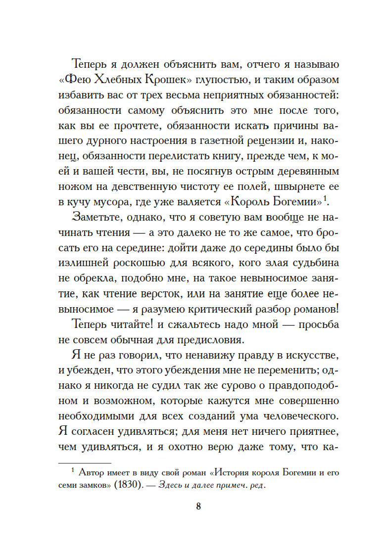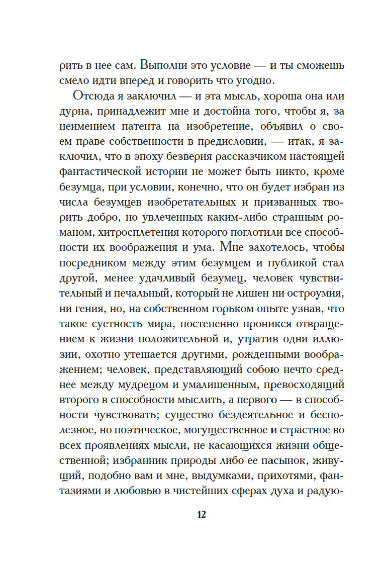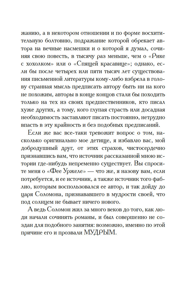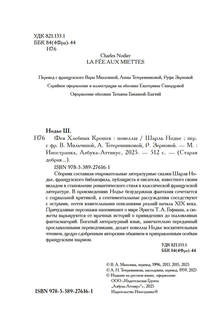 Сборник составили очаровательные литературные сказки Шарля Нодье, французского библиофила, публициста и писателя, известного своим вкладом в становление романтического стиля в классической французской литературе. В произведениях Нодье безудержная фантазия сочетается с социальной критикой, а сентиментальные рассуждения соседствуют с острыми, почти язвительными описаниями реалий начала XIХ века. Причудливые персонажи напоминают о мире Эрнста Т. А. Гофмана, а сюжеты варьируются от мрачных историй о привидениях до шаловливых фантасмагорий. Богатый литературный язык, замечательно переданный прославленными переводчиками, делает новеллы Нодье восхитительным чтением, щедро сдобренным авторским обаянием и приправленным особым французским шармом.