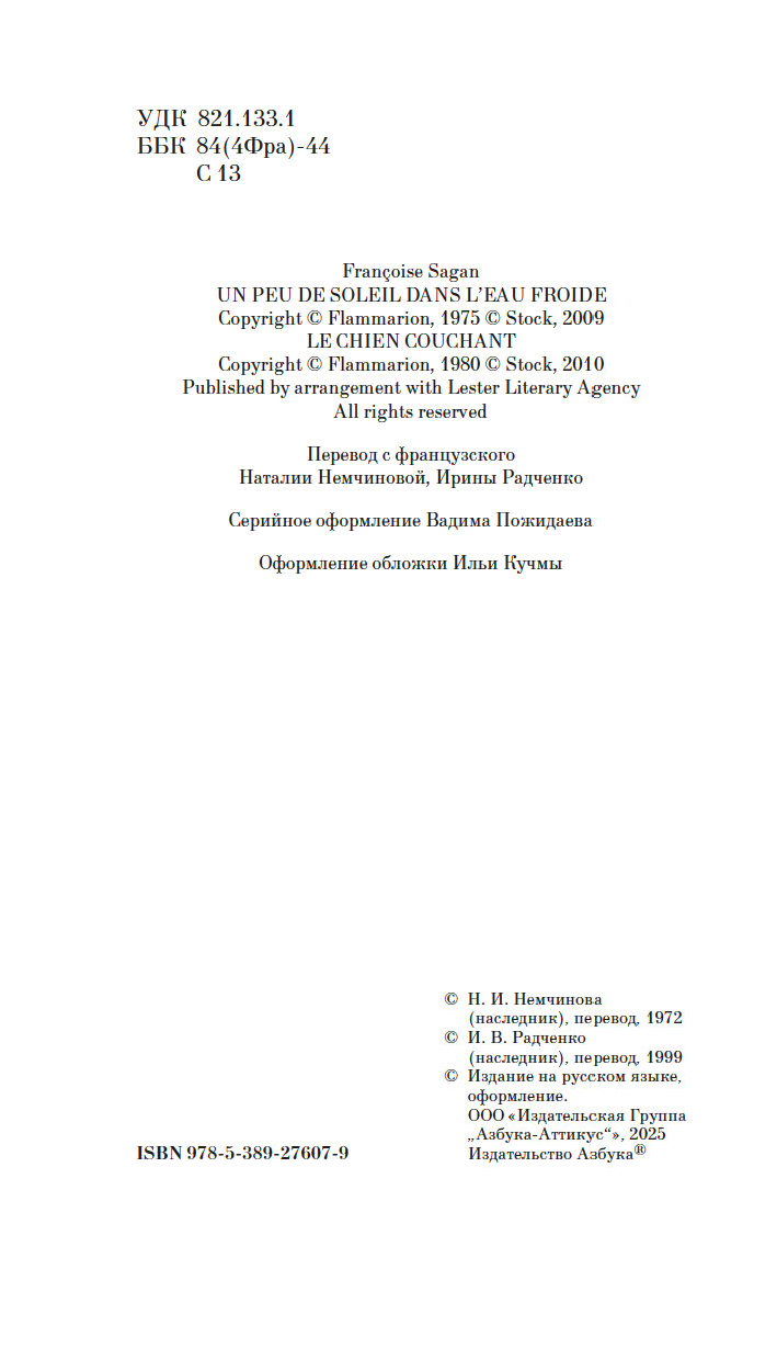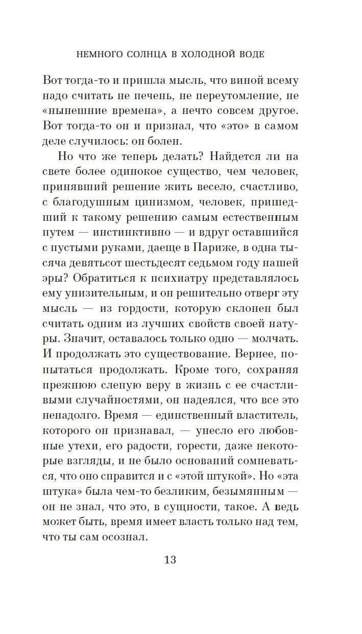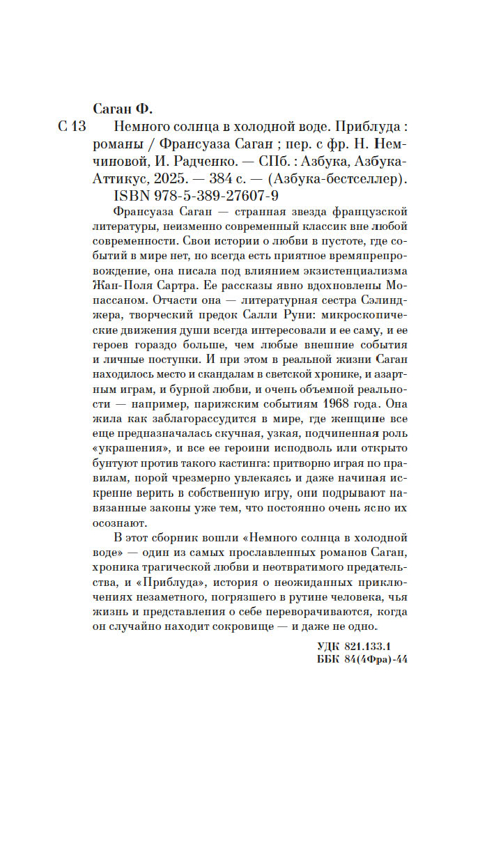 В этот сборник вошли "Немного солнца в холодной воде" – один из самых прославленных романов Саган, хроника трагической любви и неотвратимого предательства, и "Приблуда", история о неожиданных приключениях незаметного, погрязшего в рутине человека, чья жизнь и представления о себе переворачиваются, когда он случайно находит сокровище – и даже не одно.