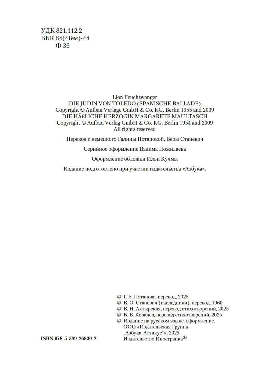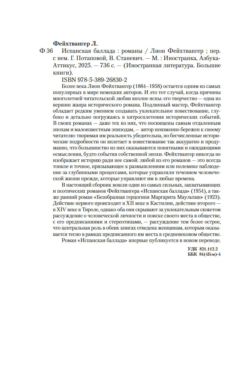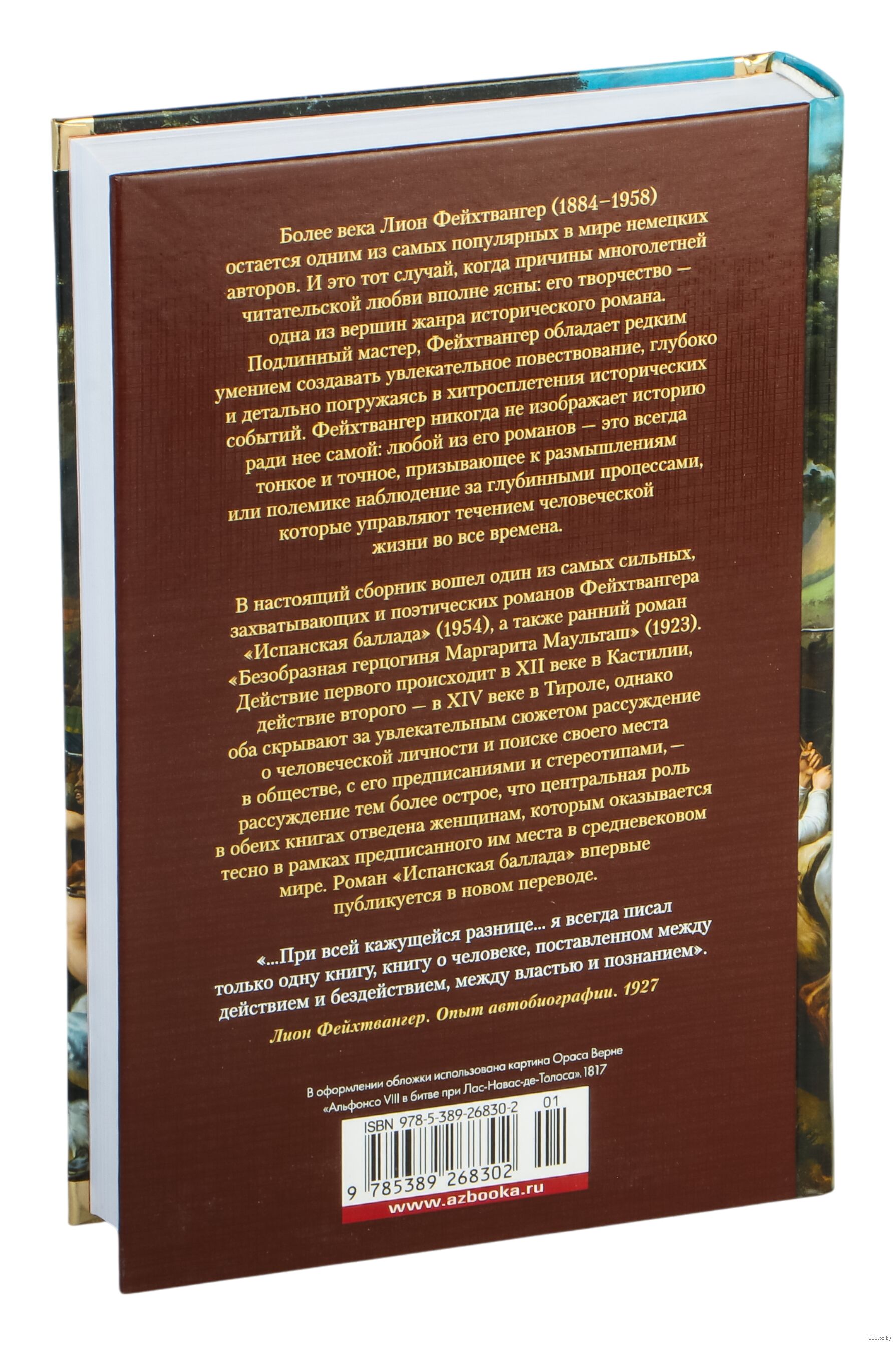В настоящий сборник вошли один из самых сильных, захватывающих и поэтических романов Фейхтвангера "Испанская баллада" (1954), а также ранний роман "Безобразная герцогиня Маргарита Маульташ" (1923). Действие первого происходит в XII веке в Кастилии, действие второго – в XIV веке в Тироле, однако оба они скрывают за увлекательным сюжетом рассуждение о человеческой личности и поиске своего места в обществе, с его предписаниями и стереотипами, – рассуждение тем более острое, что центральная роль в обеих книгах отведена женщинам, которым оказывается тесно в рамках предписанного им места в средневековом обществе.