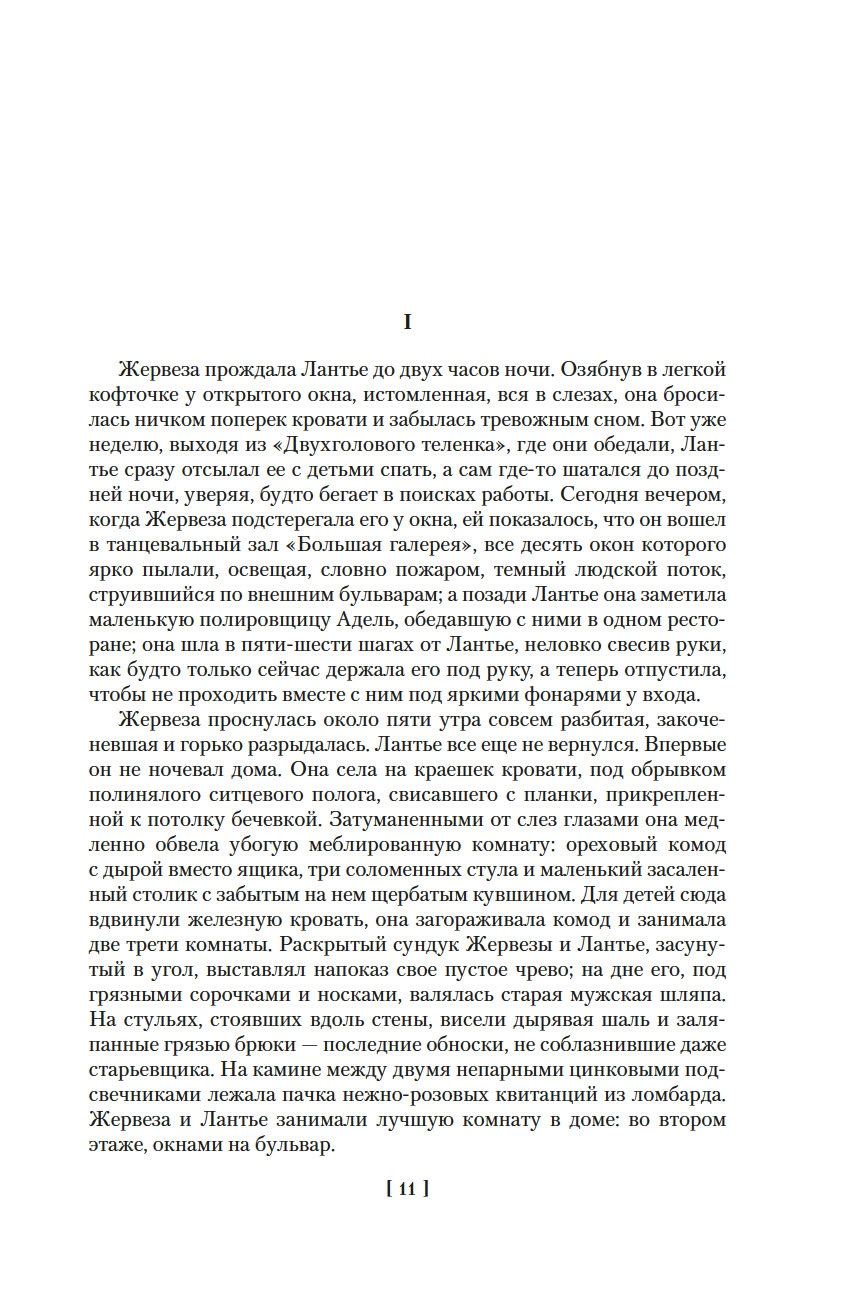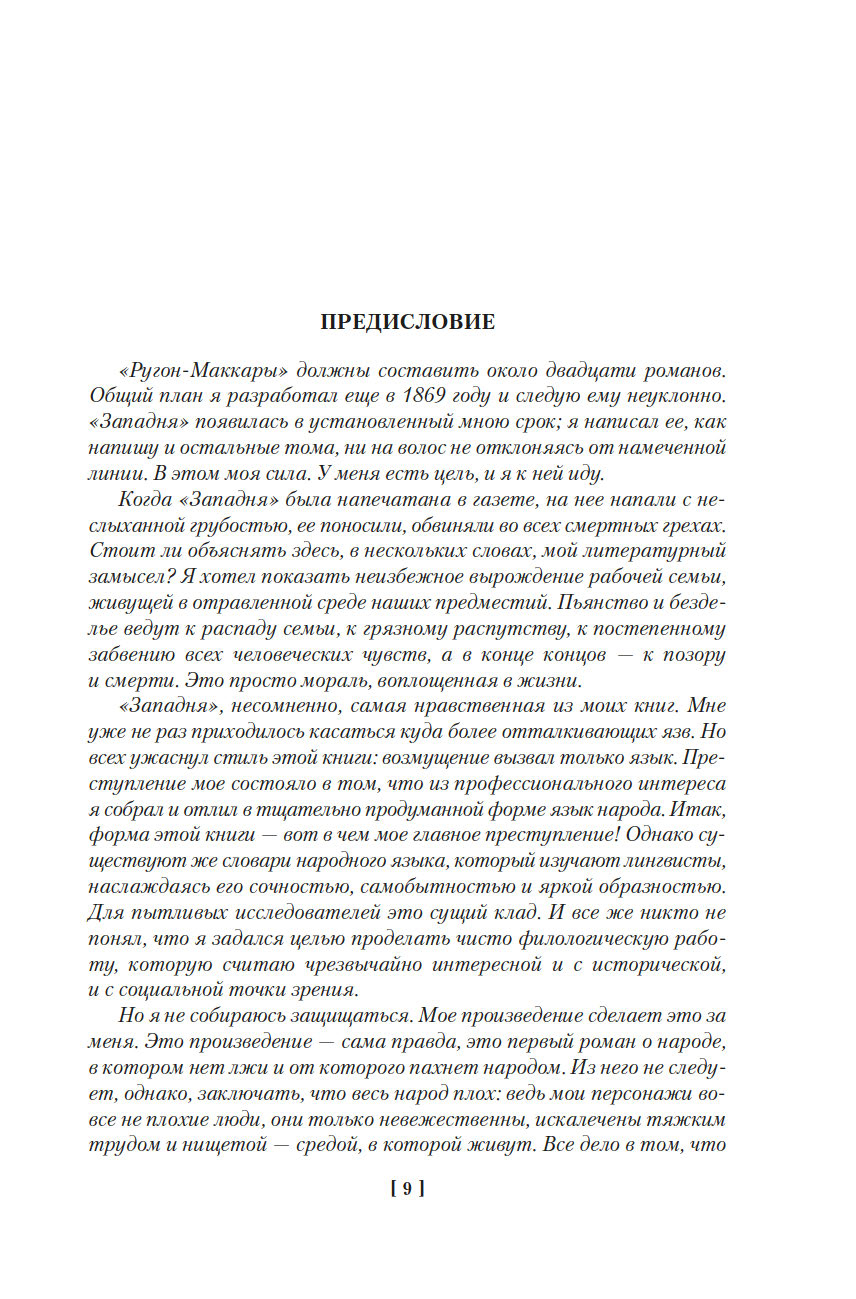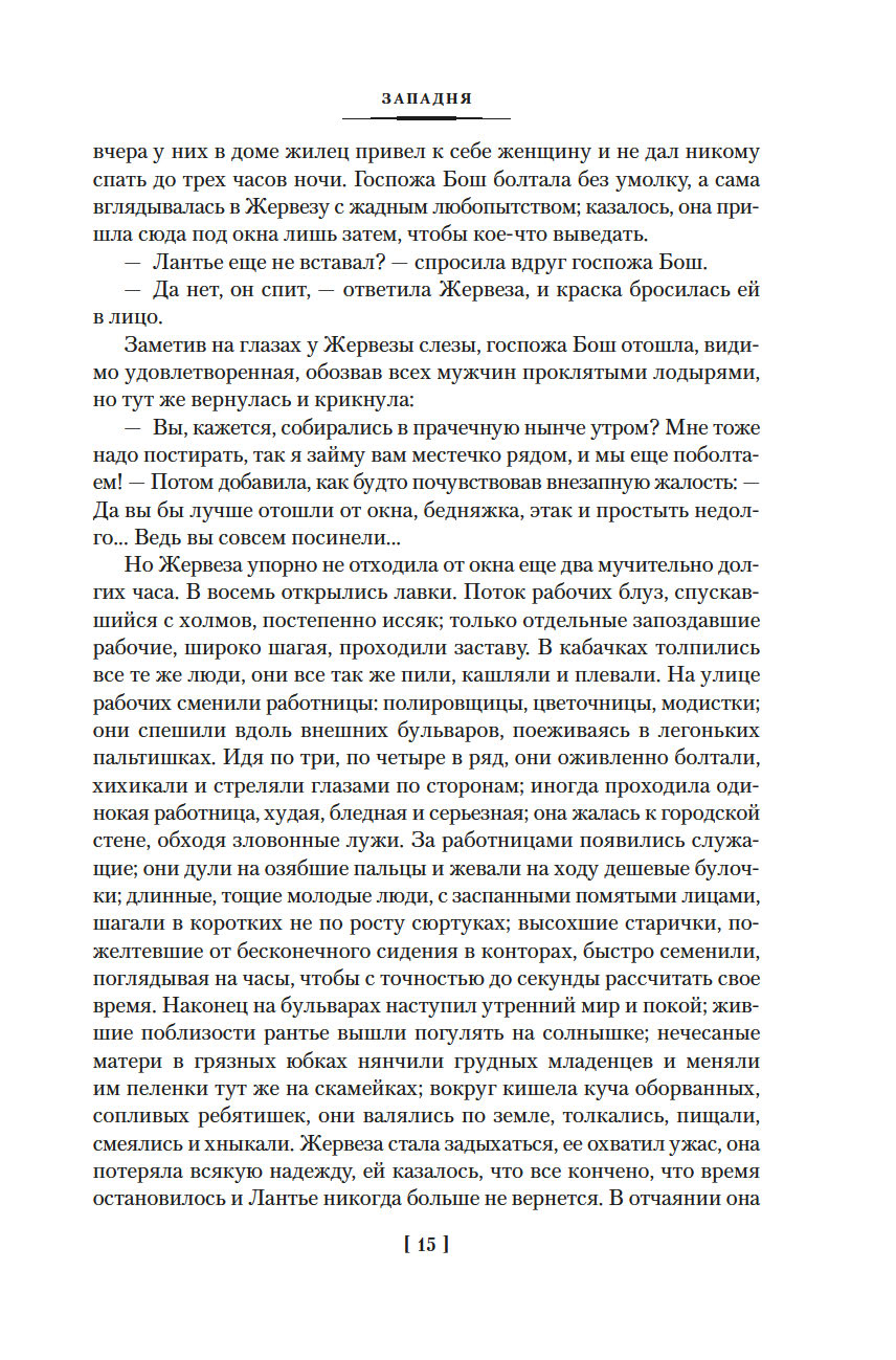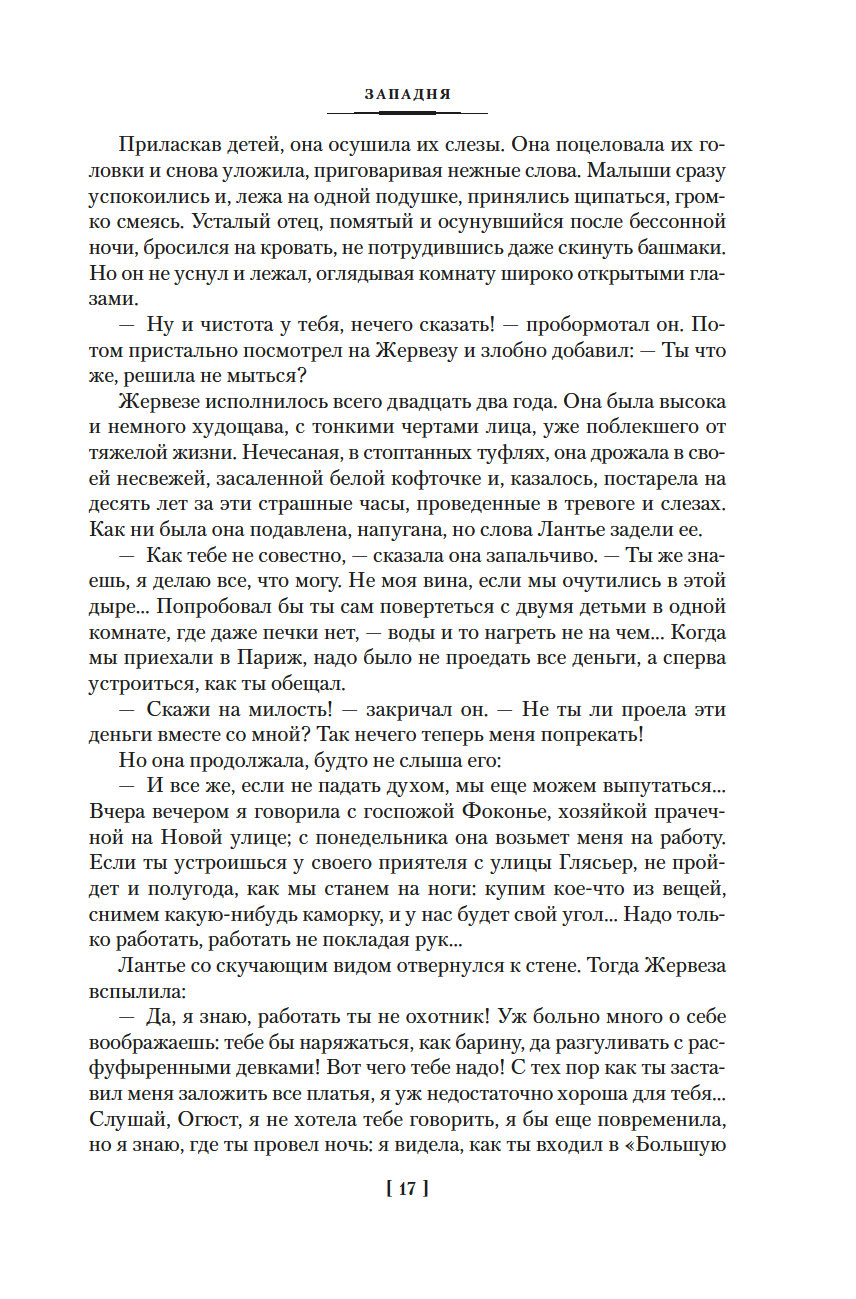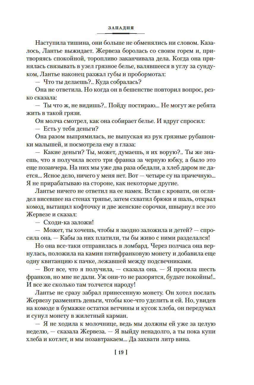 Роман "Западня", впервые опубликованный в 1876 году, шокировал современников писателя. В бедном квартале, вдали от глаз преуспевающей и благоденствующей верхушки общества Второй империи, жизнь – это борьба за существование, обеспечить которое можно лишь ежедневным, изнурительным трудом. И каждый из живущих здесь постоянно ходит по краю демонической ловушки, которая поглощает судьбы простых парижан, лишает их человеческого облика и человеческих стремлений...