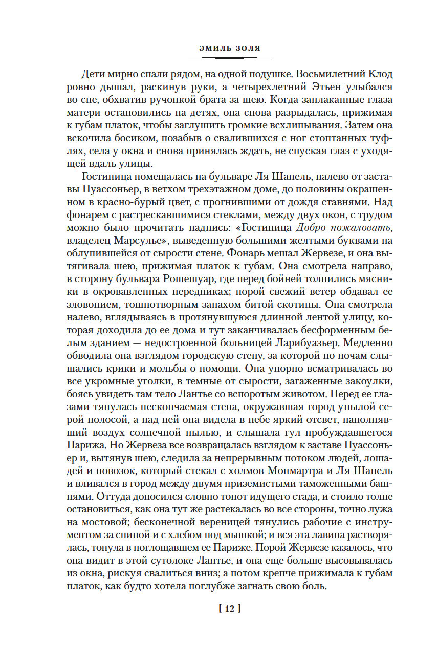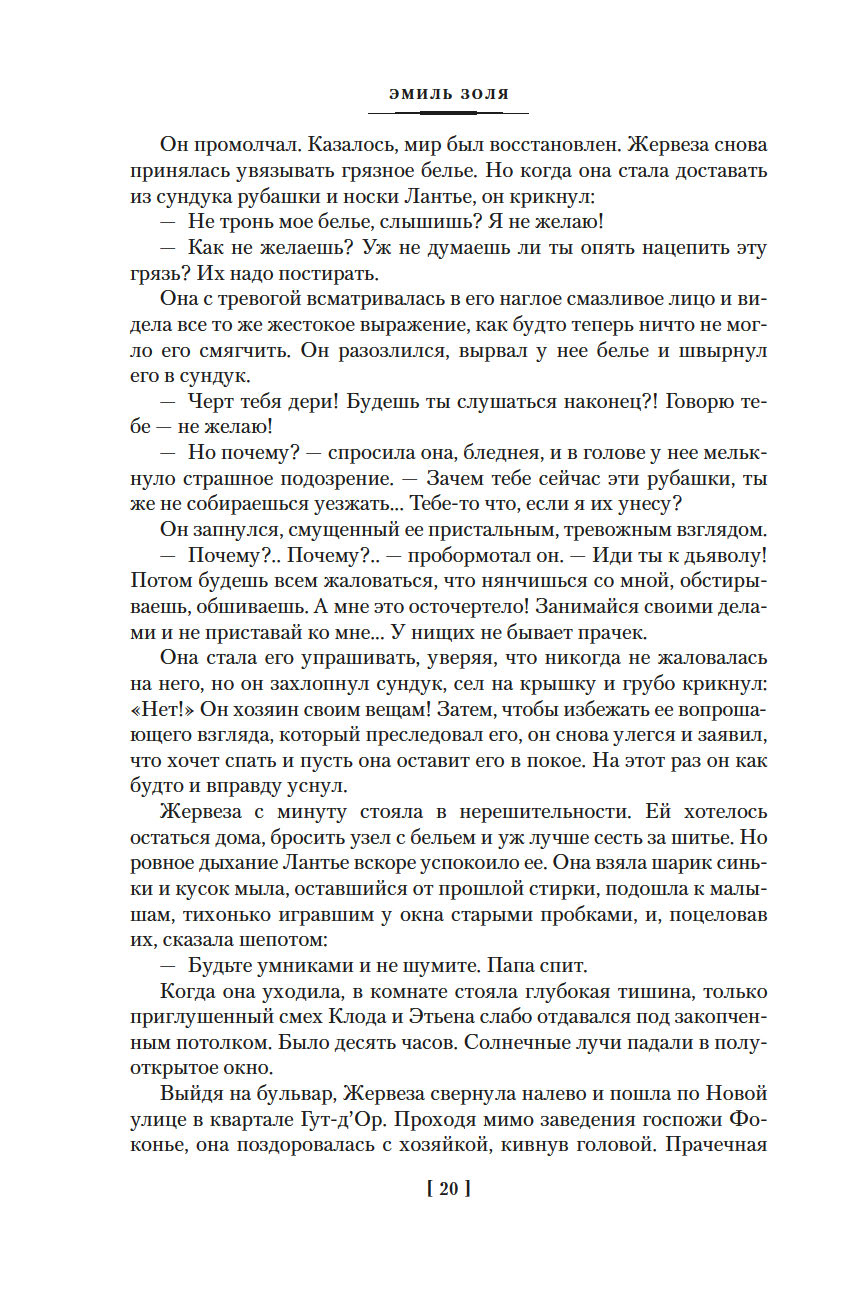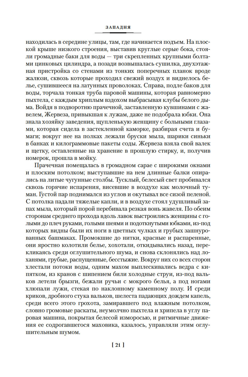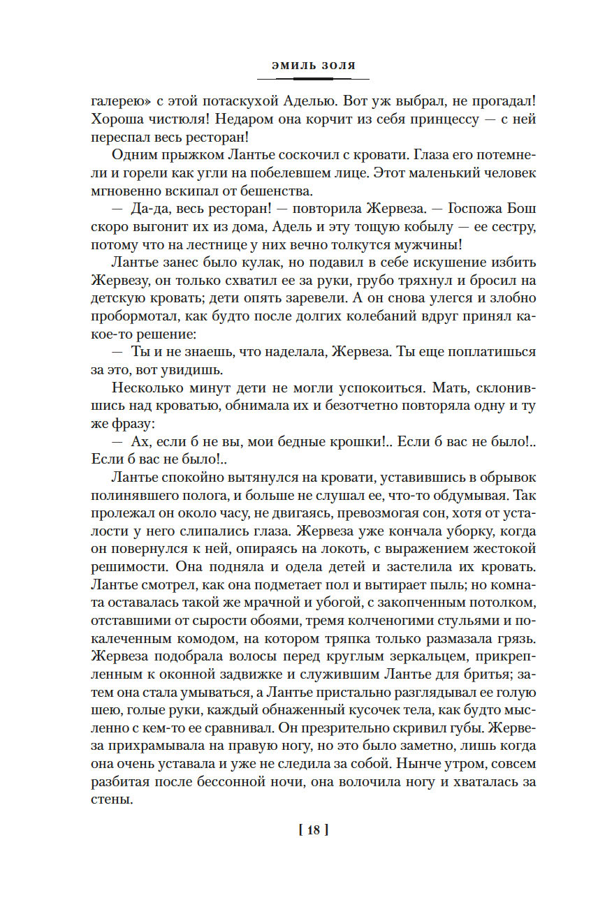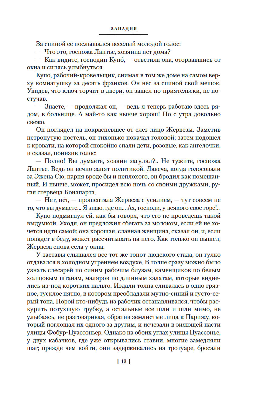 Роман "Западня", впервые опубликованный в 1876 году, шокировал современников писателя. В бедном квартале, вдали от глаз преуспевающей и благоденствующей верхушки общества Второй империи, жизнь – это борьба за существование, обеспечить которое можно лишь ежедневным, изнурительным трудом. И каждый из живущих здесь постоянно ходит по краю демонической ловушки, которая поглощает судьбы простых парижан, лишает их человеческого облика и человеческих стремлений...