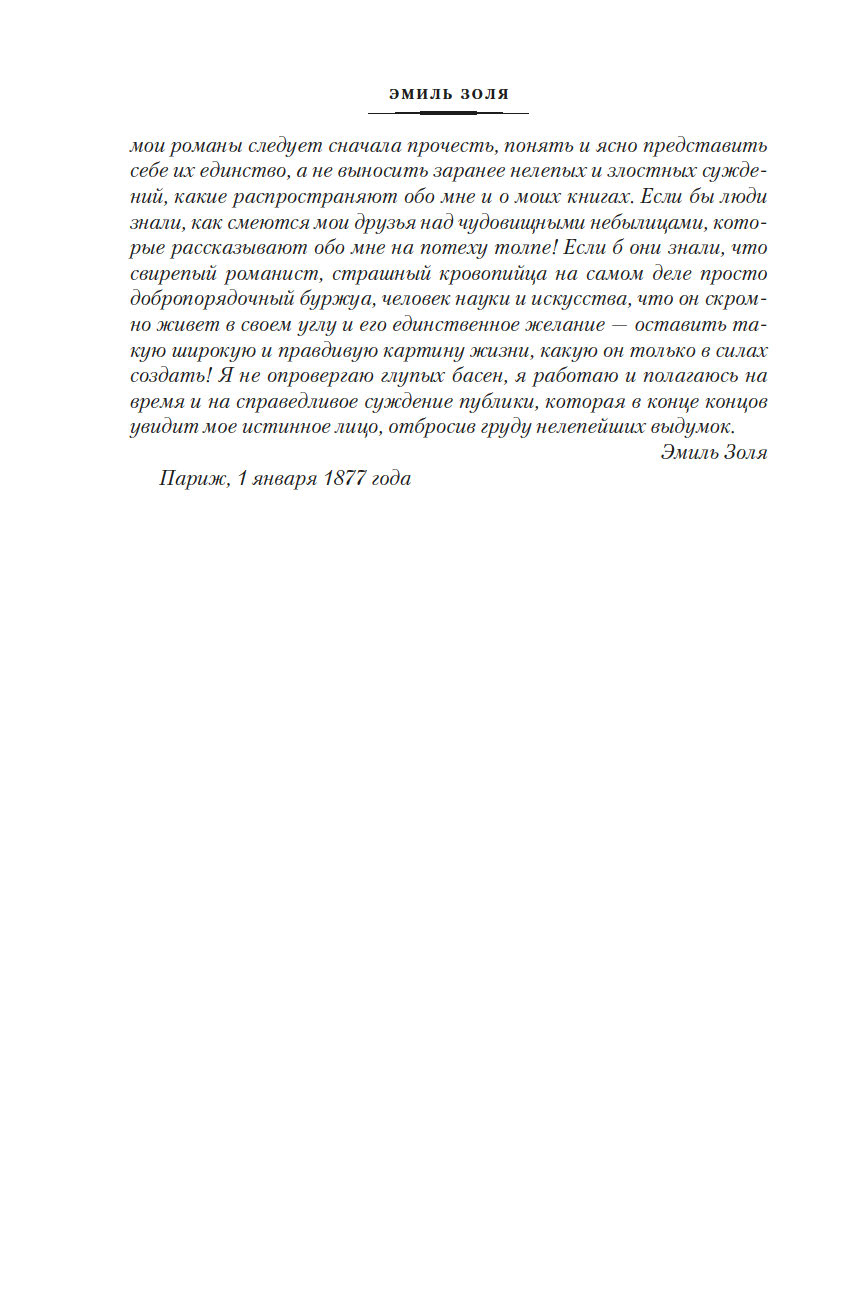 Эмиль Золя – один из столпов мировой реалистической литературы, основоположник и теоретик натурализма, увлеченный исследователь повседневности, страстный правозащитник и публицист, повлиявший на все реалистическое направление литературы XX века. Его самый известный труд – эпохальный двадцатитомный цикл "Ругон-Маккары", раскрывающий перед читателем бесконечную панораму человеческих пороков и добродетелей в декорациях Второй империи. Это подлинная энциклопедия жизни Парижа и французской провинции на примере нескольких поколений одной семьи, родившей самые странные плоды.