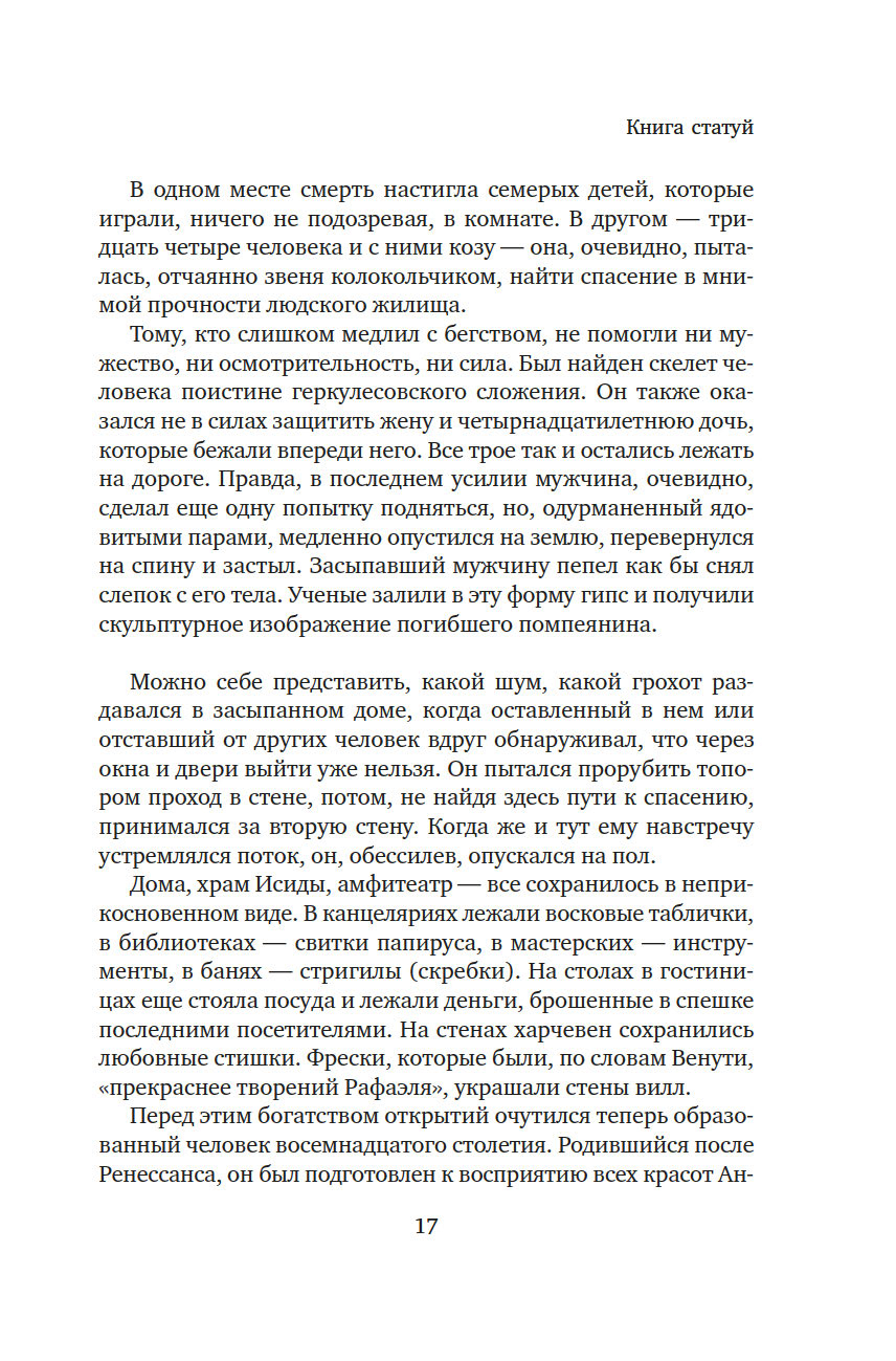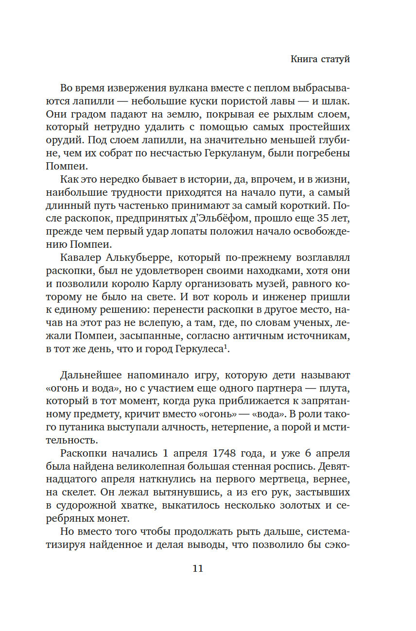 Книга делится на четыре части. "Книга статуй" рассказывает о зарождении археологии в связи с раскопками Помпеев, открытии Трои и Микен, подтвердившем гипотезу Генриха Шлимана о том, что "Илиада" Гомера является достоверным историческим источником. Следующие части посвящены раскрытию тайн древних цивилизаций Египта ("Книга пирамид"), Месопотамии ("Книга башен") и Мезоамерики ("Книга ступеней").