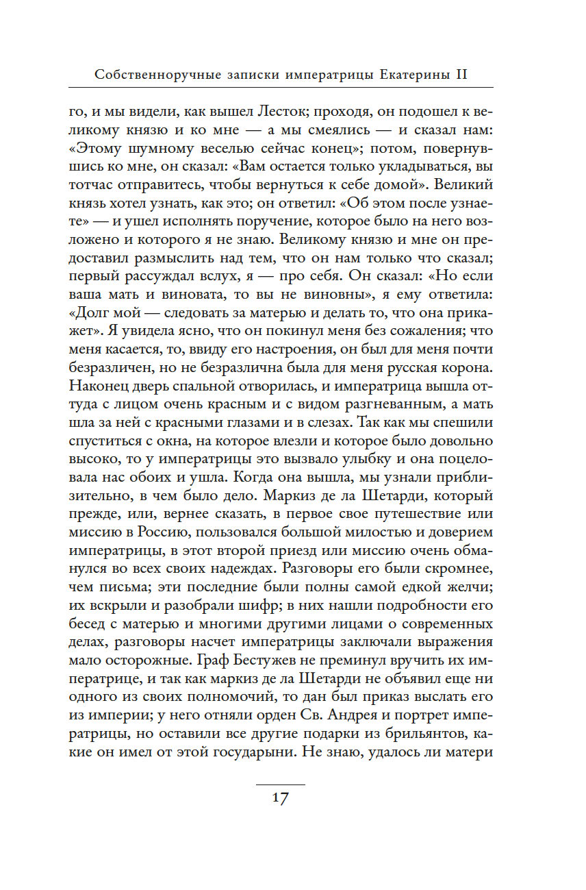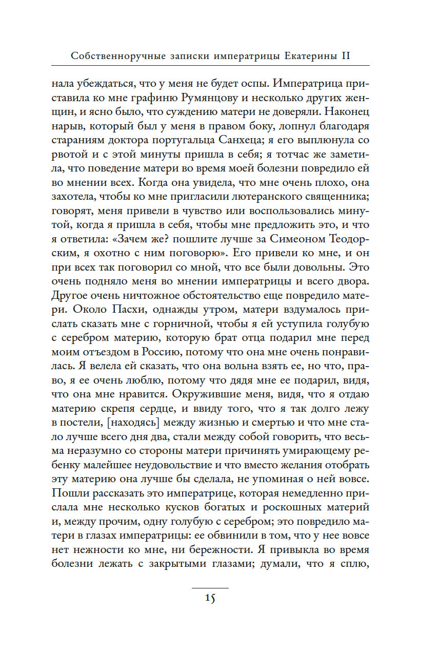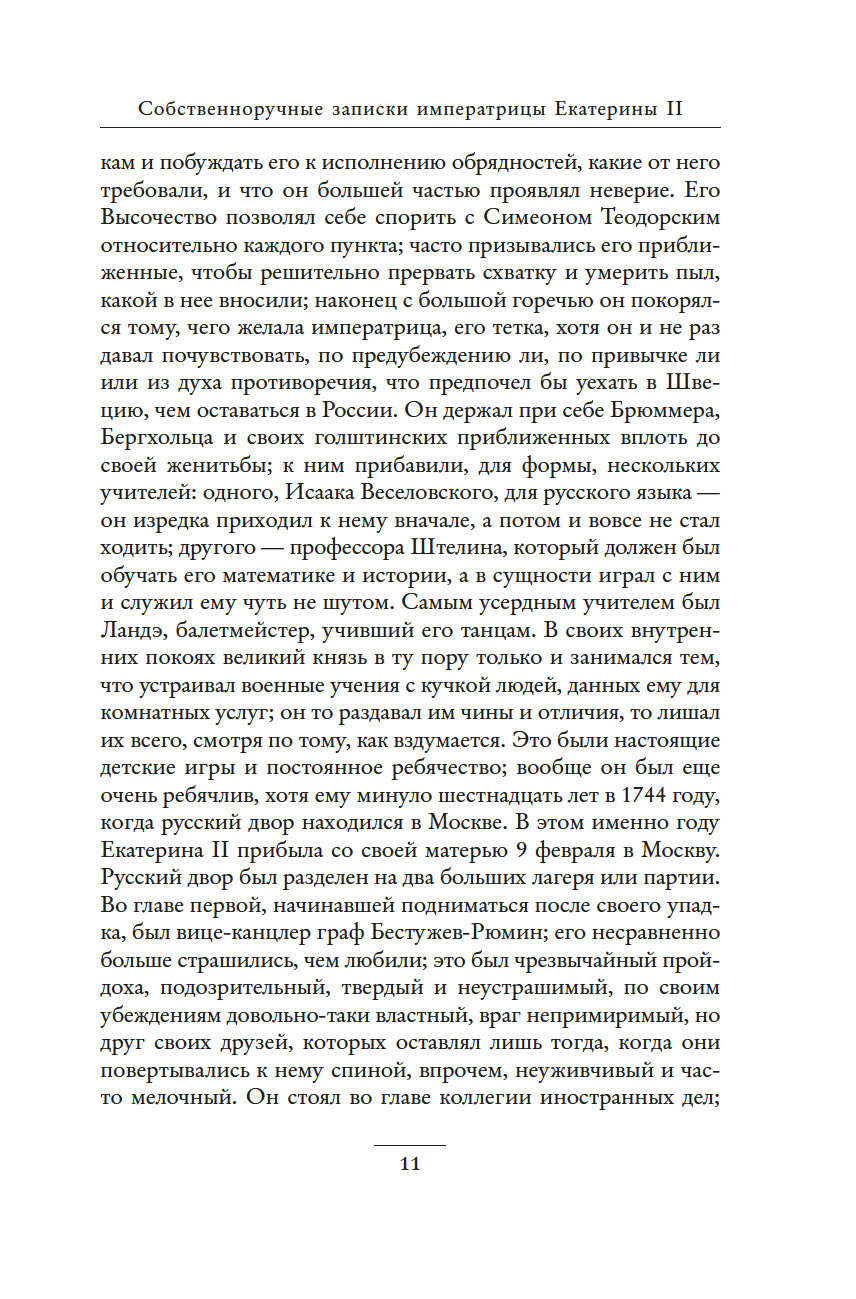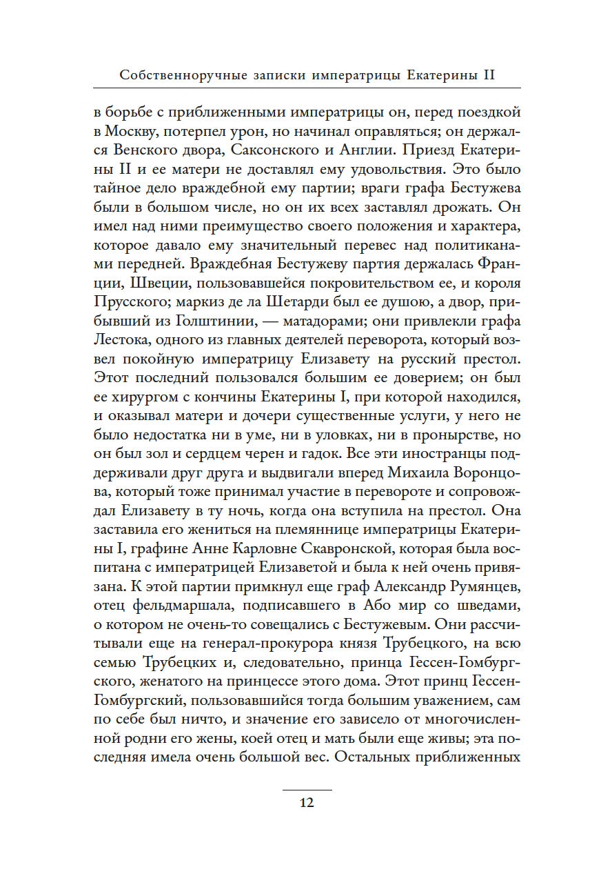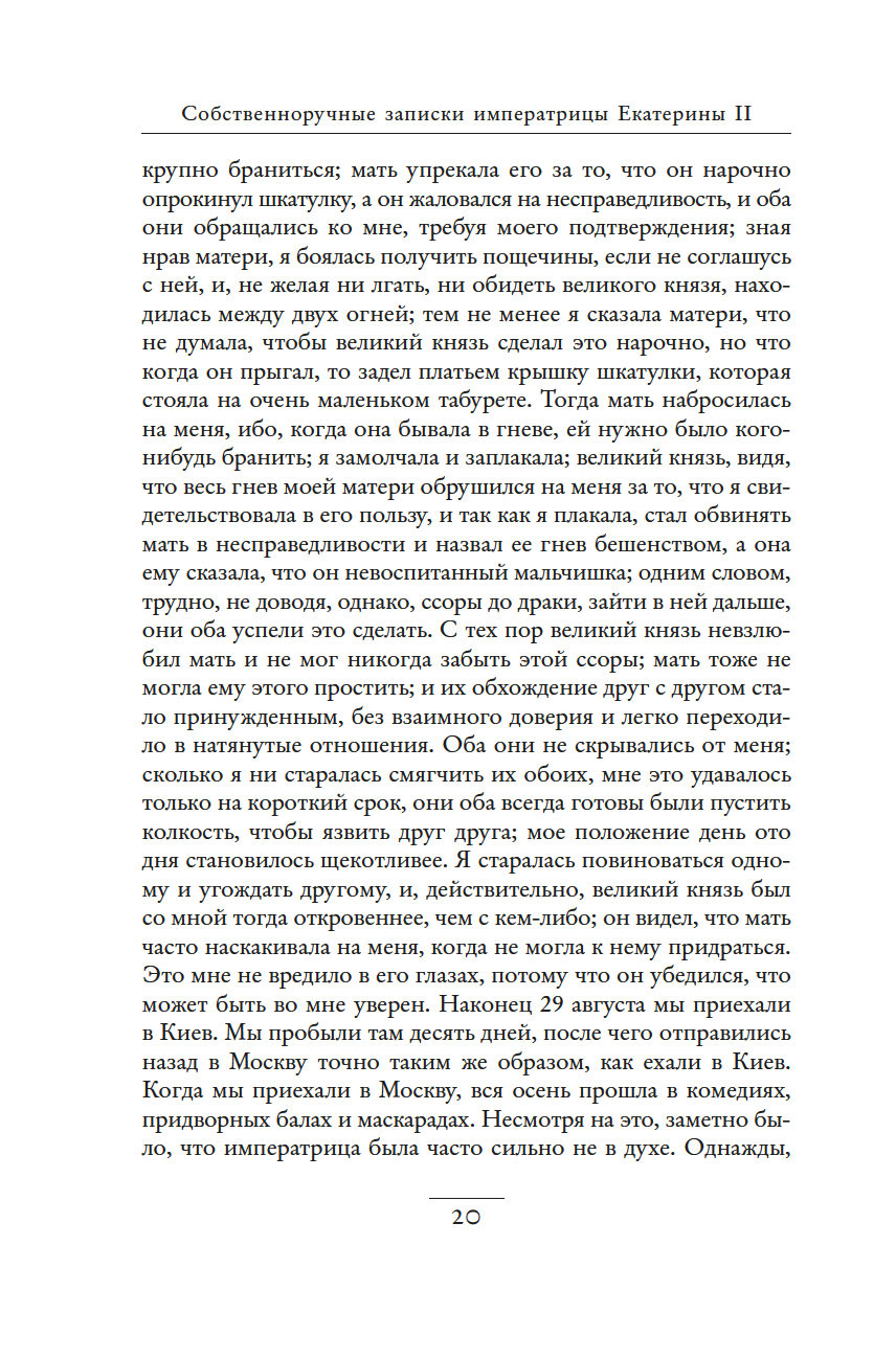 Незаурядный литературный дар императрицы Екатерины II принес обильные плоды. Управляя огромной страной, она также вела переписку с великими мыслителями, делала переводы, создавала либретто опер и балетов, писала басни, сказки, исторические пьесы и комедии, эссе, публиковала сатирические и полемические статьи. "Собственноручные записки императрицы Екатерины II" – это и мастерски исполненный автопортрет, и повествование, имеющее огромное историко-литературное значение. Колоритные зарисовки жизни двора, интриг и заговоров дают читателю возможность ощутить водоворот событий и кипение страстей, предшествовавших восшествию Екатерины на русский престол.