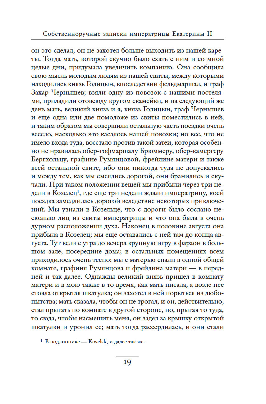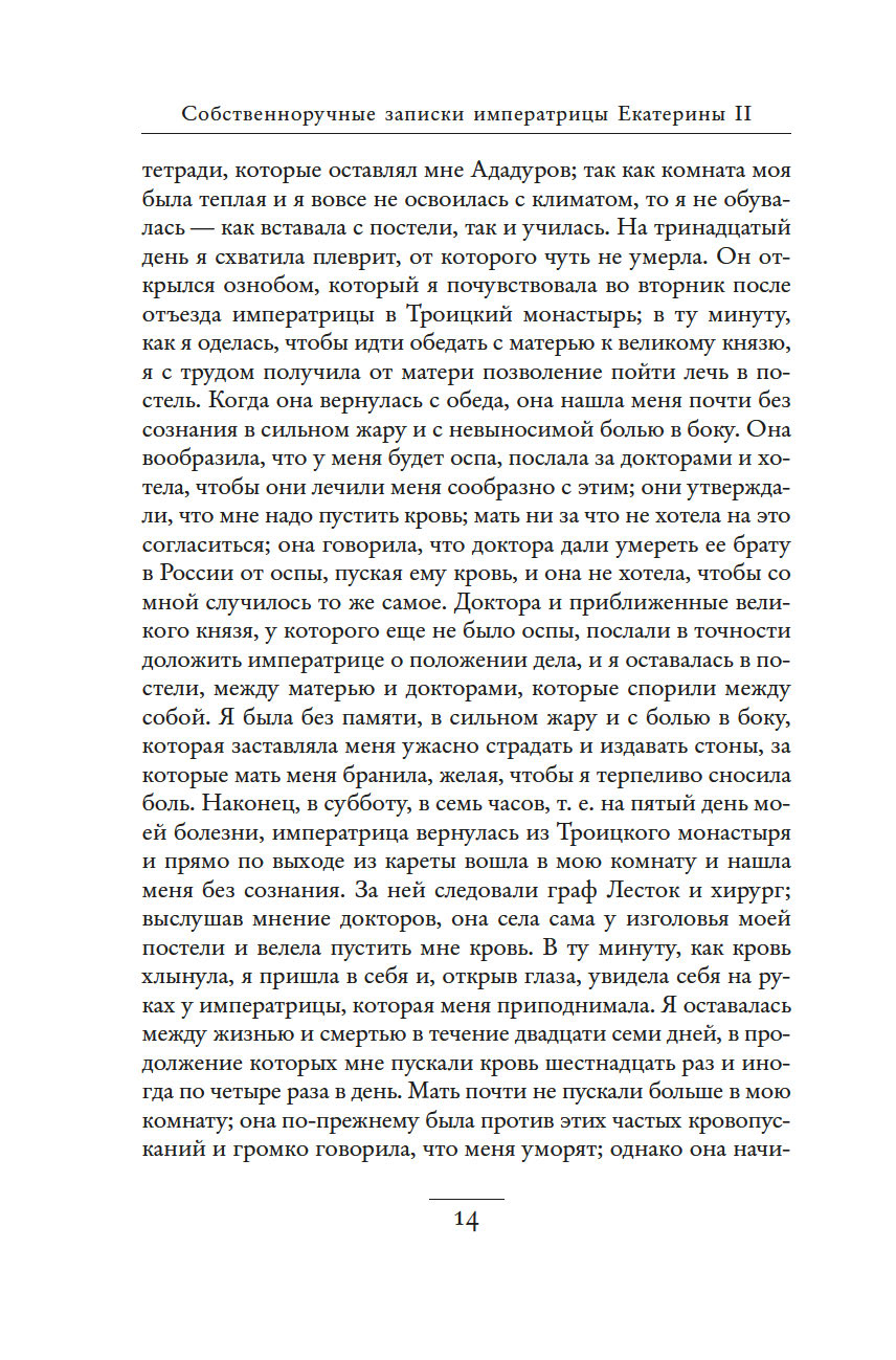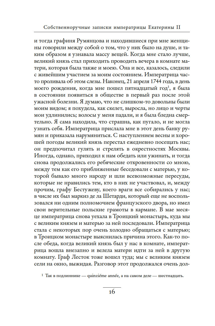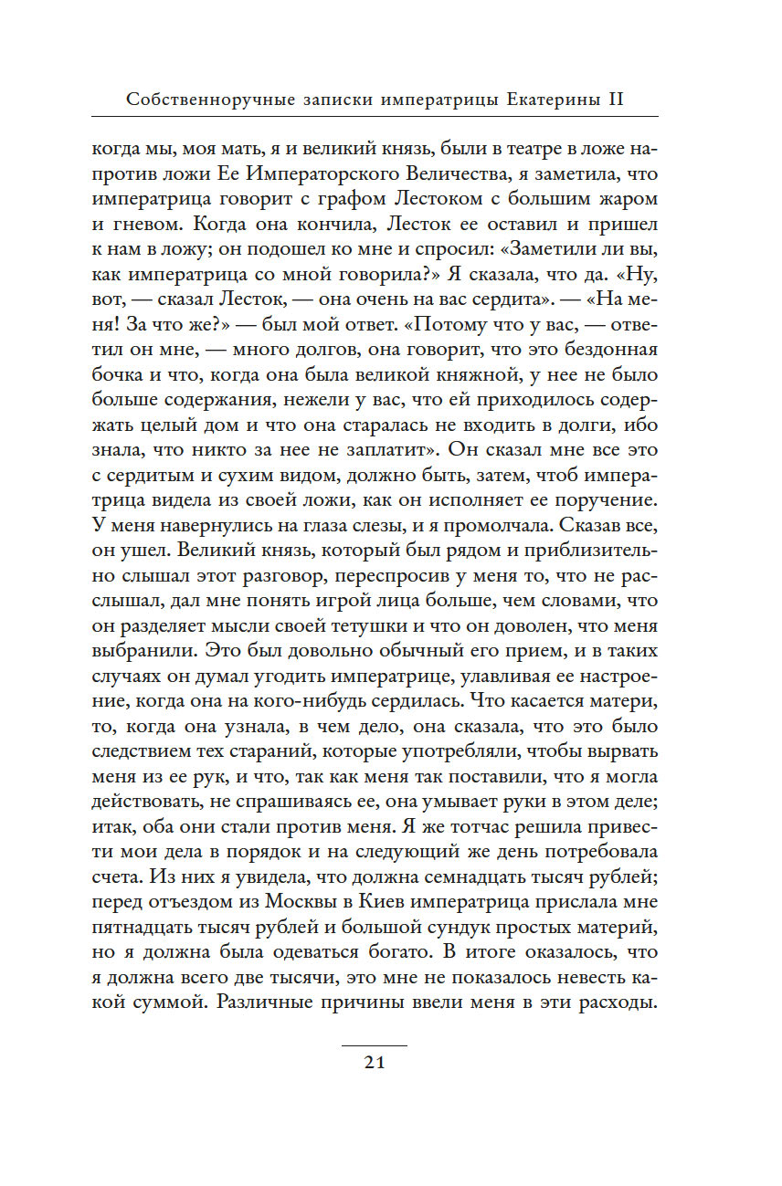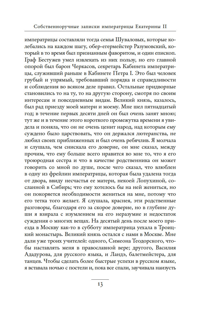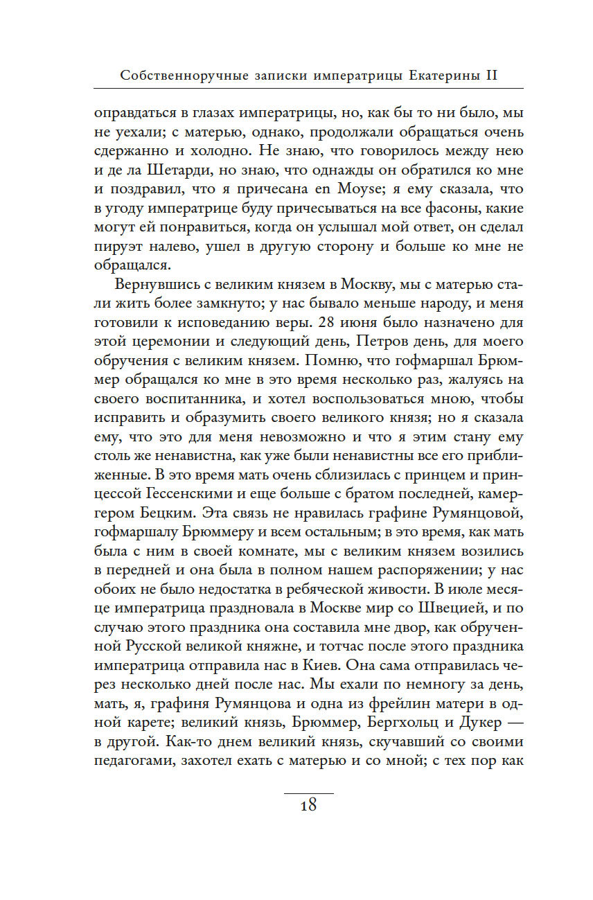 Незаурядный литературный дар императрицы Екатерины II принес обильные плоды. Управляя огромной страной, она также вела переписку с великими мыслителями, делала переводы, создавала либретто опер и балетов, писала басни, сказки, исторические пьесы и комедии, эссе, публиковала сатирические и полемические статьи. "Собственноручные записки императрицы Екатерины II" – это и мастерски исполненный автопортрет, и повествование, имеющее огромное историко-литературное значение. Колоритные зарисовки жизни двора, интриг и заговоров дают читателю возможность ощутить водоворот событий и кипение страстей, предшествовавших восшествию Екатерины на русский престол.