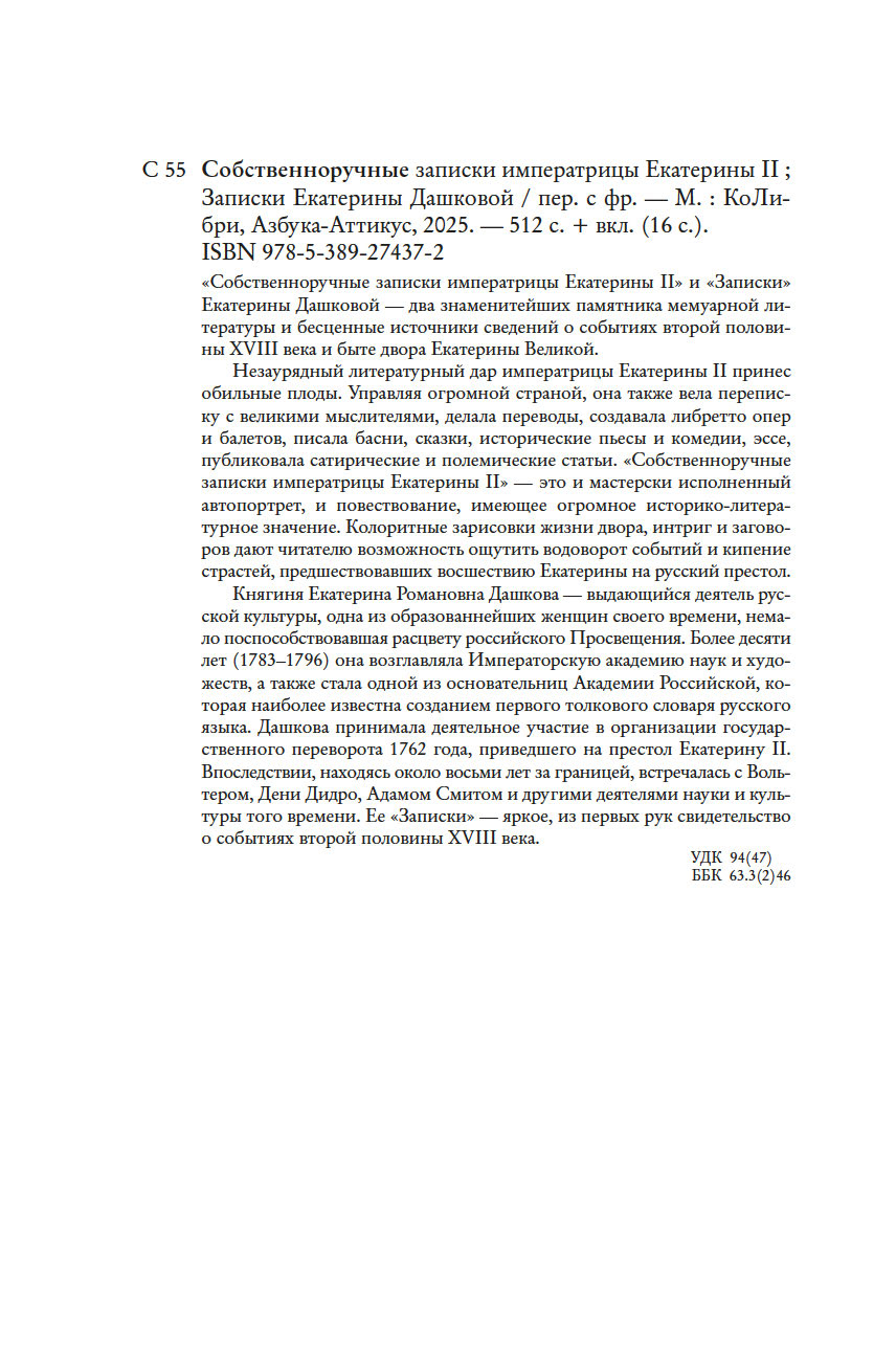 "Собственноручные записки императрицы Екатерины II" и "Записки" Екатерины Дашковой – два знаменитейших памятника мемуарной литературы и бесценные источники сведений о событиях второй половины XVIII века и быте двора Екатерины Великой.