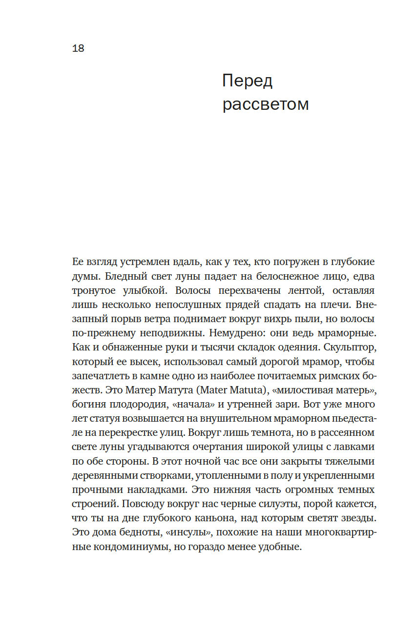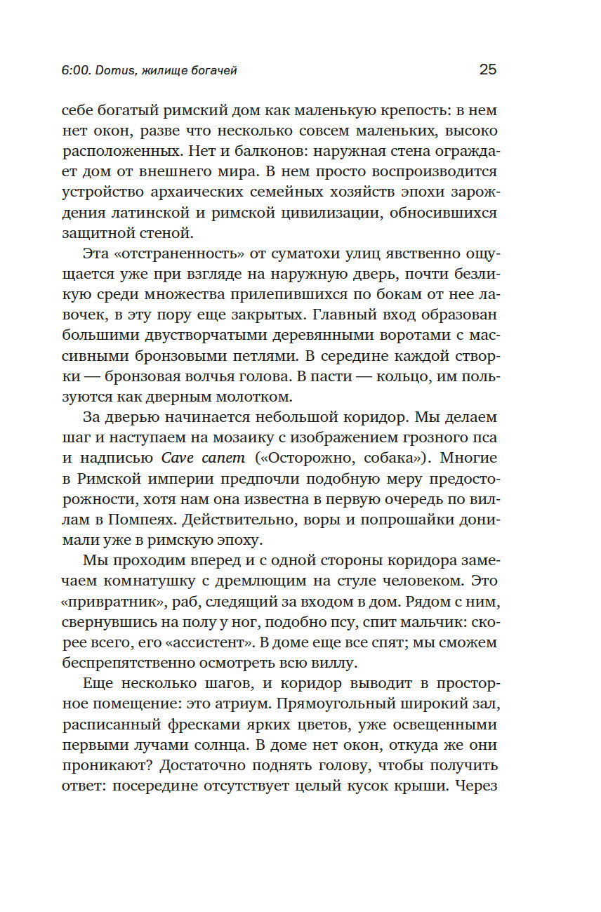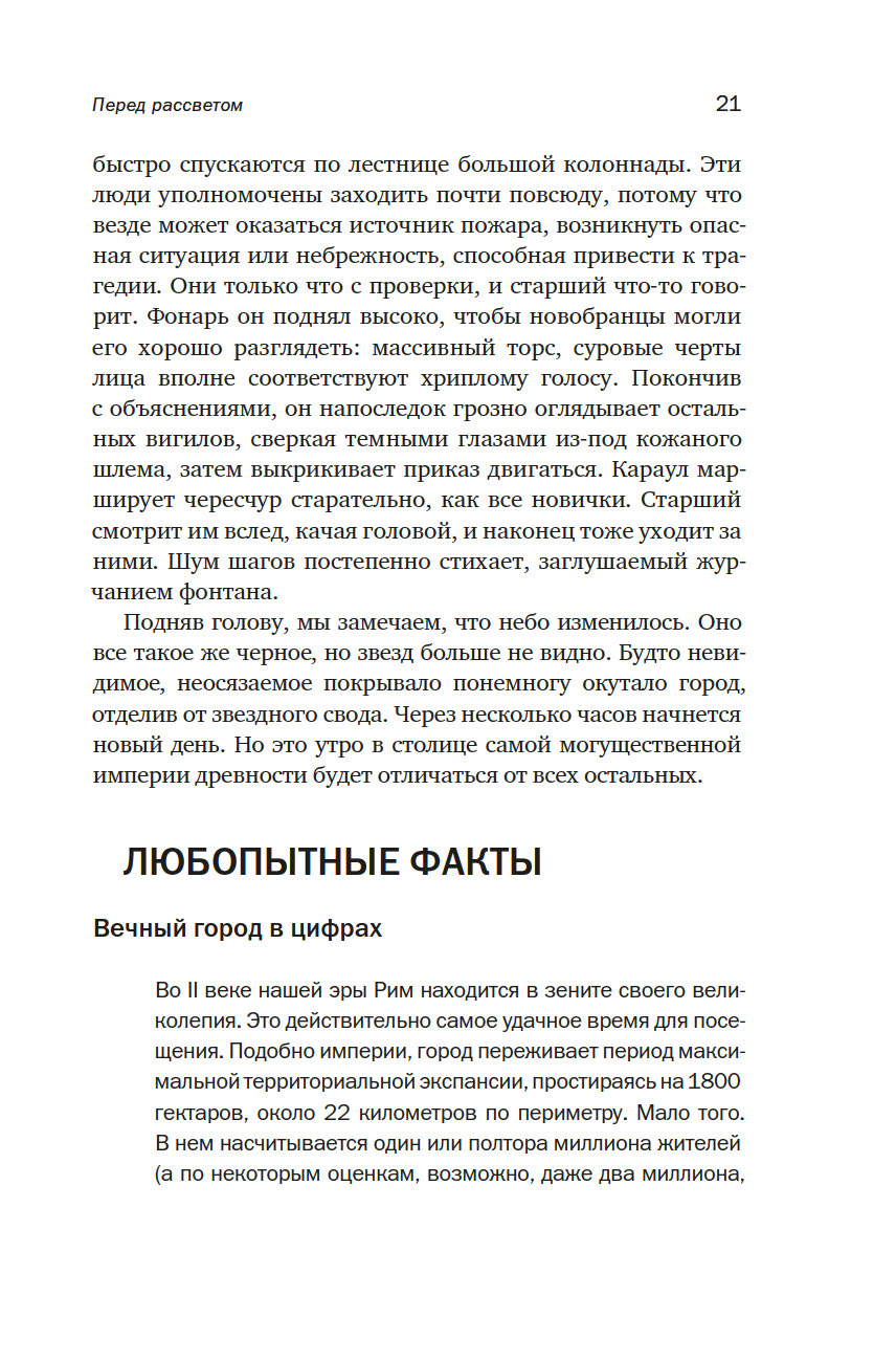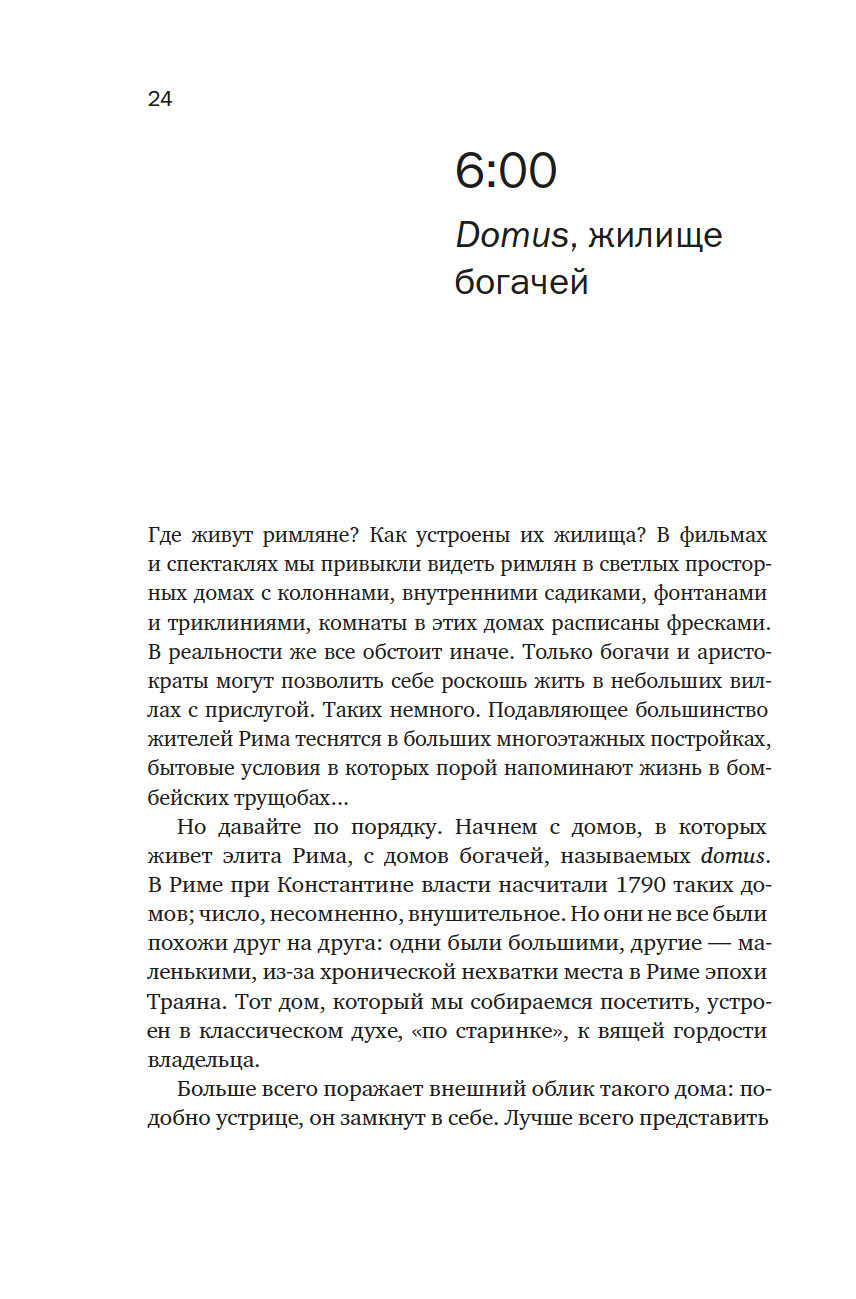 Древний Рим времен расцвета империи похож на современный мегаполис гораздо больше, чем мы могли бы подумать. Полтора миллиона его жителей сталкивались с теми же проблемами, что и их наследники две тысячи лет спустя: дороговизна жилья и дорожные пробки, наплыв иммигрантов и необходимость "подмазывать" городских чиновников... Автор предлагает нам "накрыться шапкой-невидимкой" и провести в Риме целый день, от рассвета до заката, в 115 году нашей эры: потолкаться на людной улице и заглянуть в Колизей, посетить судебное слушание и роскошные термы, отведать изысканных блюд и насладиться беседой на званом ужине. И закончить день на любовном ложе – здесь тоже за две тысячи лет ничего не изменилось.