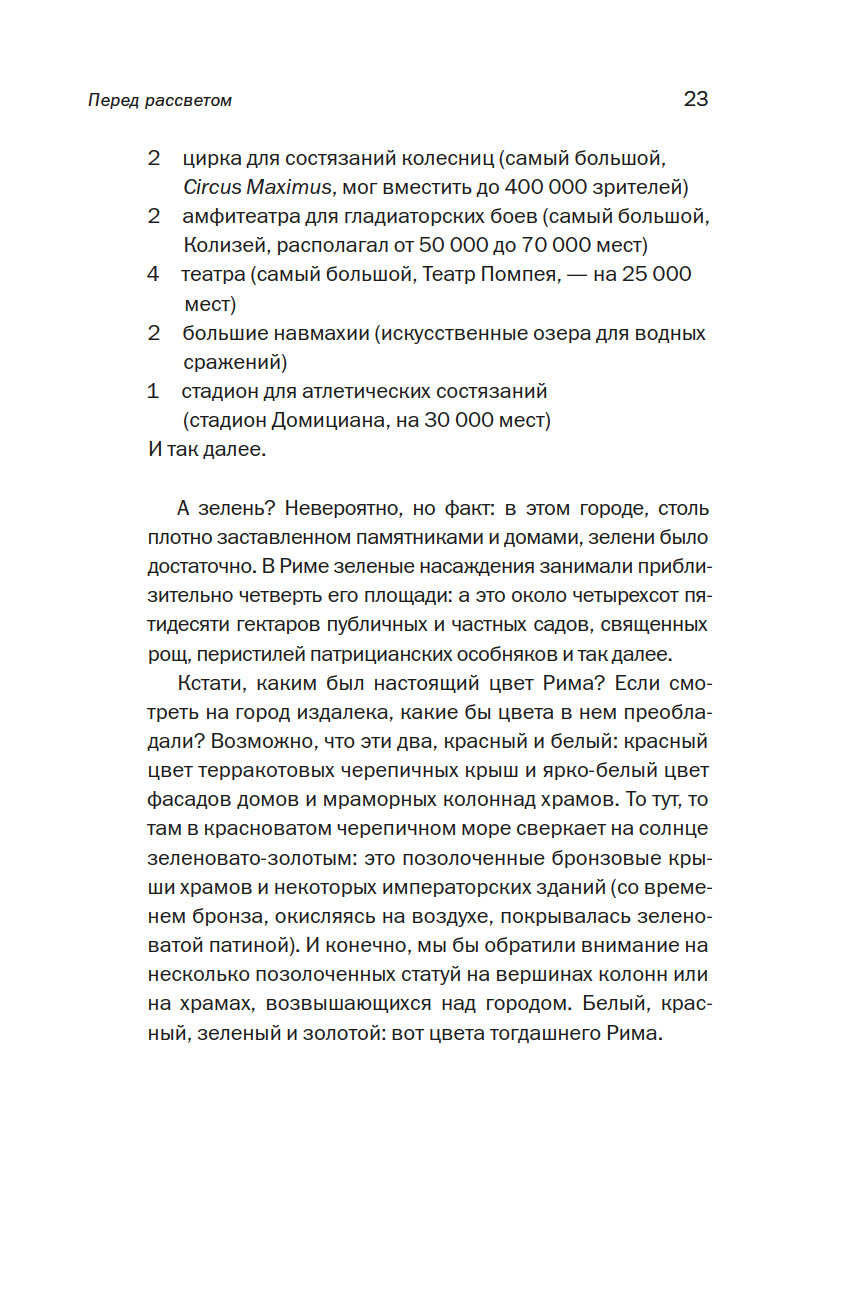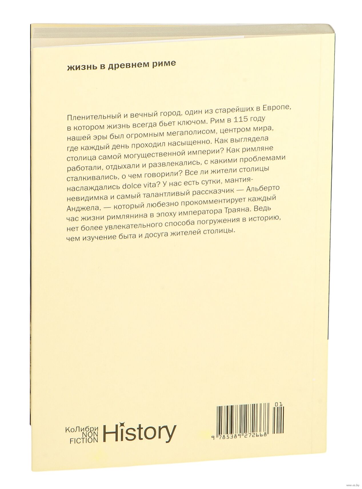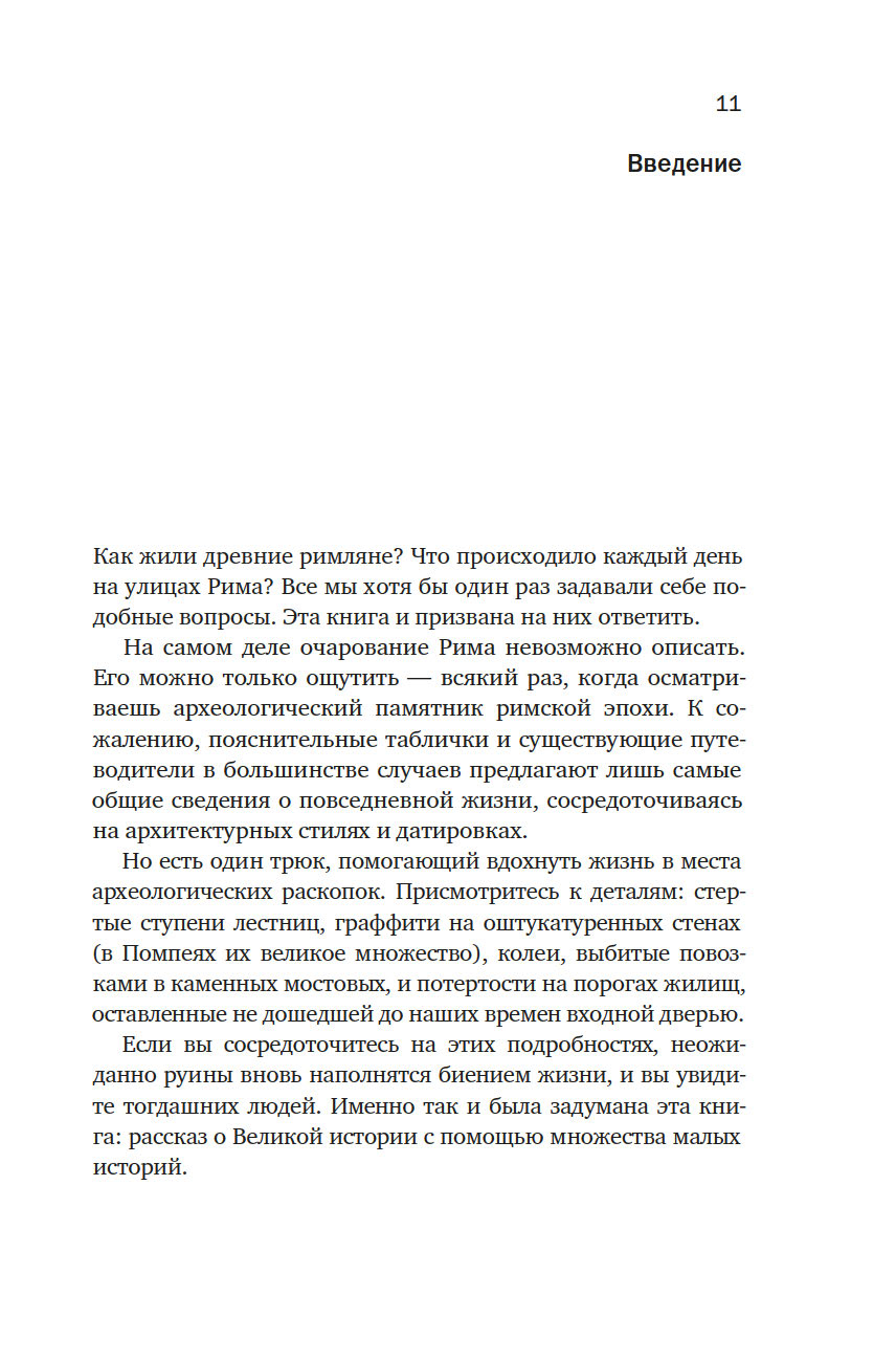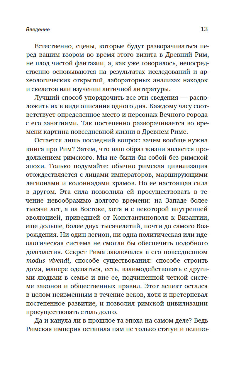 Древний Рим времен расцвета империи похож на современный мегаполис гораздо больше, чем мы могли бы подумать. Полтора миллиона его жителей сталкивались с теми же проблемами, что и их наследники две тысячи лет спустя: дороговизна жилья и дорожные пробки, наплыв иммигрантов и необходимость "подмазывать" городских чиновников... Автор предлагает нам "накрыться шапкой-невидимкой" и провести в Риме целый день, от рассвета до заката, в 115 году нашей эры: потолкаться на людной улице и заглянуть в Колизей, посетить судебное слушание и роскошные термы, отведать изысканных блюд и насладиться беседой на званом ужине. И закончить день на любовном ложе – здесь тоже за две тысячи лет ничего не изменилось.