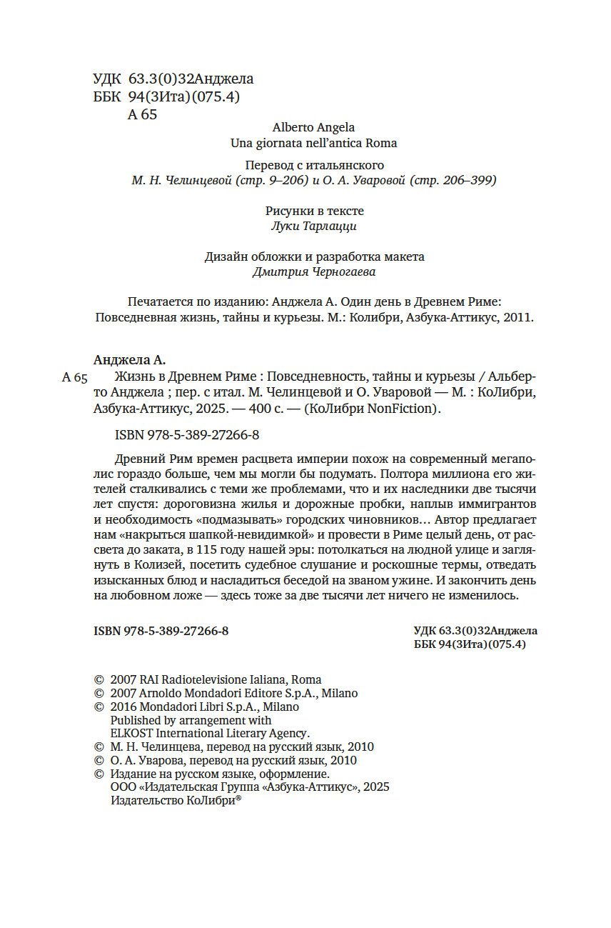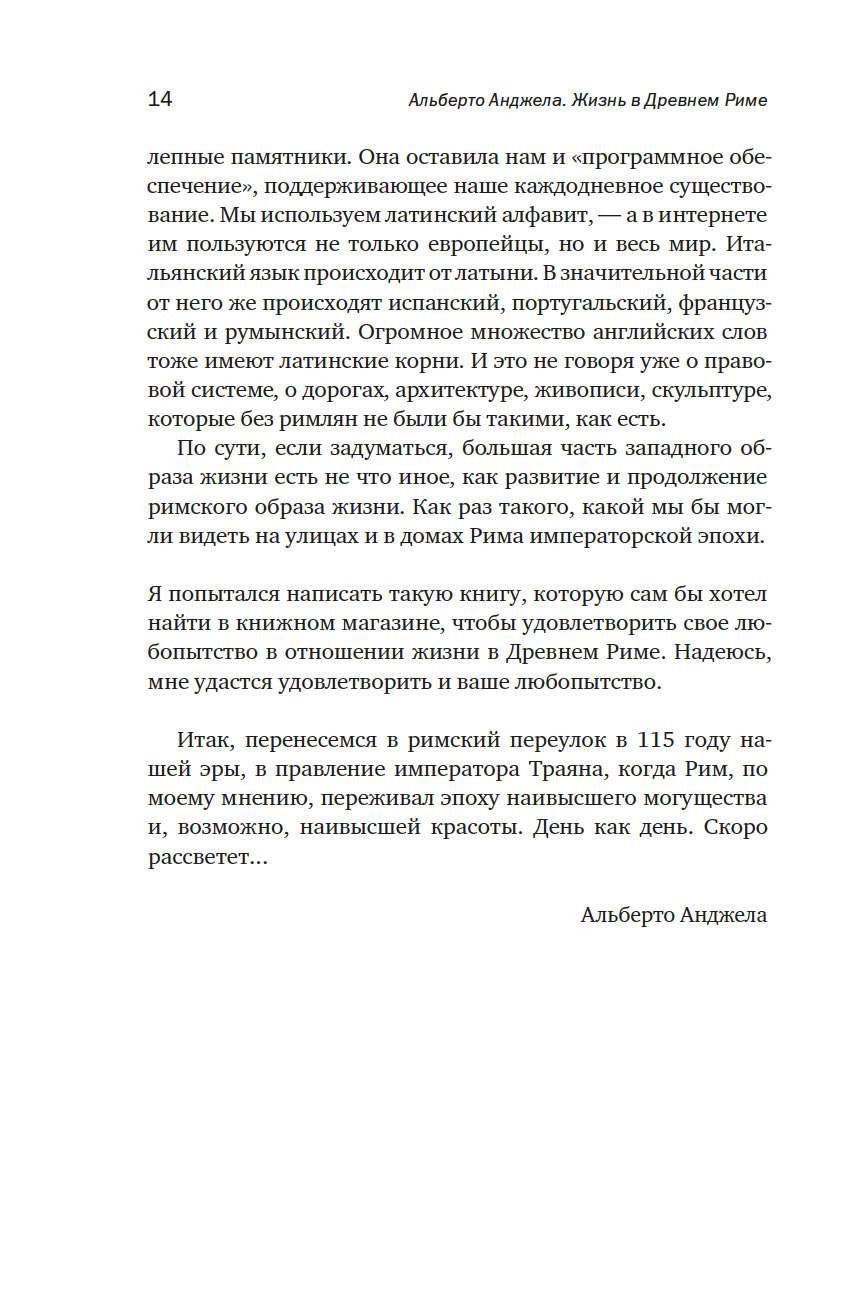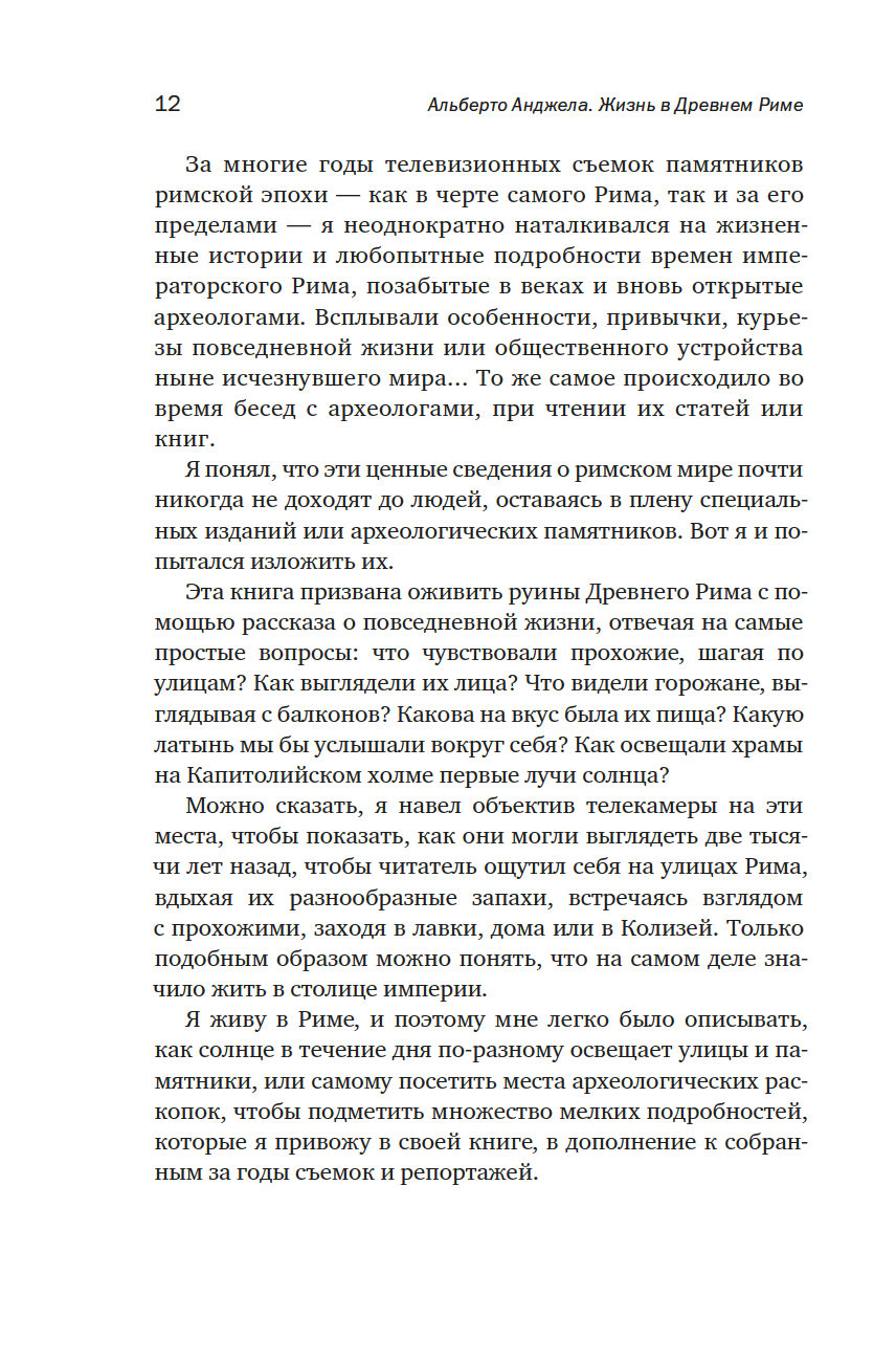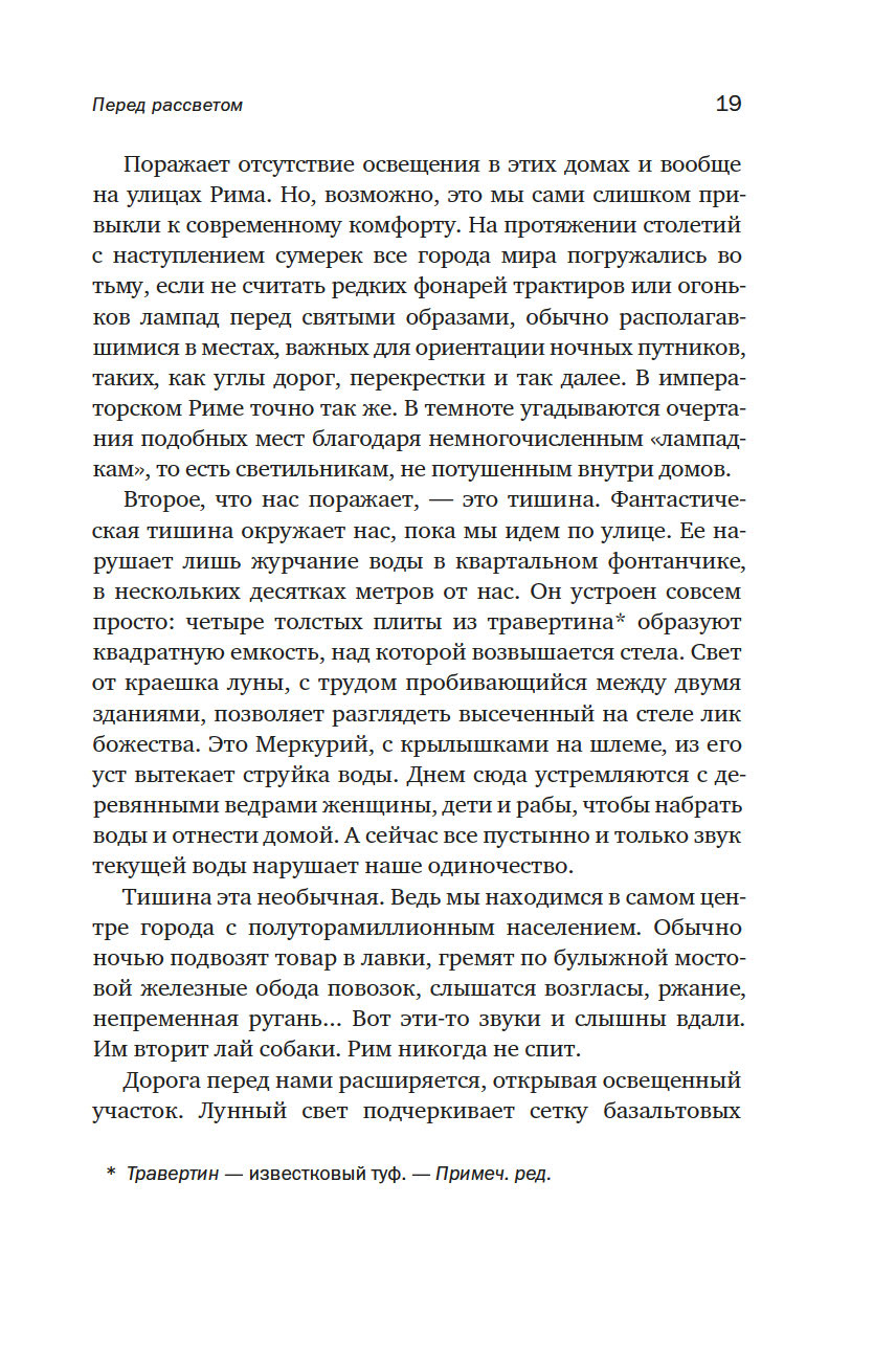 Древний Рим времен расцвета империи похож на современный мегаполис гораздо больше, чем мы могли бы подумать. Полтора миллиона его жителей сталкивались с теми же проблемами, что и их наследники две тысячи лет спустя: дороговизна жилья и дорожные пробки, наплыв иммигрантов и необходимость "подмазывать" городских чиновников... Автор предлагает нам "накрыться шапкой-невидимкой" и провести в Риме целый день, от рассвета до заката, в 115 году нашей эры: потолкаться на людной улице и заглянуть в Колизей, посетить судебное слушание и роскошные термы, отведать изысканных блюд и насладиться беседой на званом ужине. И закончить день на любовном ложе – здесь тоже за две тысячи лет ничего не изменилось.