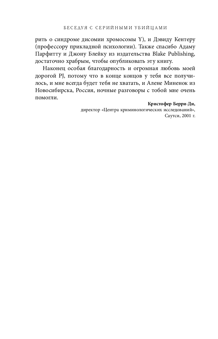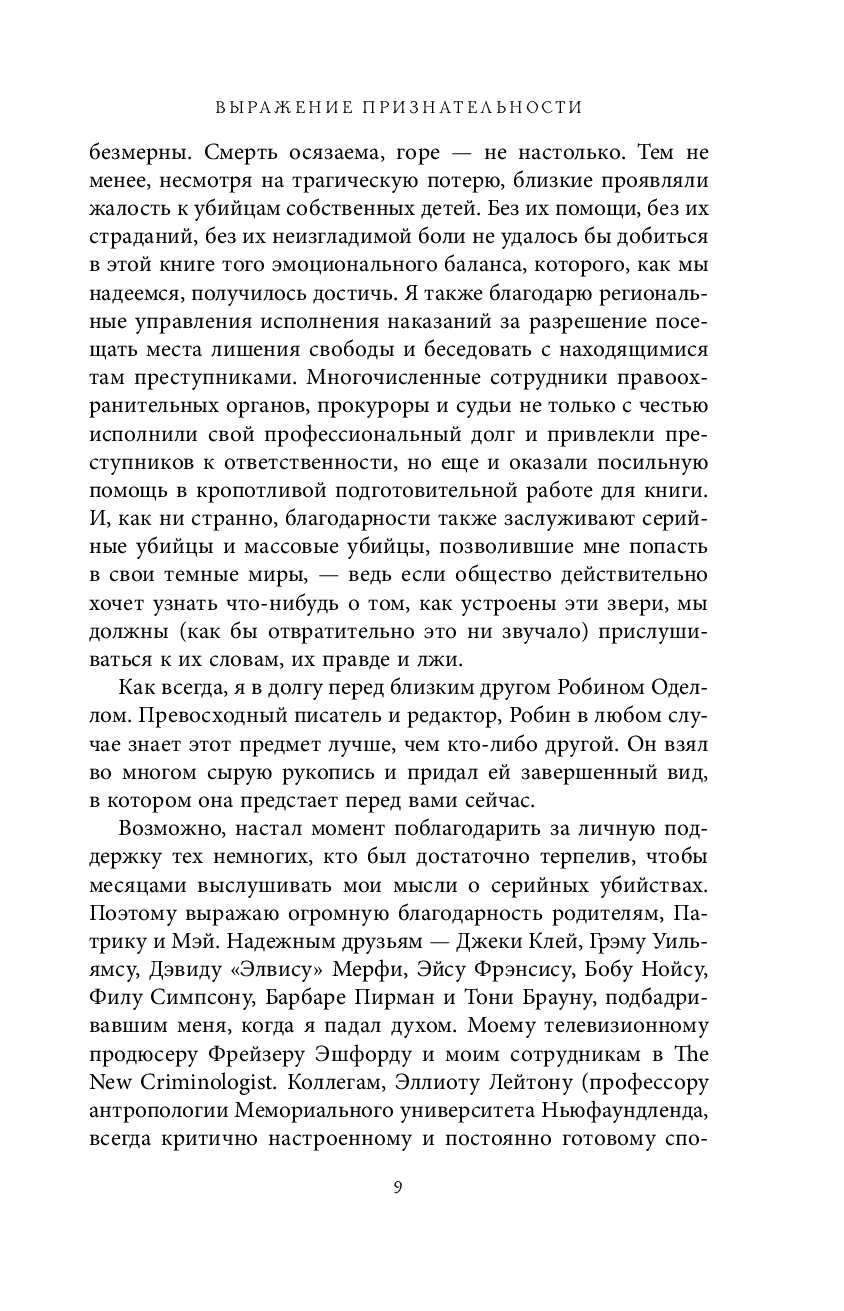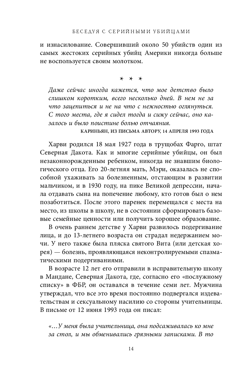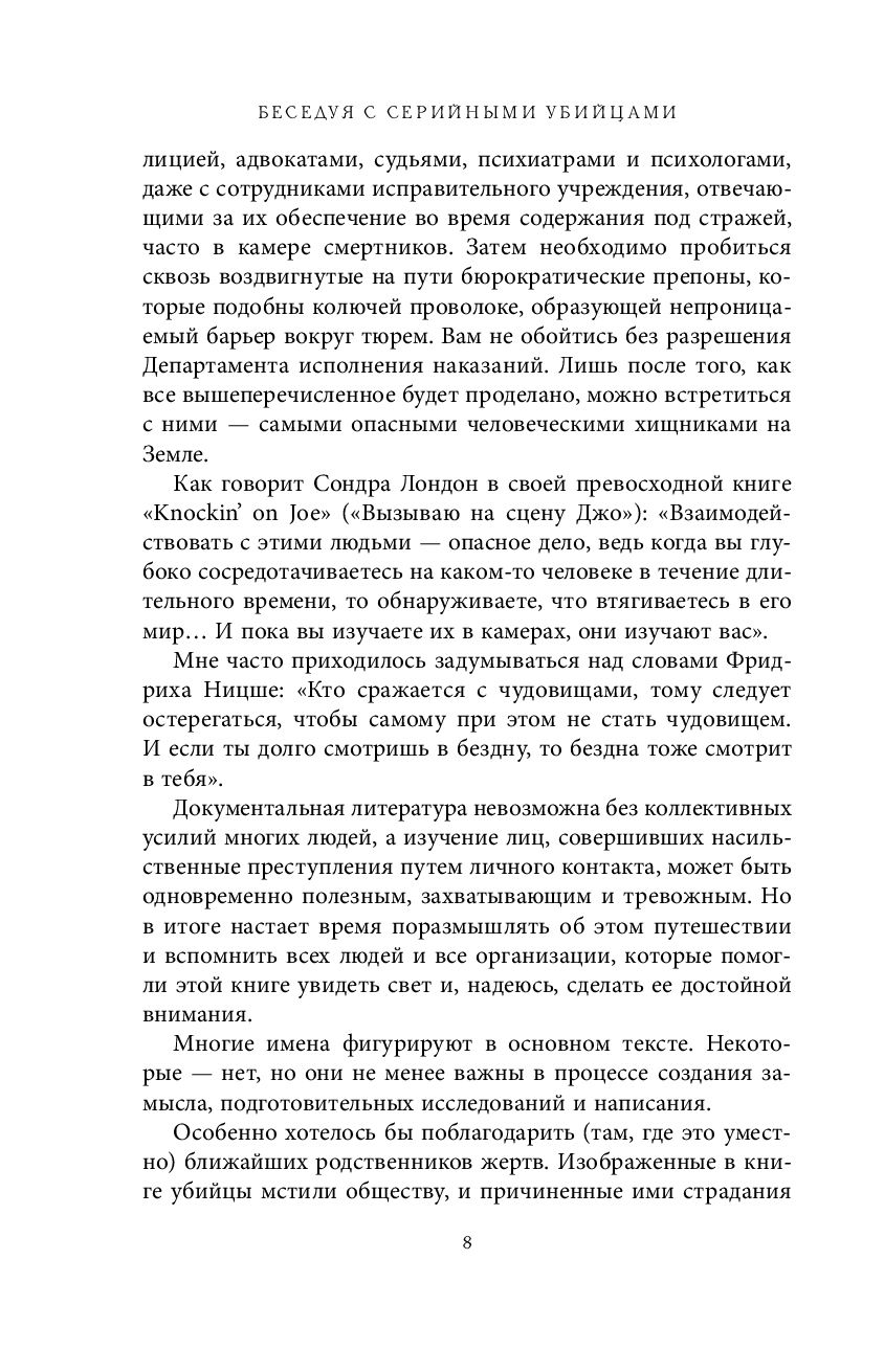 Для понимания мотивов их ужасных преступлений, автор подробно исследует биографии своих героев: встречается с родителями, родственниками, друзьями, школьными учителями, коллегами по работе, ближайшими родственниками жертв, полицией, адвокатами, судьями, психиатрами и психологами, сотрудниками исправительных учреждений, где они содержатся. "Беседуя с серийными убийцами" предлагает глубже погрузиться в мрачный разум преступников, чтобы понять, что ими движет.