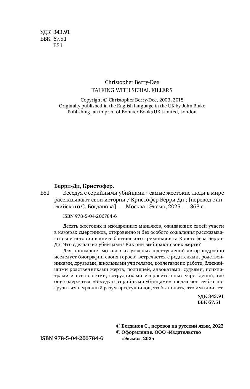10 жестоких и изощренных маньяков, ожидающих своей участи в камерах смертников, откровенно и без особого сожаления рассказывают свои истории в книге британского криминалиста Кристофера Берри-Ди. Что сделало их убийцами? Как они выбирают своих жертв?