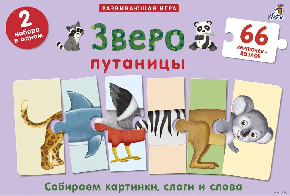 "Развивающая игра "Зверопутаницы" состоит из двух наборов: "Зверопутаница" и "Зоозверопутаница"" в подарочном оформлении. Из 66 двусторонних карточек-пазлов ребёнок сможет складывать изображения машин и различной техники. В игре используется и лицевая, и оборотная стороны карточек.