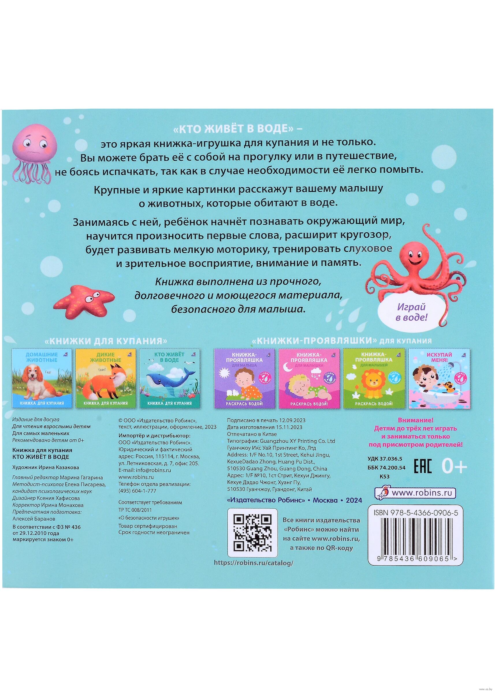 "Кто живёт в воде" – это яркая книжка-игрушка для купания и не только. Вы можете брать её с собой на прогулку или в путешествие, не боясь испачкать, так как в случае необходимости её легко помыть.