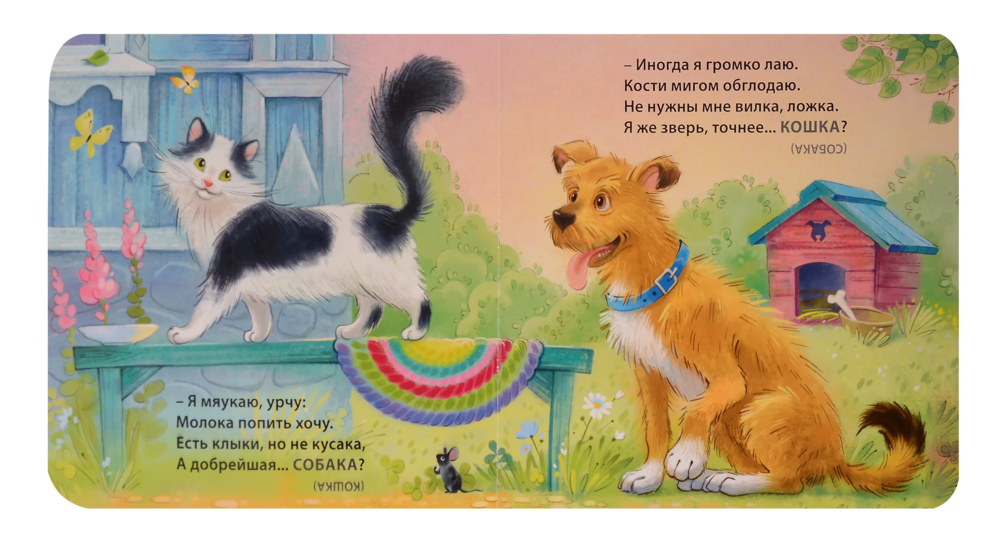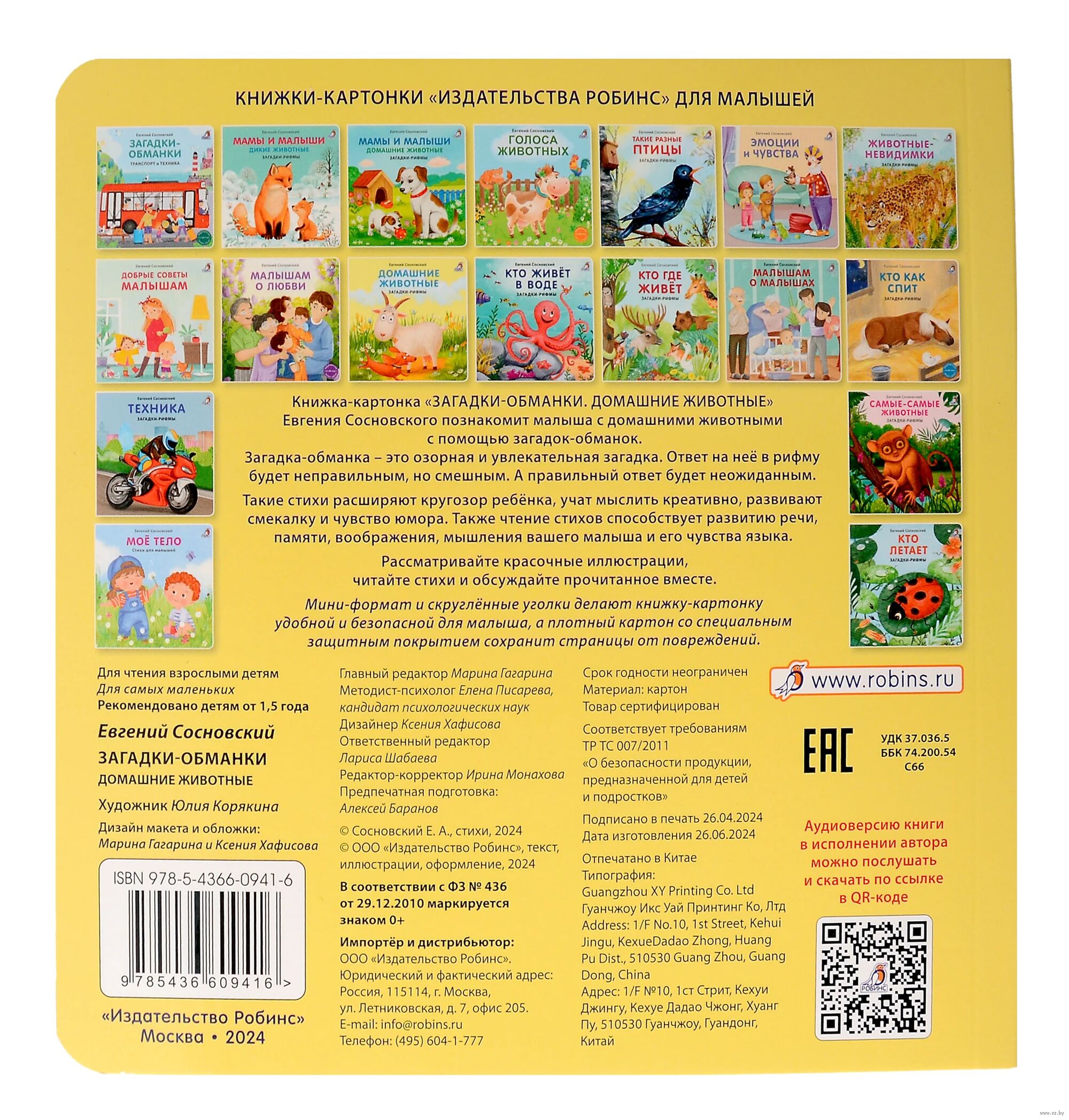 Книжка-картонка "Загадки-обманки. Домашние животные" Евгения Сосновского познакомит малыша с домашними животными с помощью загадок-обманок.