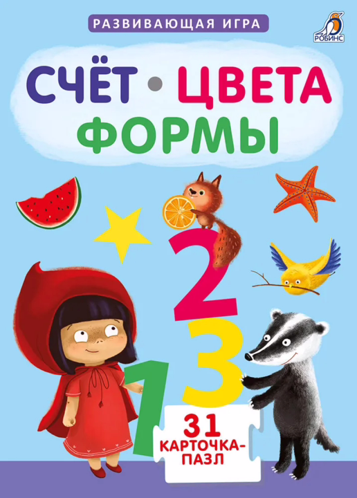 "Счет, цвета, формы" – это обучающая и развивающая игра из 31 двусторонней карточки-пазла и 2 карточек с инструкцией. С ее помощью ваш ребёнок легко и быстро выучит цифры, цвета и формы, а также научится сравнивать, считать и придумывать загадки.