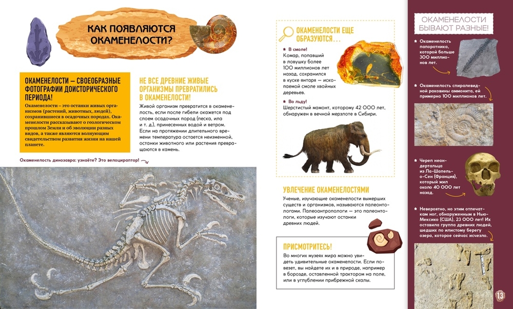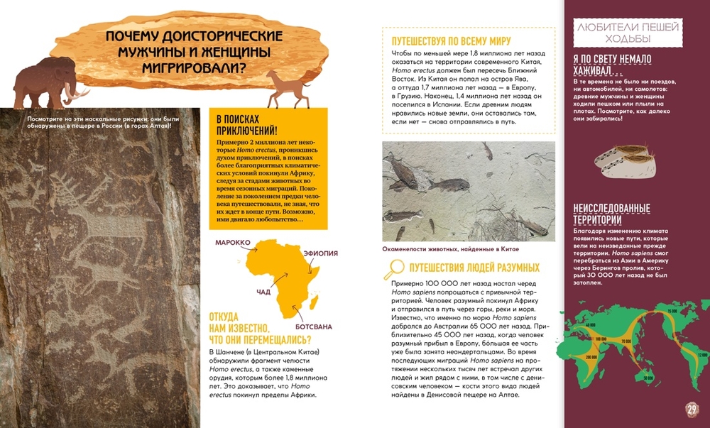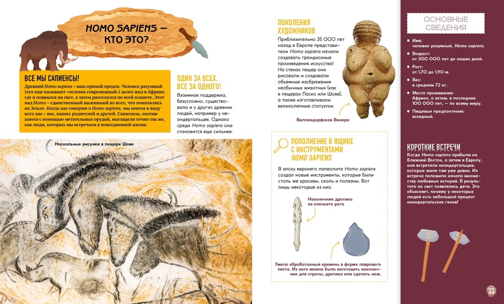 На страницах этой книги вы найдете множество фактов о быте первых людей, развитии письменности и эволюции животных. В энциклопедии представлены археологические находки из разных уголков мира, которые свидетельствуют о жизни многих поколений австралопитеков, неандертальцев, человека умелого и человека разумного. Вы узнаете, как были устроены первобытные школы, какие украшения изготавливали первые люди и как создавались дошедшие до нас скульптуры и рисунки доисторического периода.
