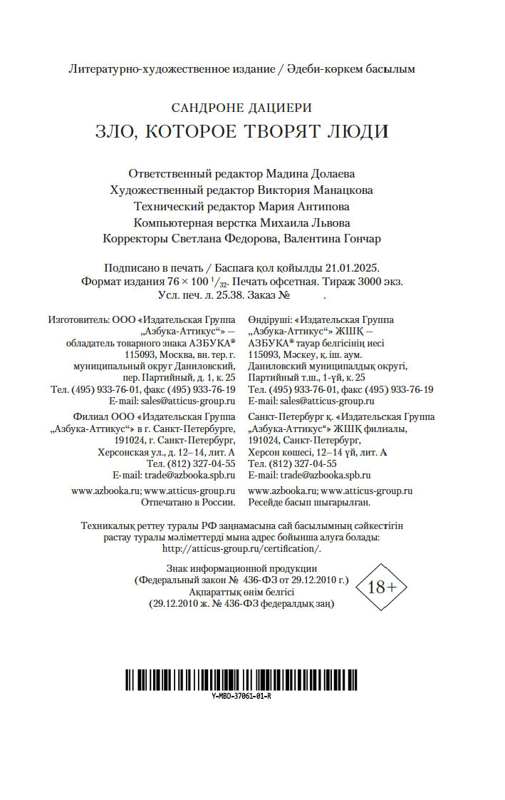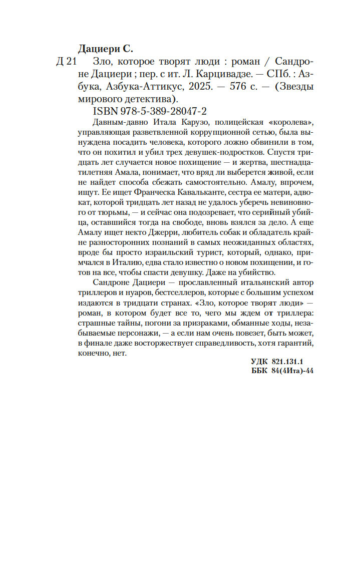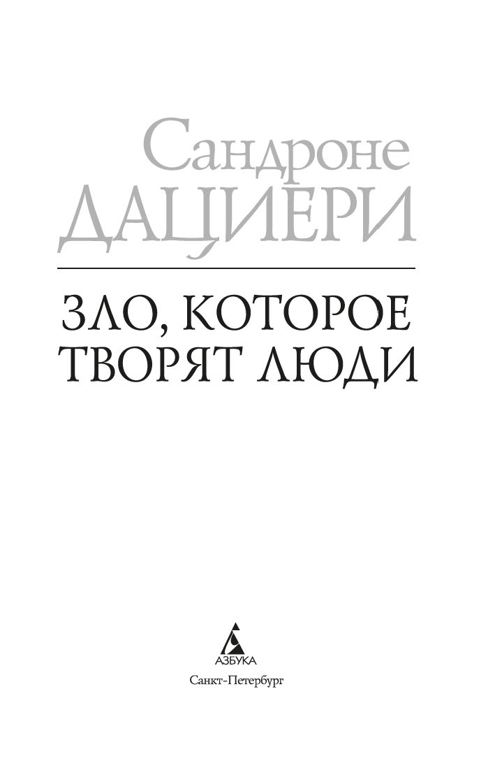 Сандроне Дациери – прославленный итальянский автор триллеров и нуаров, бестселлеров, которые с большим успехом издаются в тридцати странах. "Зло, которое творят люди" – его новый роман, и здесь будет все то, чего мы ждем от триллера: страшные тайны, погони за призраками, обманные ходы, незабываемые персонажи – а если нам очень повезет, быть может, в финале даже восторжествует справедливость, хотя гарантий, конечно, нет.