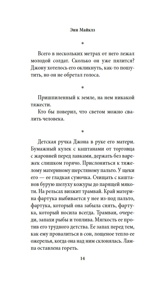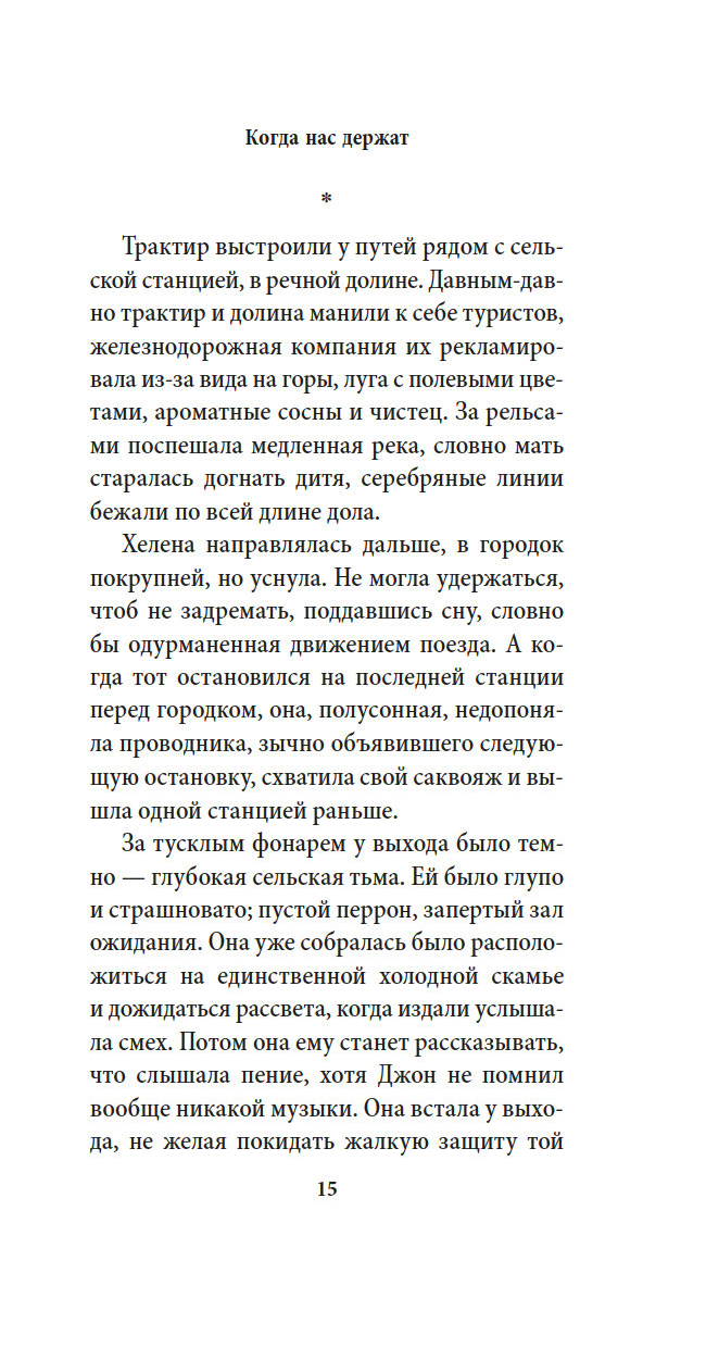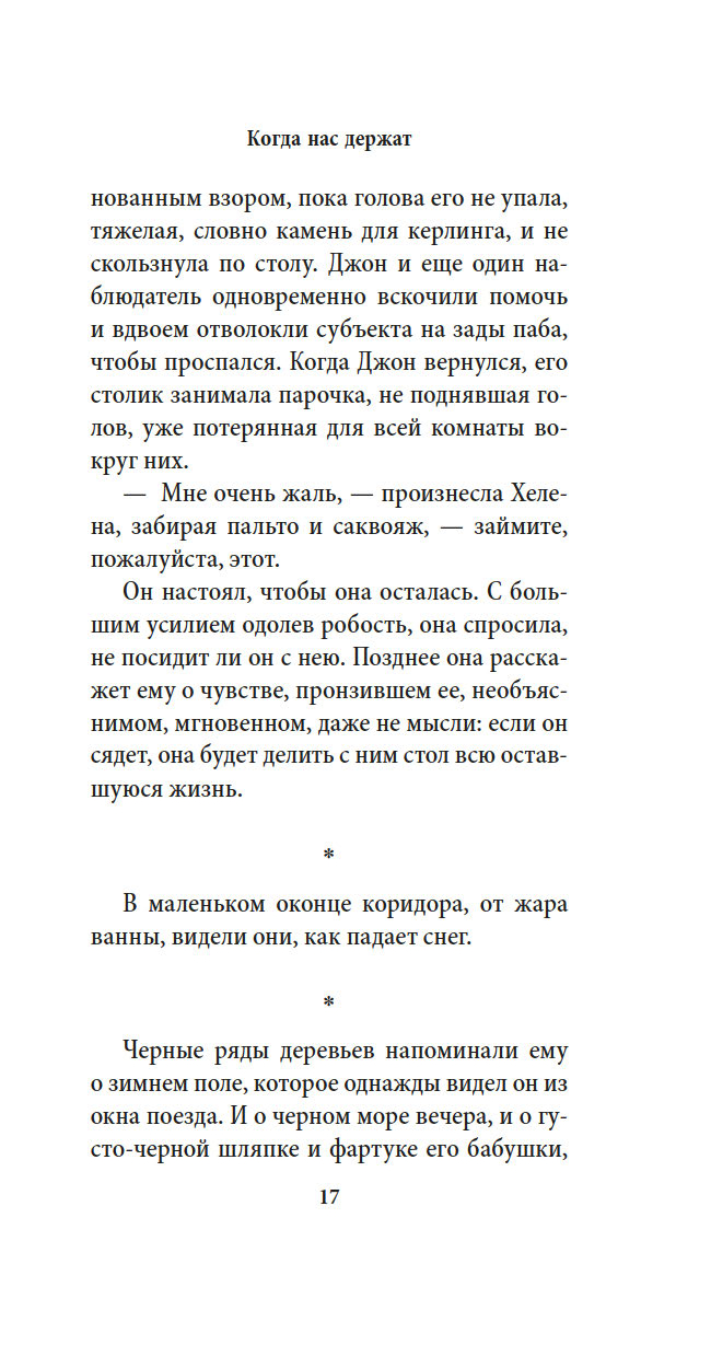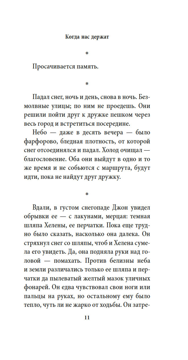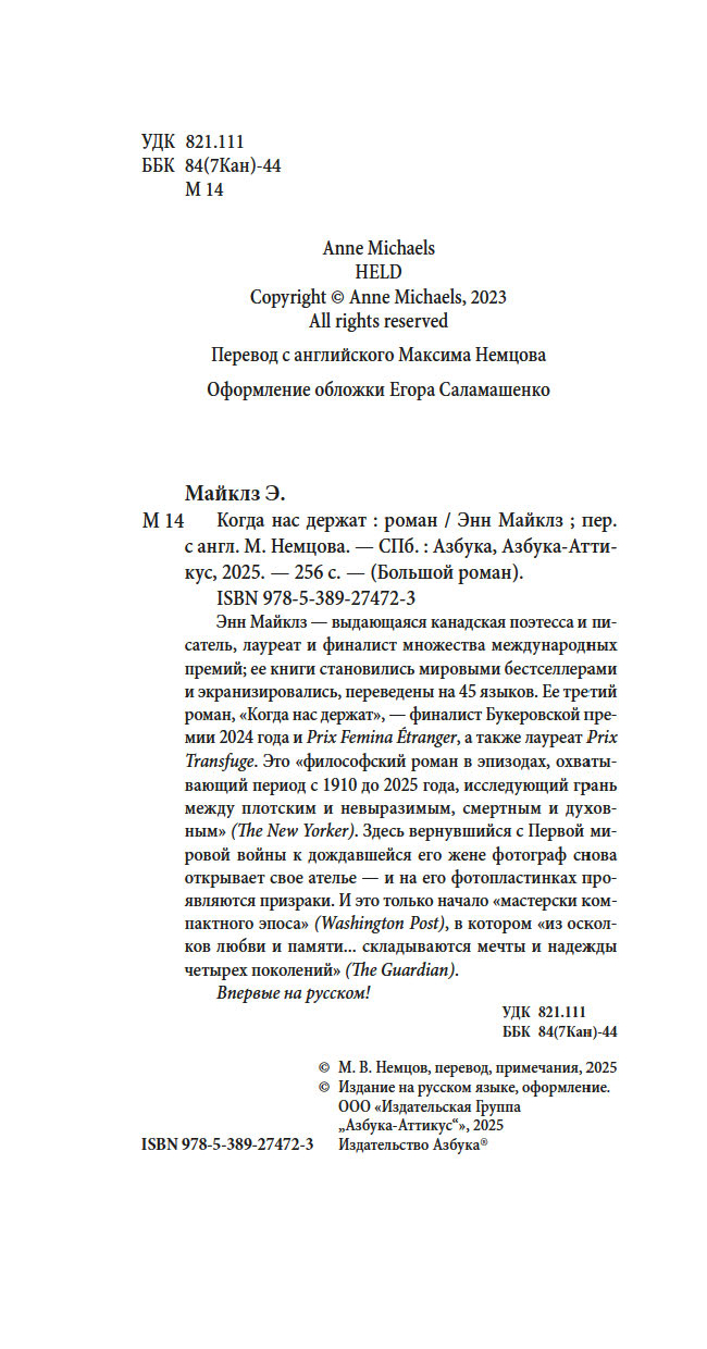 Энн Майклз – выдающаяся канадская поэтесса и писатель, лауреат и финалист множества международных премий; ее книги становились мировыми бестселлерами и экранизировались, переведены на 45 языков. Ее третий роман, "Когда нас держат", – финалист Букеровской премии 2024 года и Prix Femina Étranger, а также лауреат Prix Transfuge. Это "философский роман в эпизодах, охватывающий период с 1910 до 2025 года, исследующий грань между плотским и невыразимым, смертным и духовным" (The New Yorker). Здесь вернувшийся с Первой мировой войны к дождавшейся его жене фотограф снова открывает свое ателье – и на его фотопластинках проявляются призраки. И это только начало "мастерски компактного эпоса" (Washington Post), в котором "из осколков любви и памяти... складываются мечты и надежды четырех поколений" (The Guardian).