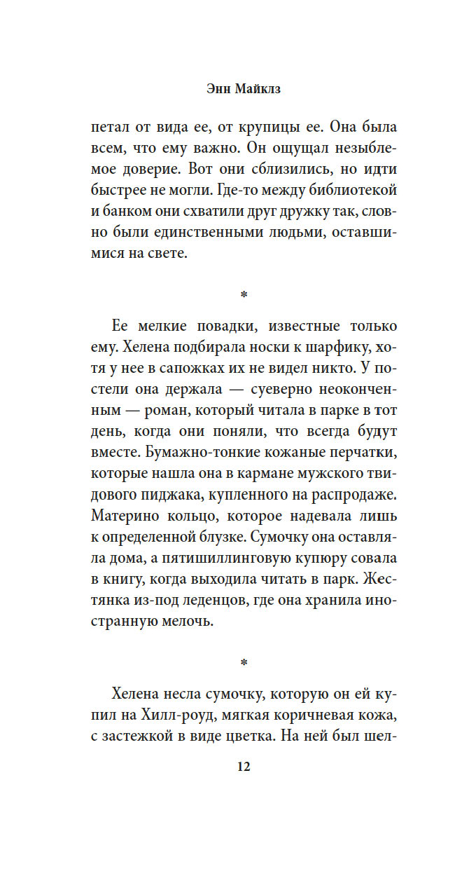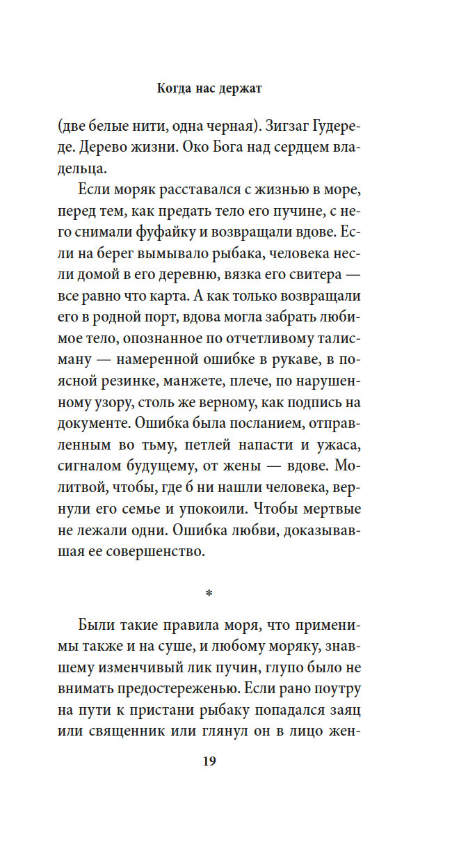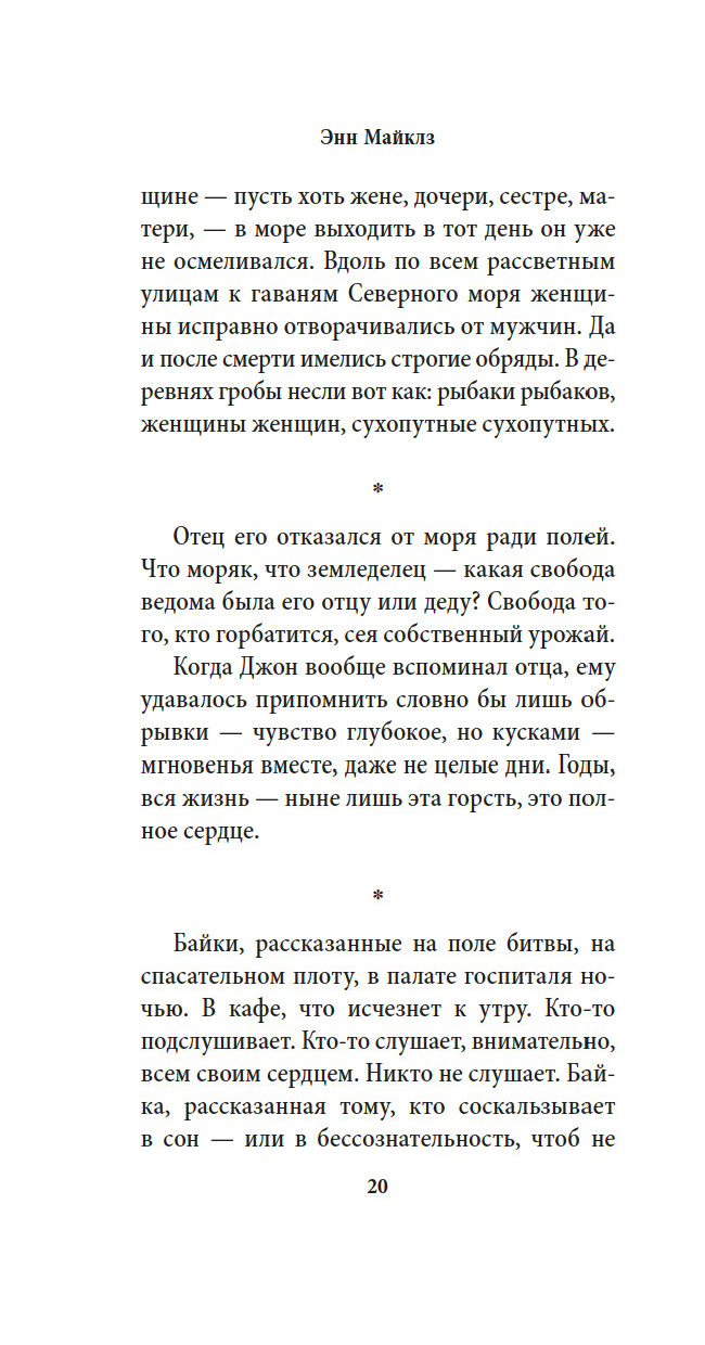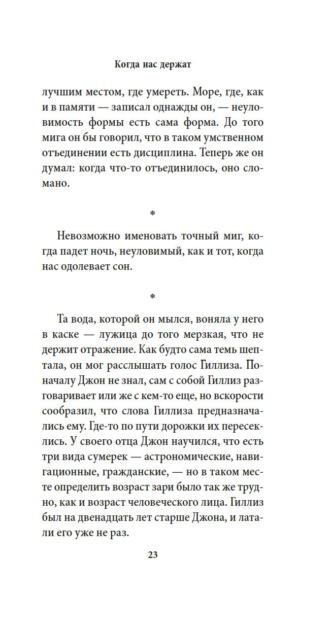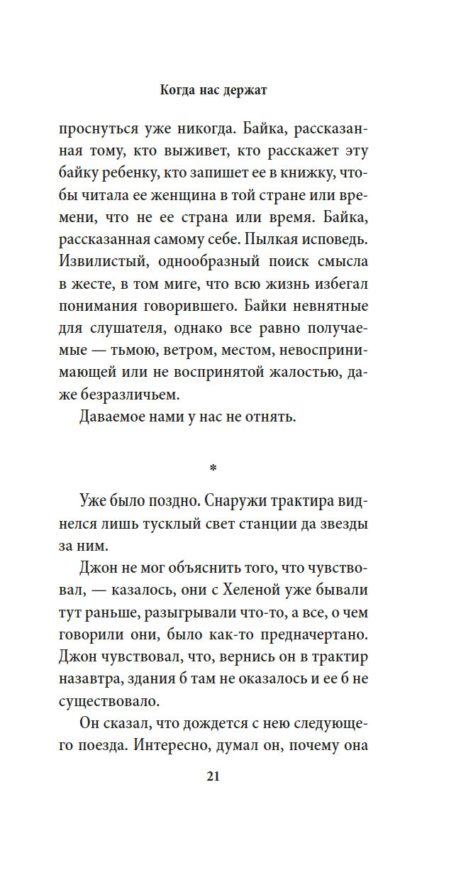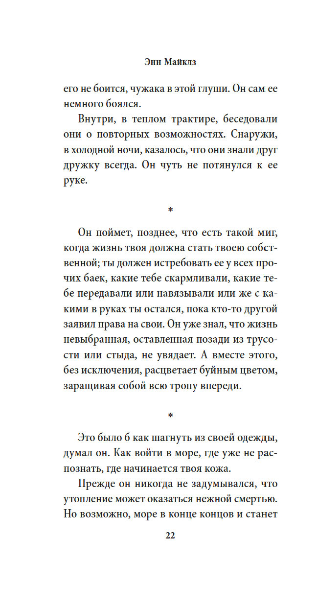 Энн Майклз – выдающаяся канадская поэтесса и писатель, лауреат и финалист множества международных премий; ее книги становились мировыми бестселлерами и экранизировались, переведены на 45 языков. Ее третий роман, "Когда нас держат", – финалист Букеровской премии 2024 года и Prix Femina Étranger, а также лауреат Prix Transfuge. Это "философский роман в эпизодах, охватывающий период с 1910 до 2025 года, исследующий грань между плотским и невыразимым, смертным и духовным" (The New Yorker). Здесь вернувшийся с Первой мировой войны к дождавшейся его жене фотограф снова открывает свое ателье – и на его фотопластинках проявляются призраки. И это только начало "мастерски компактного эпоса" (Washington Post), в котором "из осколков любви и памяти... складываются мечты и надежды четырех поколений" (The Guardian).