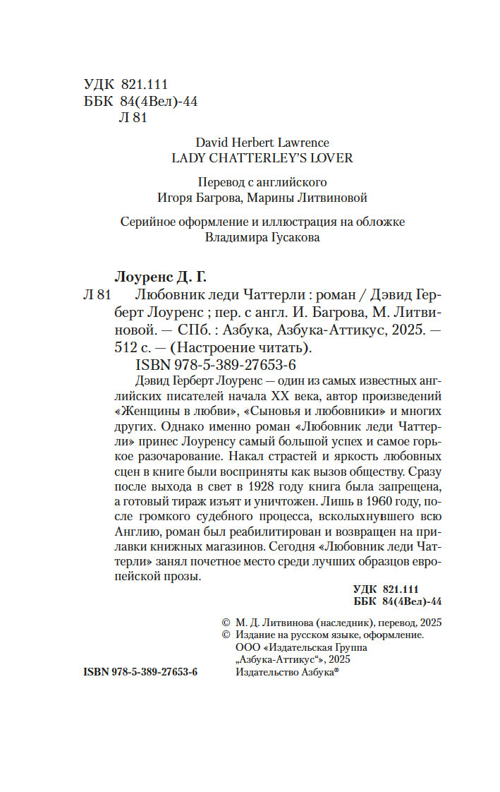 Дэвид Герберт Лоуренс – один из самых известных английских писателей начала ХХ века, автор произведений "Женщины в любви", "Сыновья и любовники" и многих других. Однако именно роман "Любовник леди Чаттерли" принес Лоуренсу самый большой успех и самое горькое разочарование. Накал страстей и яркость любовных сцен в книге были восприняты как вызов обществу. Сразу после выхода в свет в 1928 году книга была запрещена, а готовый тираж изъят и уничтожен. Лишь в 1960 году, после громкого судебного процесса, всколыхнувшего всю Англию, роман был реабилитирован и возвращен на прилавки книжных магазинов. Сегодня "Любовник леди Чаттерли" занял почетное место среди лучших образцов европейской прозы.