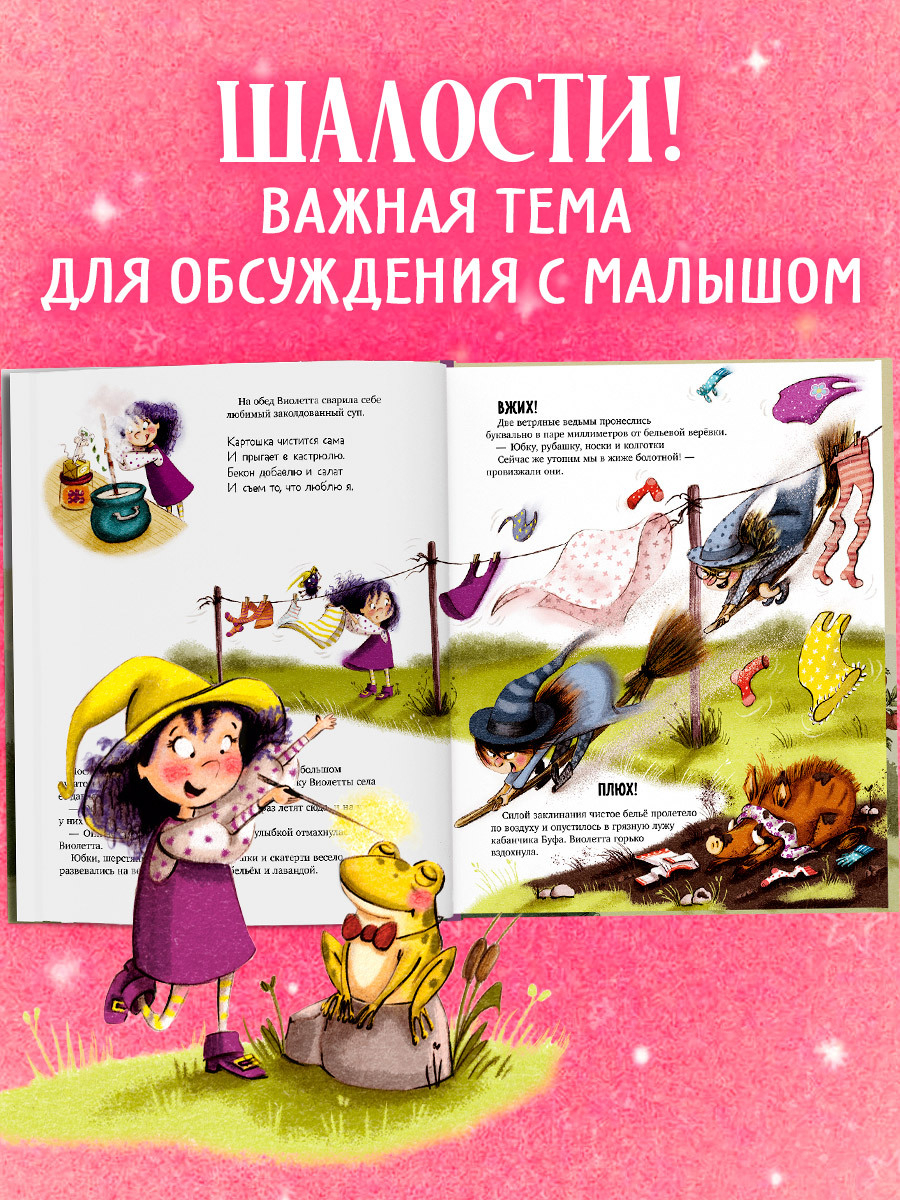 "Ведьмочка Виолетта, шалости и заколдованный суп" – чудесная сказка с яркими, эмоциональными иллюстрациями про маленькую добрую волшебницу, которая вдруг решила стать настоящей хулиганкой.