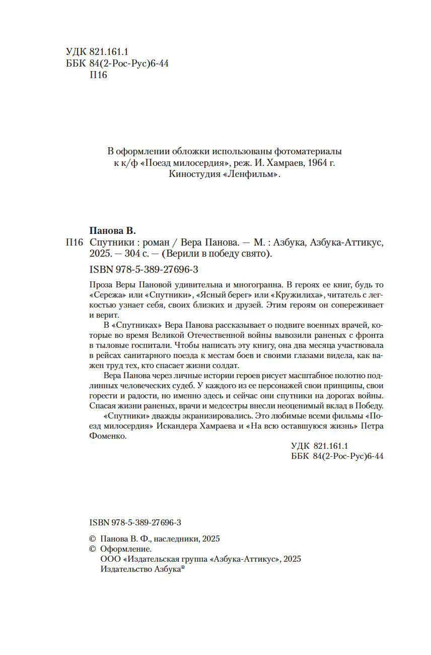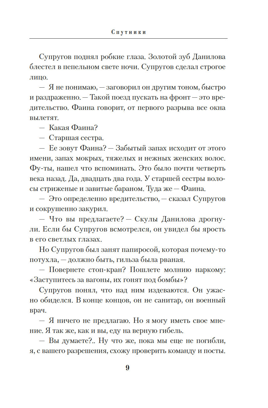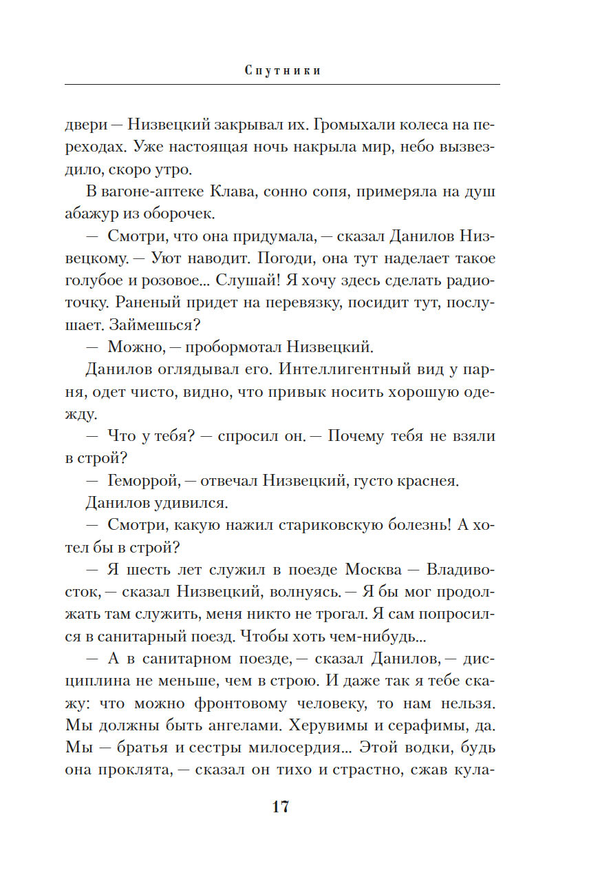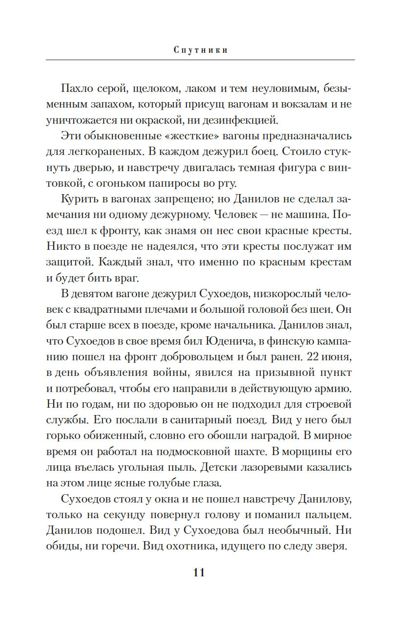 В "Спутниках" Вера Панова рассказывает о подвиге военных врачей, которые во время Великой Отечественной войны вывозили раненых с фронта в тыловые госпитали. Чтобы написать эту книгу, писательница два месяца участвовала в рейсах санитарного поезда к местам боев и своими глазами видела, как важен труд тех, кто спасает жизни солдат.