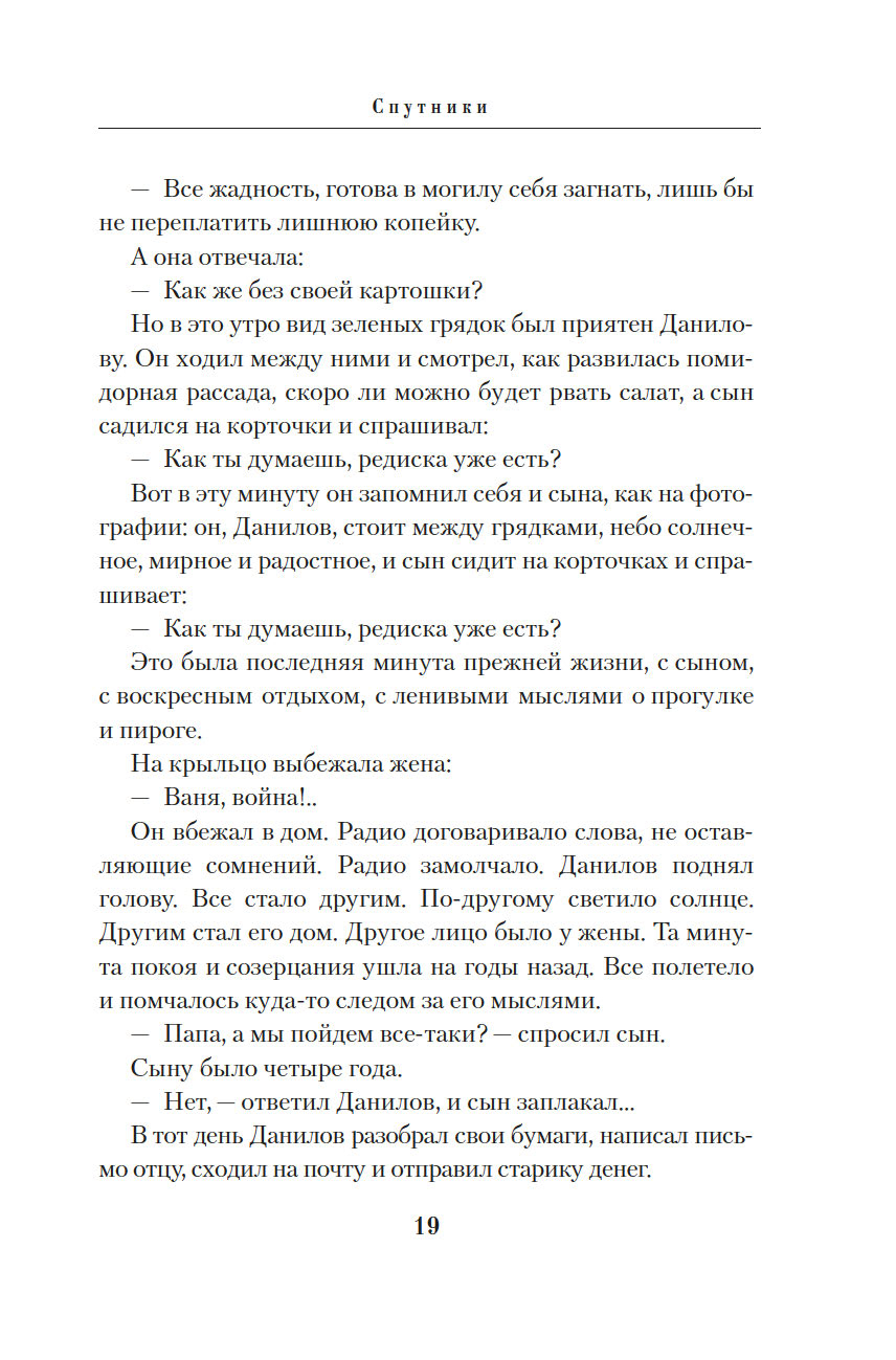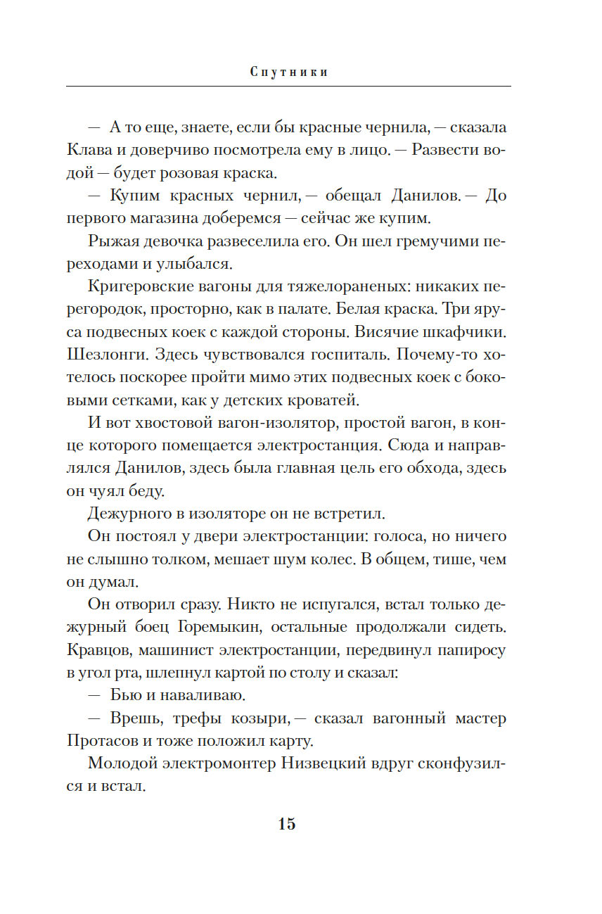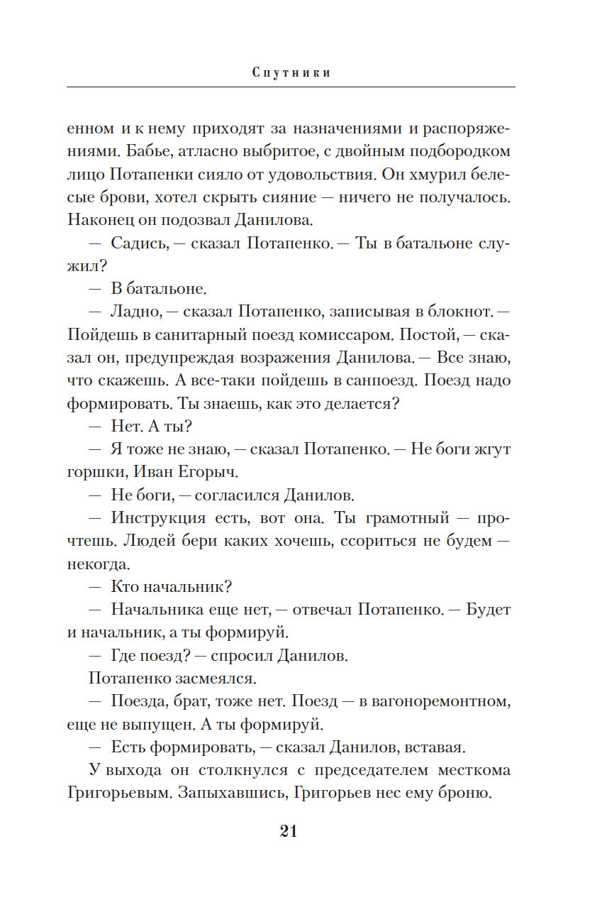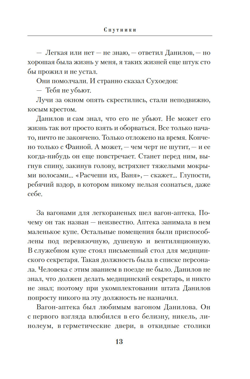 В "Спутниках" Вера Панова рассказывает о подвиге военных врачей, которые во время Великой Отечественной войны вывозили раненых с фронта в тыловые госпитали. Чтобы написать эту книгу, писательница два месяца участвовала в рейсах санитарного поезда к местам боев и своими глазами видела, как важен труд тех, кто спасает жизни солдат.