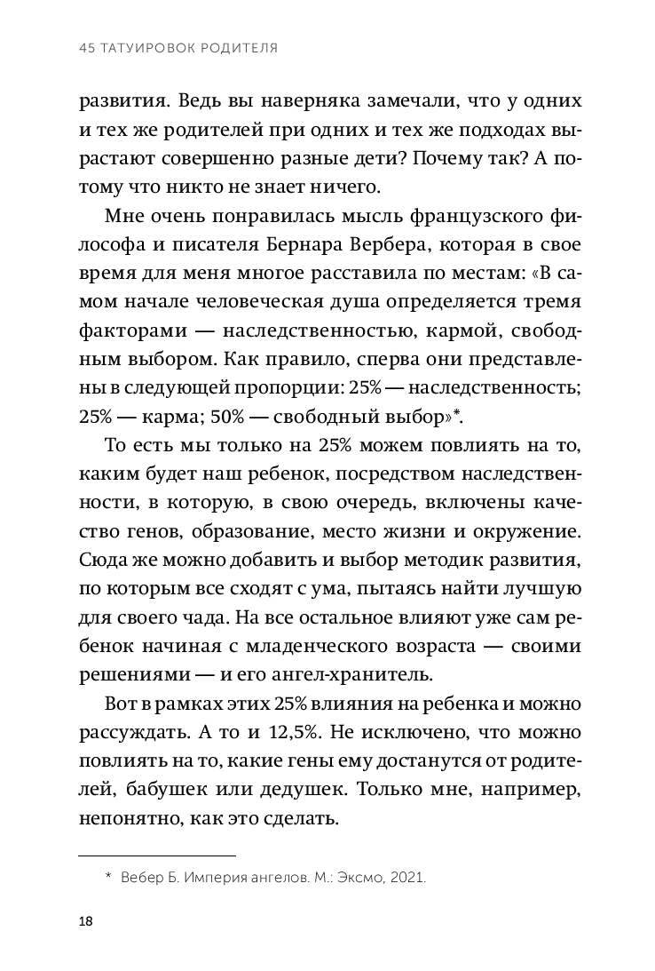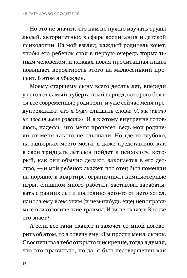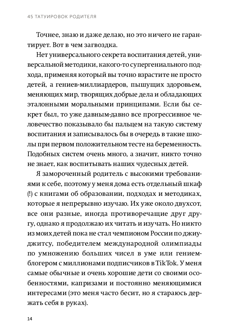 Книга о родительских "татуировках" Максима Батырева – автора супербестселлеров, популярного спикера и отца четверых детей. По признанию самого Максима, для него это самая сложная из написанных им книг. В ней он делится той частью жизни, которую предприниматели обычно не показывают. Тем не менее 45 принципов воспитания, которых он придерживается и о которых расскажет на страницах книги, точно помогут сделать родительский труд чуть легче, а отношения с детьми лучше и гармоничнее.