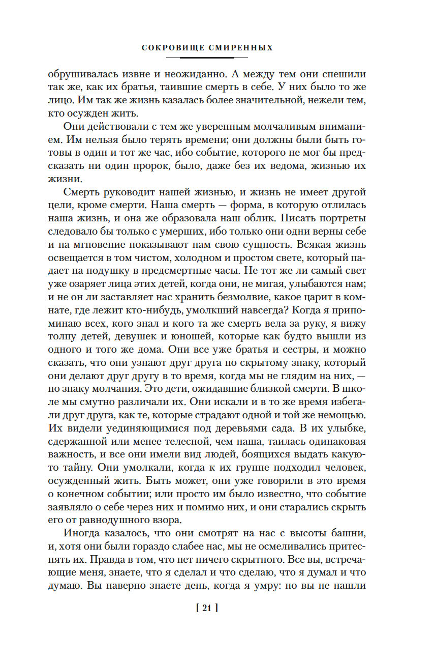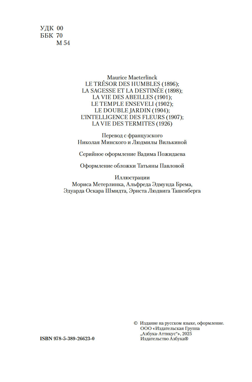 В настоящем издании представлены избранные эссе и трактаты Мориса Метерлинка, написанные с 1896 по 1926 год: "Сокровище смиренных", "Мудрость и судьба", "Жизнь пчел", "Погребенный храм", "Двойной сад", "Разум цветов", "Жизнь термитов".