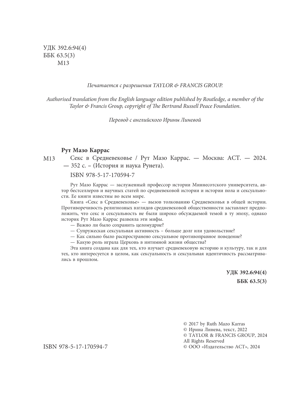 Рут Мазо Каррас – заслуженный профессор истории Миннесотского университета, автор бестселлеров и научных статей по средневековой истории и истории пола и сексуальности. Ее книги известны во всем мире.