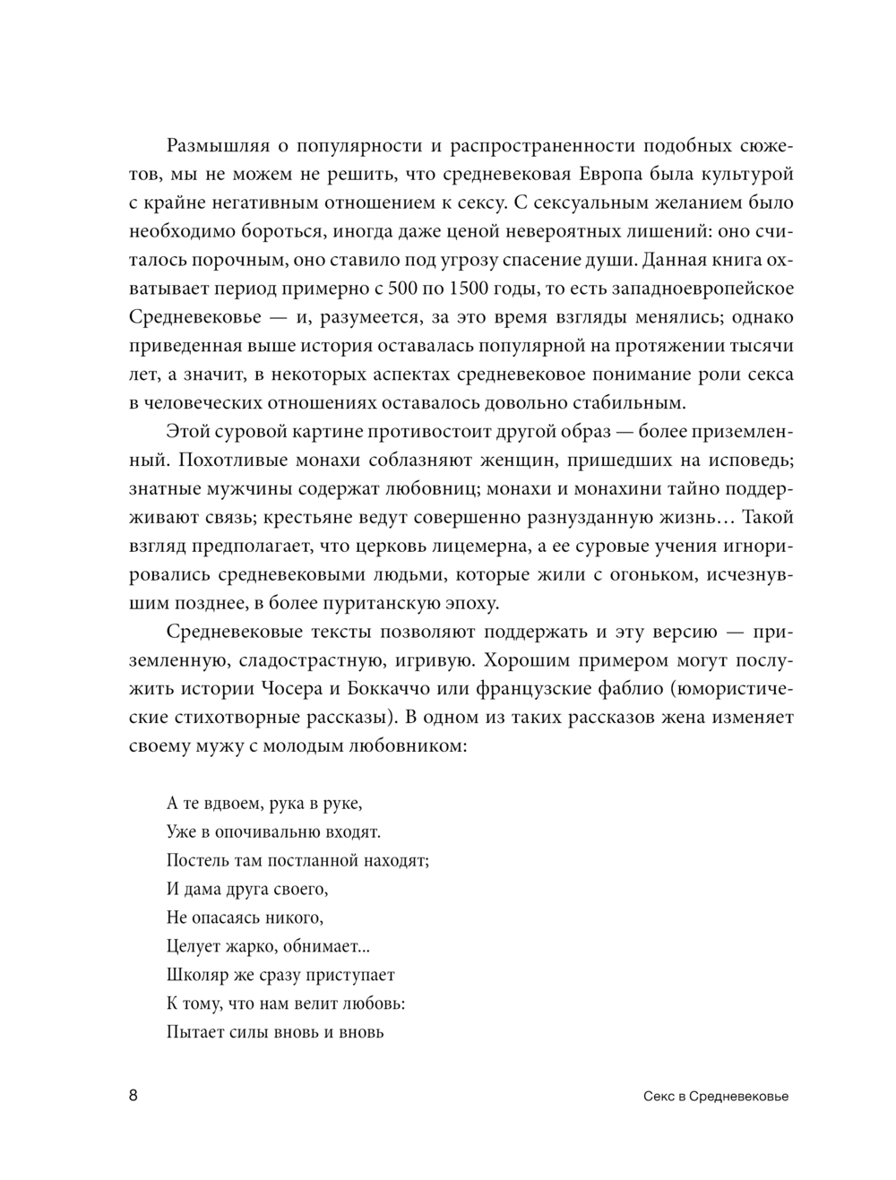 Книга "Секс в Средневековье" – вызов толкованию Средневековья в общей истории. Противоречивость религиозных взглядов средневековой общественности заставляет предположить, что секс и сексуальность не были широко обсуждаемой темой в ту эпоху, однако историк Рут Мазо Каррас развеяла эти мифы. В это издание включены последние научные исследования, освещены такие темы как целомудрие, супружеская сексуальная активность, противоправное поведение, роль церкви в обществе и т. д.