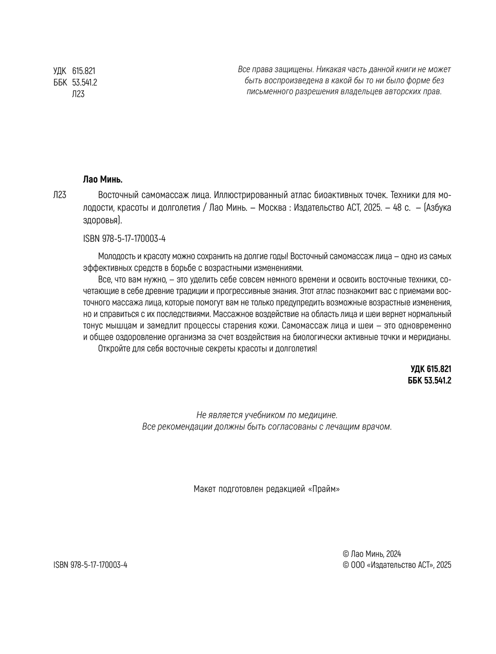 Этот атлас – подробное иллюстрированное руководство по восточному массажу лица. В нем приведены эффективные техники, которые помогут вам не только предупредить возможные возрастные изменения, но и справиться с их последствиями. Посредством регулярного самомассажа вы научитесь грамотно воздействовать на биологически активные точки и меридианы, тем самым сохраняя молодость и свежесть лица на долгие годы.