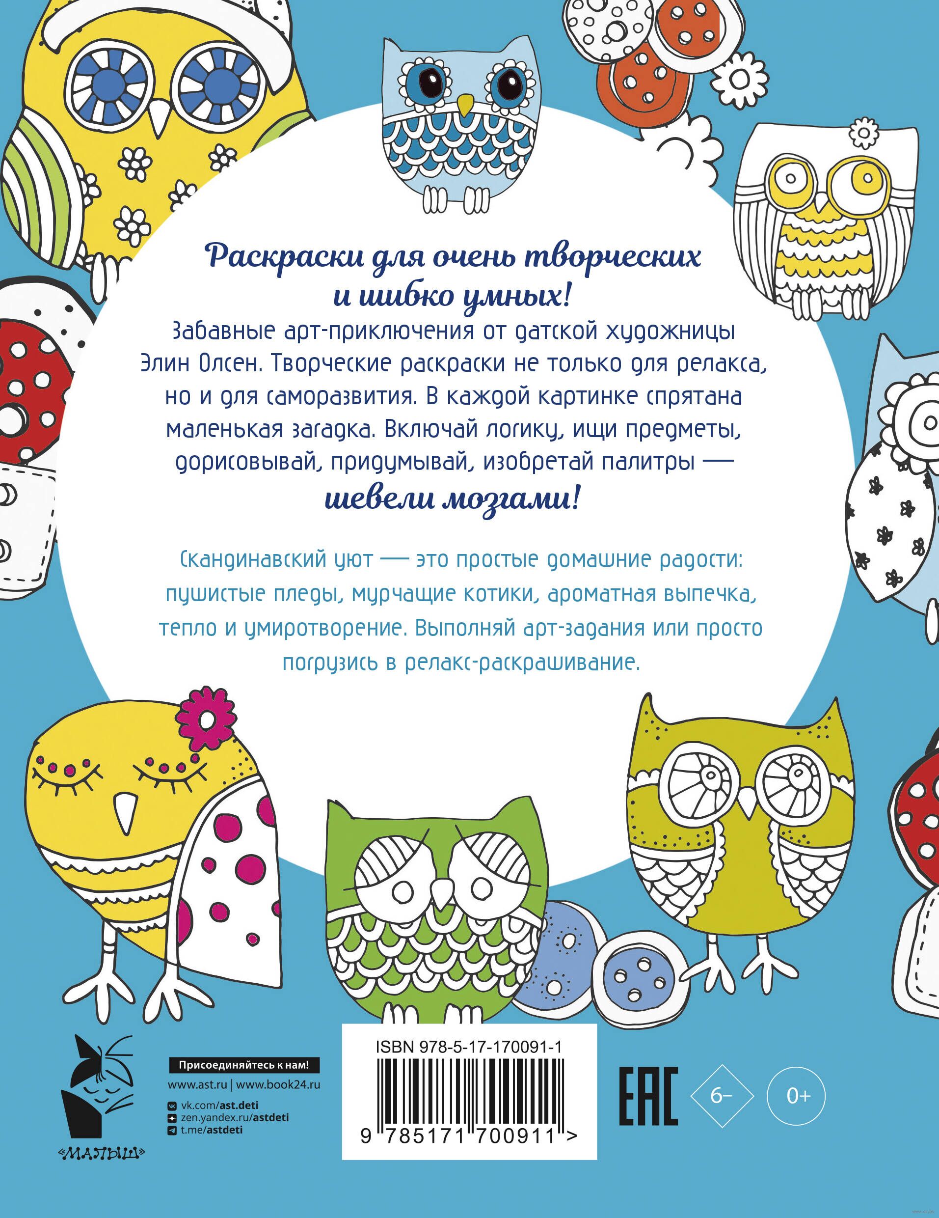 Раскраски для очень творческих и шибко умных! Забавные арт-приключения от датской художницы Элин Олсен. Творческие раскраски не только для релакса, но и для саморазвития. В каждой картинке спрятана маленькая загадка. Включай логику, ищи предметы, дорисовывай, придумывай, изобретай палитры – шевели мозгами!