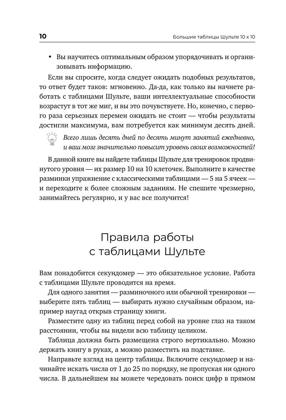 Увеличенный размер "таблиц Шульте" 10 х 10 открывает новые возможности для интеллектуального роста на продвинутом уровне и делает тренировки в два раза более эффективными. Ощутите, как ваш мозг работает на максимум уже после первых занятий!