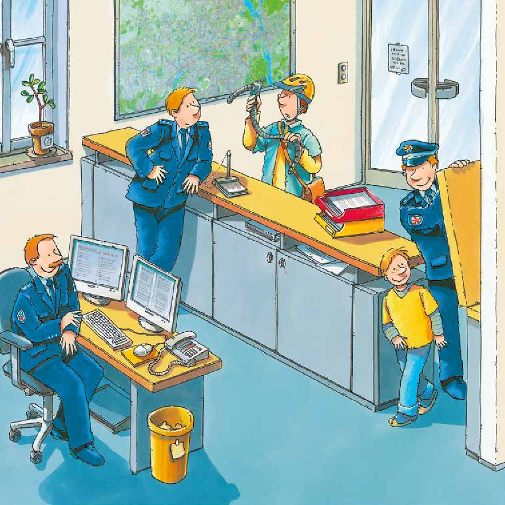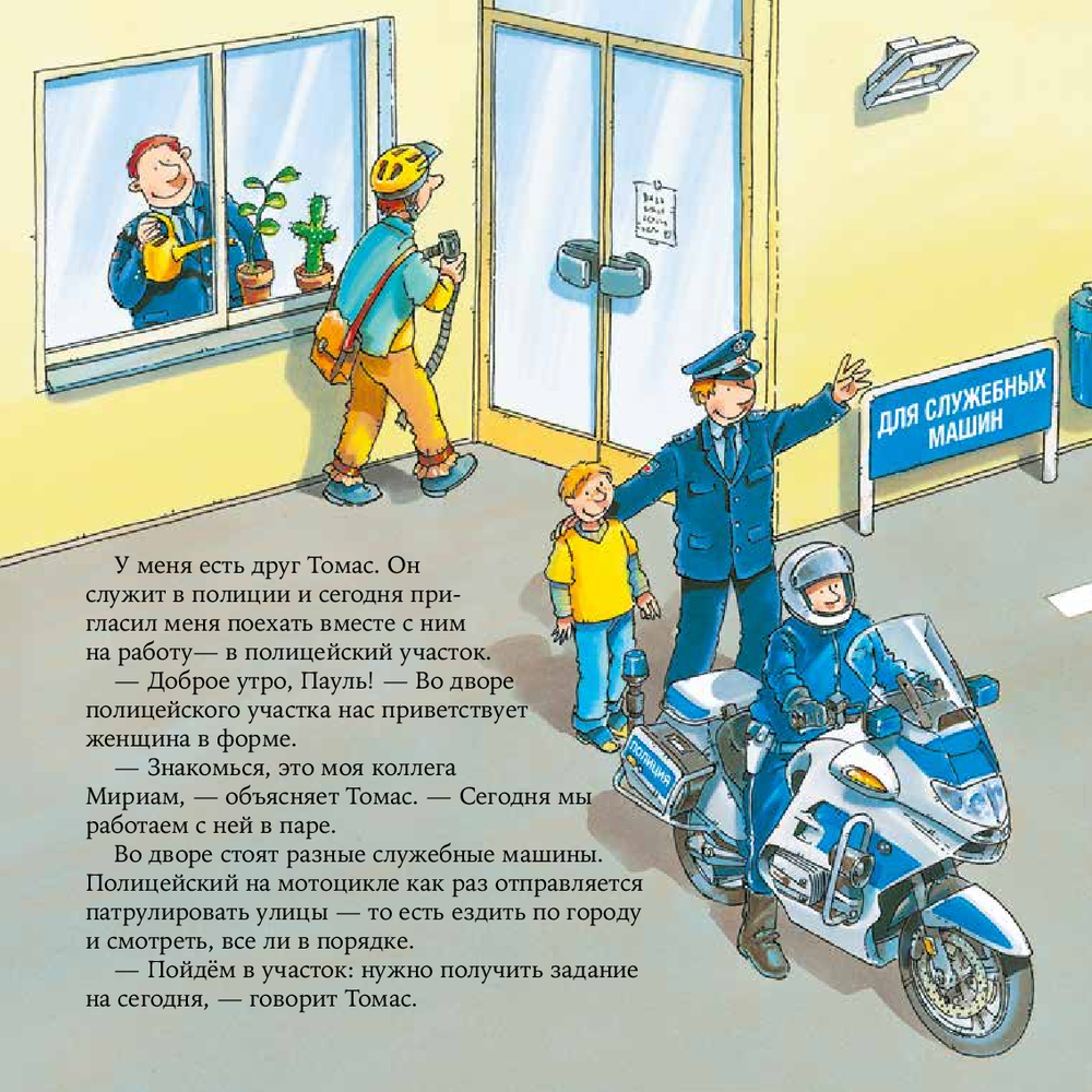 В этой книге мальчик проводит целый день с Томасом – сотрудником полиции. Вместе с напарником Томас показывает, как устроена работа полицейского участка и чем занимаются разные подразделения. Читатели узнают о том, кто отвечает за порядок в парках, а кто на улицах, как ловят преступников, и как дежурные экипажи получают задания в течение дня.