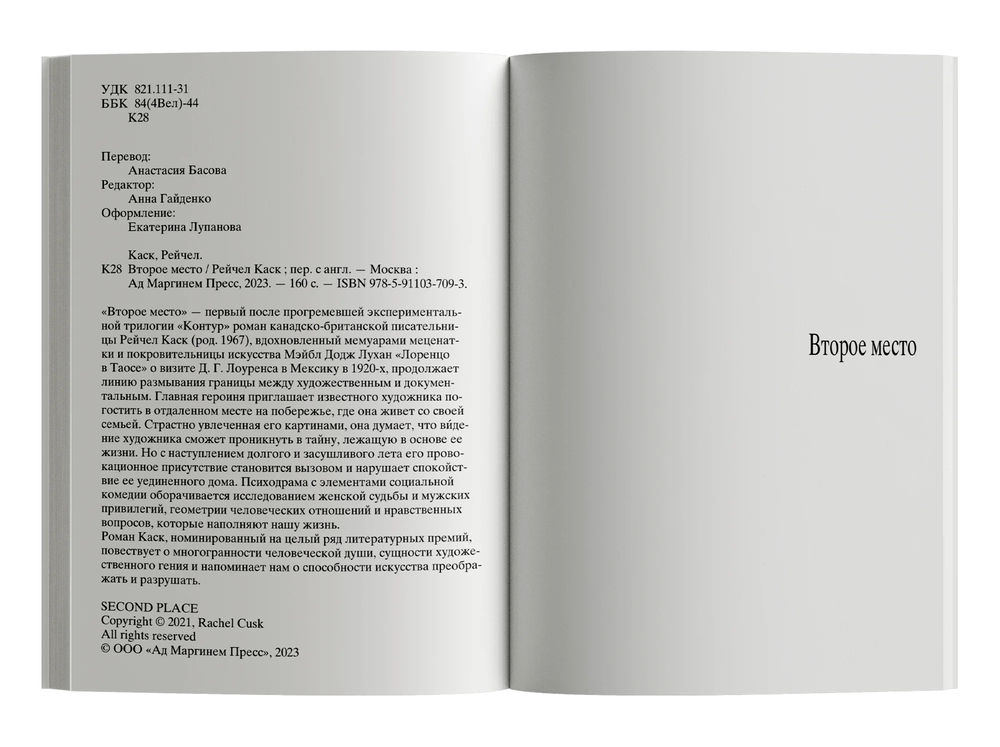 "Второе место" – первый после прогремевшей экспериментальной трилогии "Контур" роман канадско-британской писательницы Рейчел Каск (род. 1967), вдохновленный мемуарами меценатки и покровительницы искусства Мэйбл Додж Лухан "Лоренцо в Таосе" о визите Д. Г. Лоуренса в Мексику в 1920-х, продолжает линию размывания границы между художественным и документальным. Главная героиня приглашает известного художника погостить в отдаленном месте на побережье, где она живет со своей семьей. Страстно увлеченная его картинами, она думает, что ви́дение художника сможет проникнуть в тайну, лежащую в основе ее жизни. Но с наступлением долгого и засушливого лета его провокационное присутствие становится вызовом и нарушает спокойствие ее уединенного дома. Психодрама с элементами социальной комедии оборачивается исследованием женской судьбы и мужских привилегий, геометрии человеческих отношений и нравственных вопросов, которые наполняют нашу жизнь.
