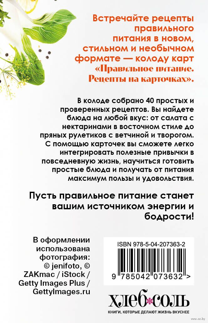 Эта уникальная колода из 40 кулинарных карт станет вашим надежным спутником на пути к правильному и сбалансированному питанию: каждая карта содержит тщательно подобранные рецепты с фотографиями и точный список ингредиентов. Удобный формат позволит взять колоду с собой куда угодно – у вас под рукой всегда будет целый сборник завтраков, обедов, ужинов и закусок, приготовление которых не отнимет много времени и сил. Порадуйте себя и своих близких простыми и полезными кулинарными шедеврами!