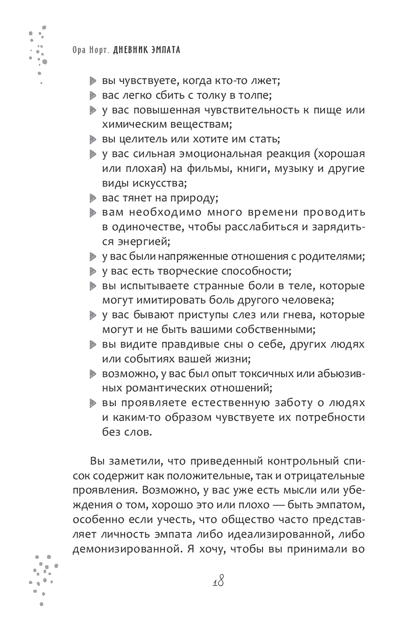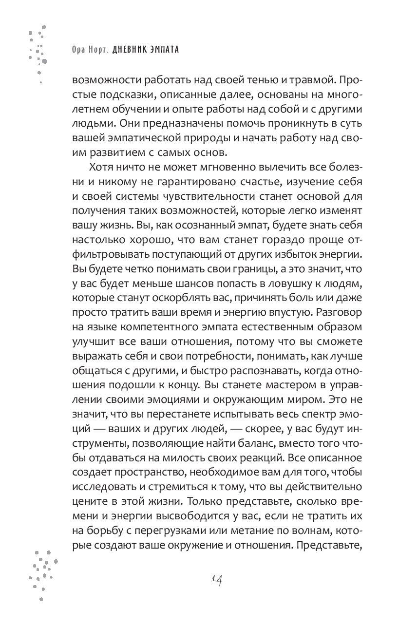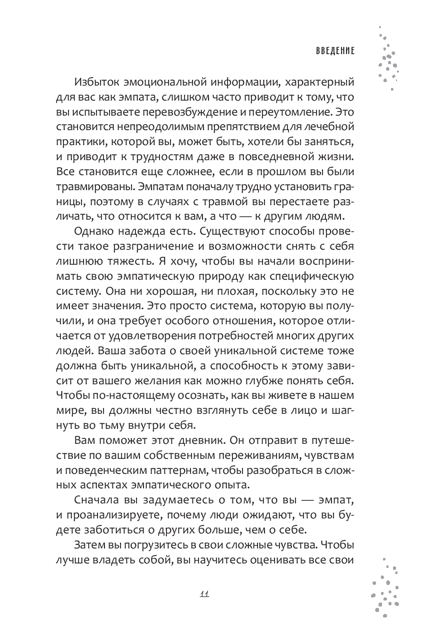 Правда в том, что такая чувствительность – это одновременно и то и другое. И вы можете научиться управлять этим. Простые техники, описанные в этом дневнике, основаны на многолетнем обучении автора и опыте работы с собой и с другими людьми. Они помогут проникнуть в суть эмпатической природы и начать свой путь к гармонии с самых основ.