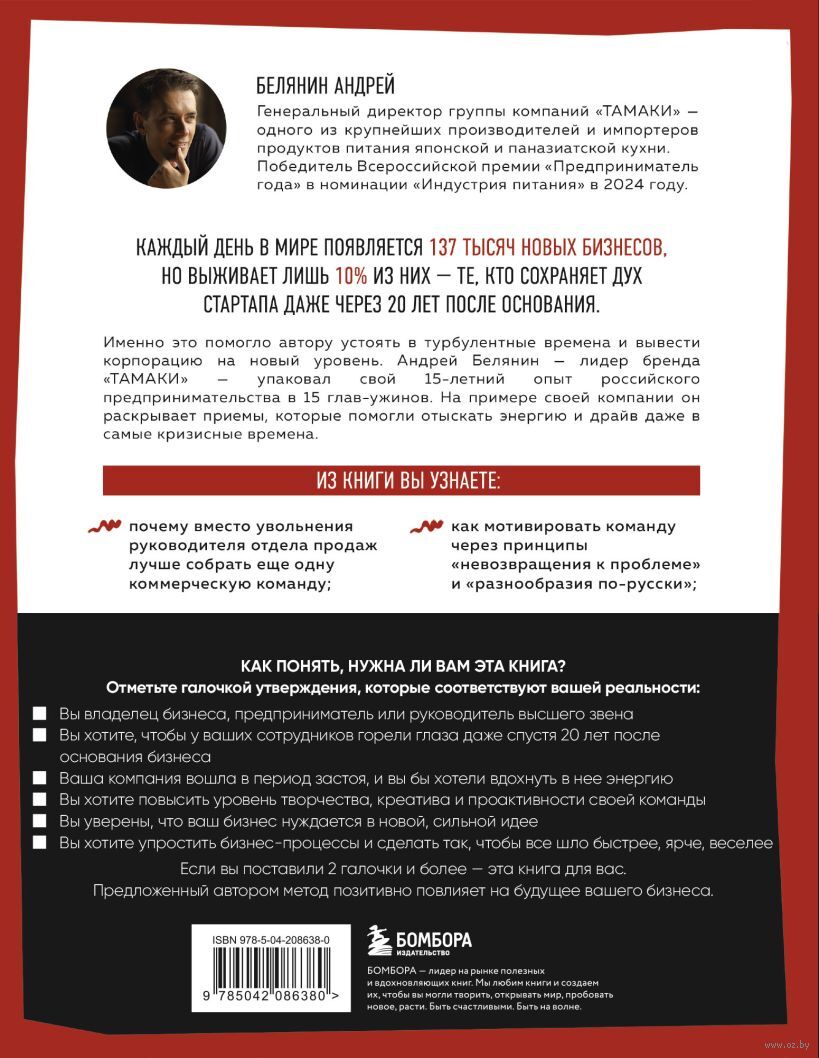 Именно это помогло автору устоять в турбулентные времена и вывести корпорацию на новый уровень. Андрей Белянин – генеральный директор "ТАМАКИ" – упаковал свой 15-летний опыт российского предпринимательства в 15 глав-ужинов. На примере своей компании он раскрывает приемы, которые помогли отыскать энергию и драйв даже в самые кризисные времена.