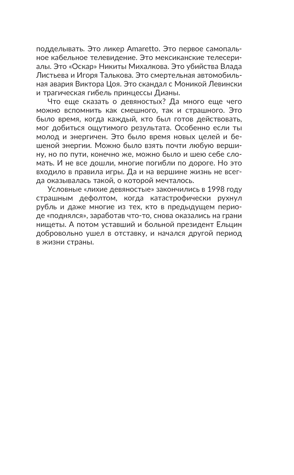 Девяностые годы ХХ века... В нашей стране они ознаменовались столькими событиями, что хватило бы не на одну историческую эпоху. Среди них было много печальных и по-настоящему трагичных, но встречались и поводы для радости. Именно в это время окончательно рухнул "железный занавес" и у простых обывателей появилась возможность увидеть произведенные за границей товары и познакомиться с тем, как живут в других странах. Именно тогда население получило возможность по-настоящему влиять на политическую и социальную жизнь страны. И именно с тем десятилетием связывают окончательное развитие свободы самовыражения, что нашло проявление в эксцентричной молодежной моде. Все это соседствовало с войнами, терактами, тотальной бедностью и неуверенностью в завтрашнем дне, но в таких муках рождалась Россия, которую мы знаем сегодня. Безусловно девяностые – один из самых знаковых для нашей Родины периодов в истории, и то, что он закончился прозвучавшими в последней речи президента России Б.Н. Ельцина словами сожаления и надеждами на лучшее будущее, очень символично.