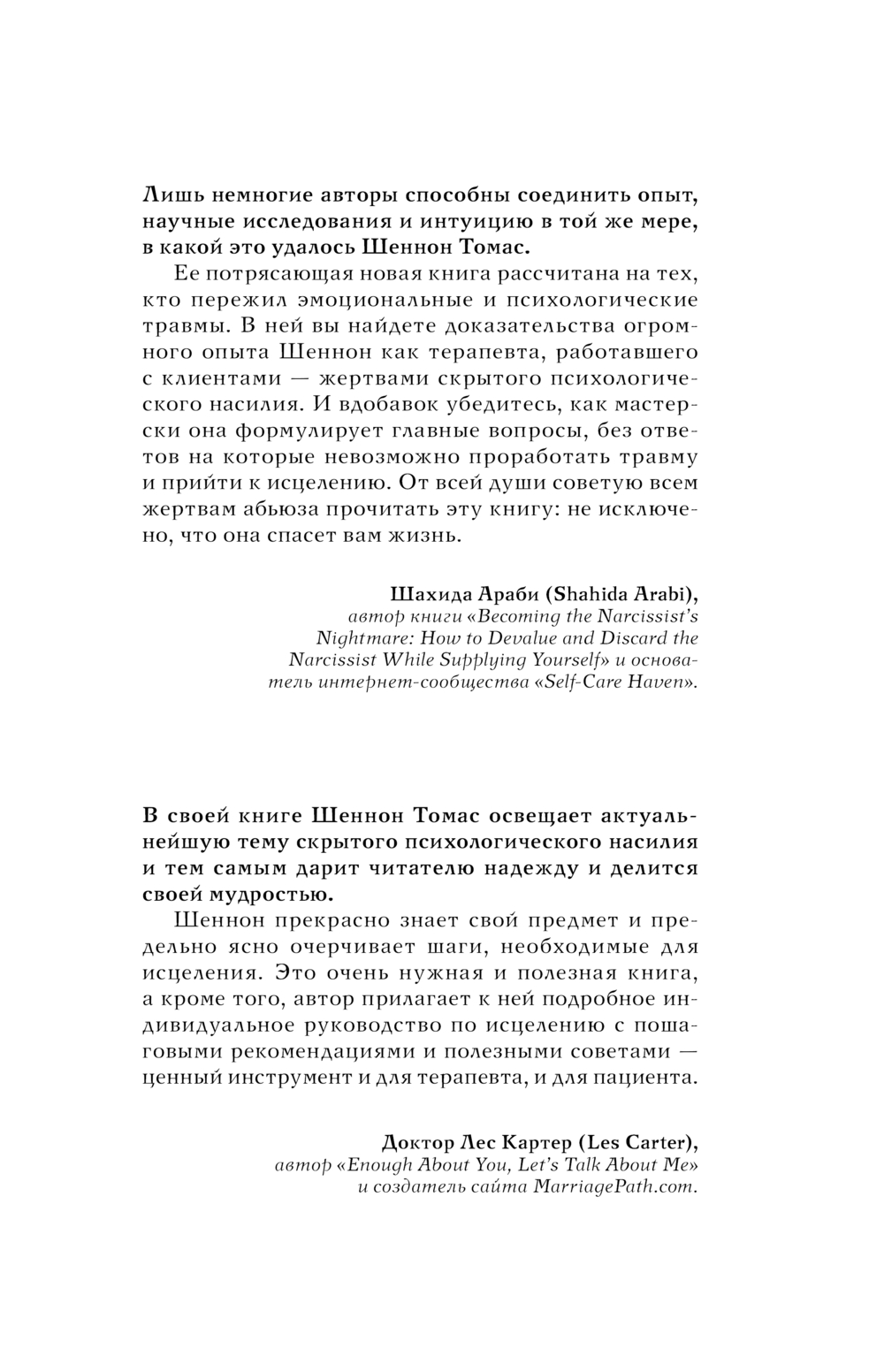 Шеннон Томас – автор международных бестселлеров, эксперт в работе с жертвами психологического насилия – расскажет о признаках, механизмах и уловках психологического абьюза, а также познакомит с шестью этапами восстановления после токсичных отношений. Представленная в книге программа одобрена профессиональным сообществом и уже используется тысячами людей в 11 странах мира!