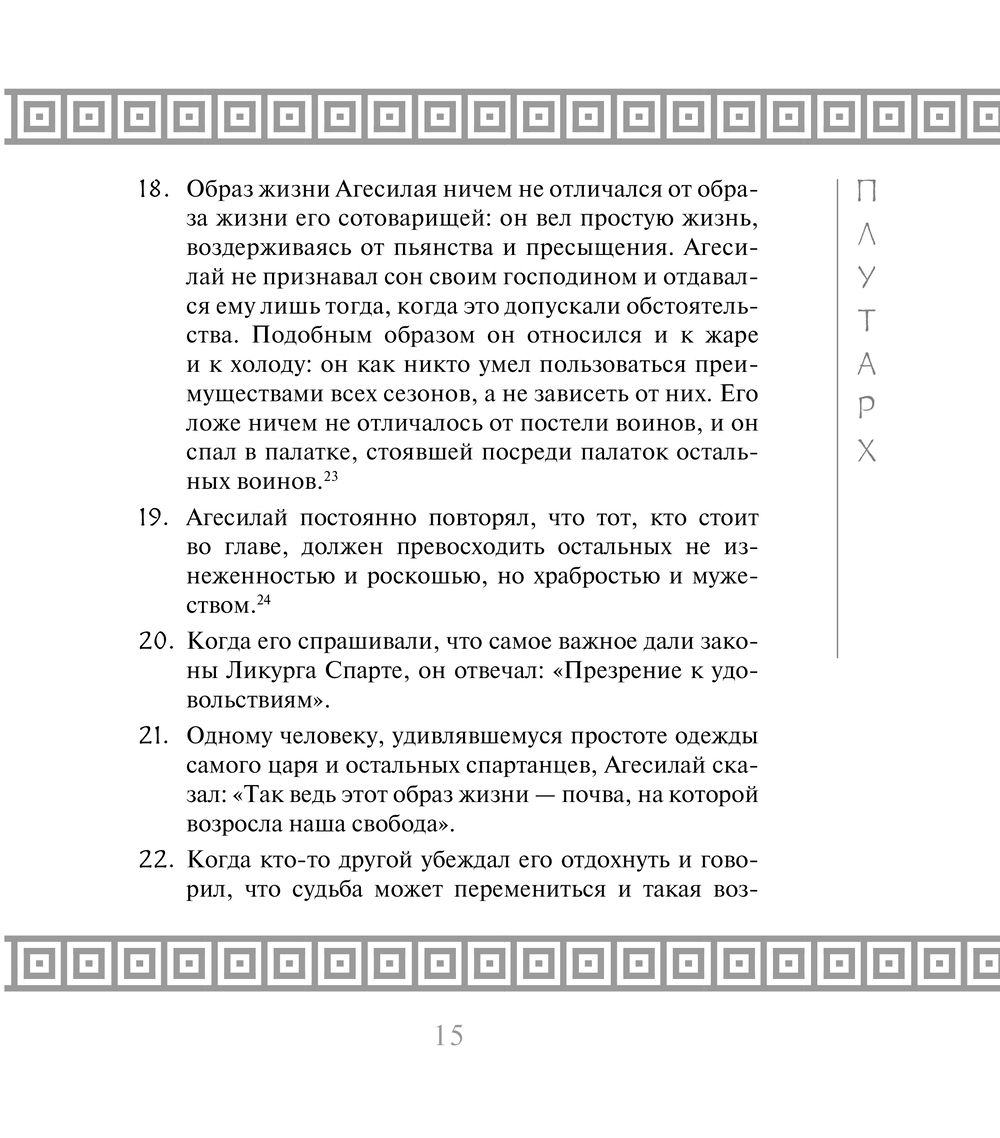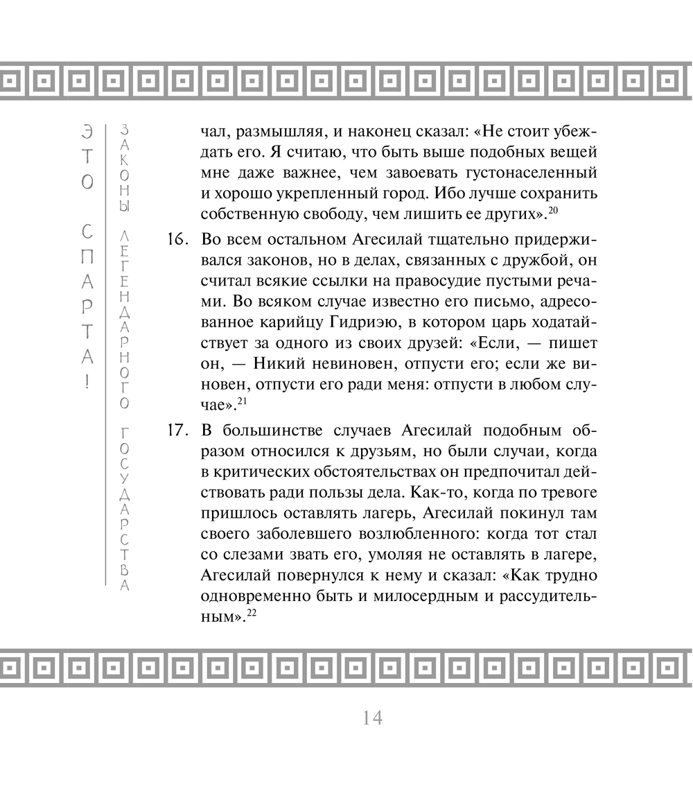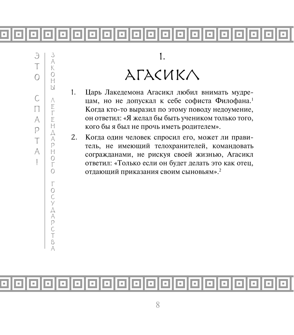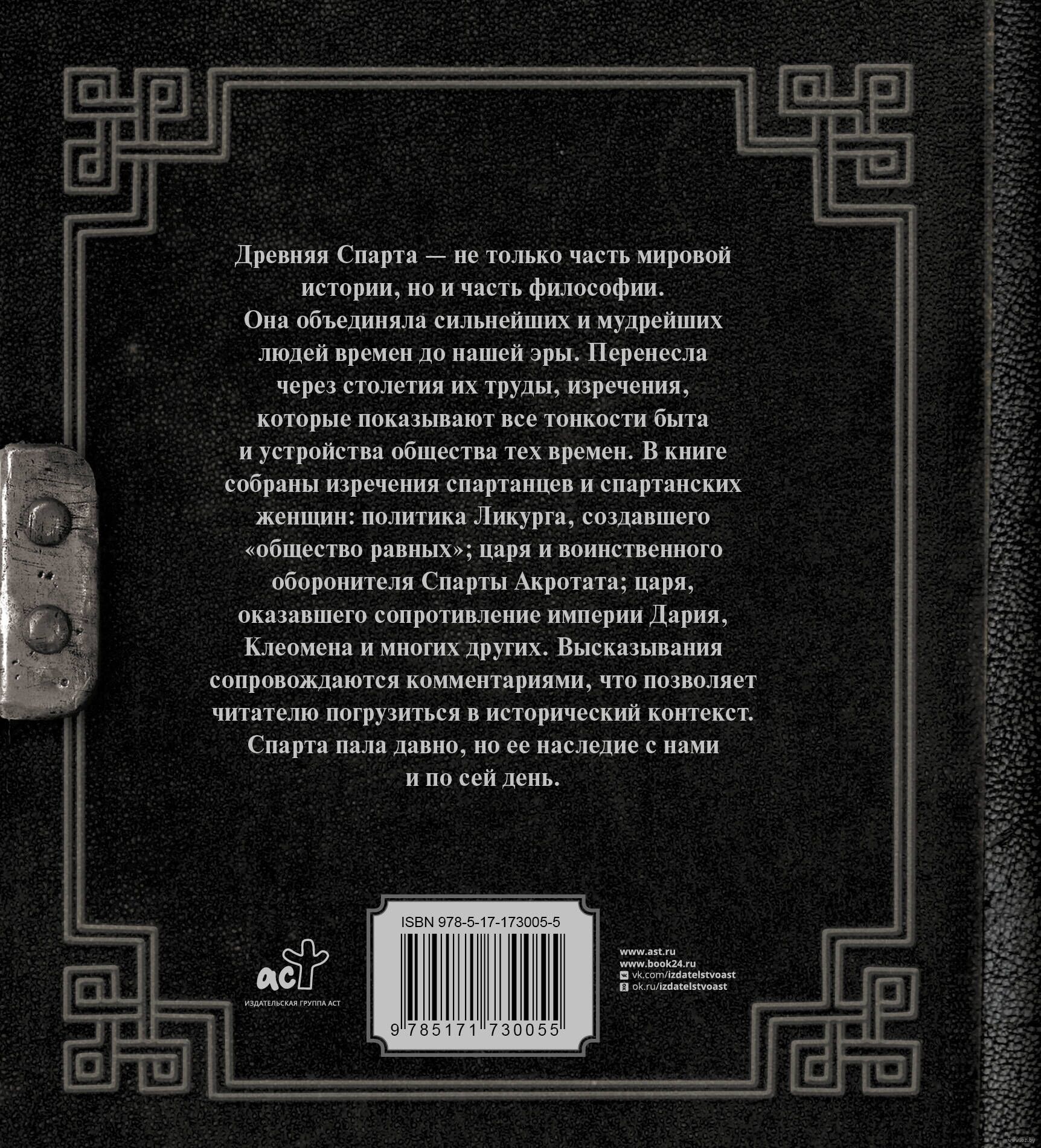 Древняя Спарта – не только часть мировой истории, но и часть философии. Она объединяла сильнейших и мудрейших людей времен до нашей эры. Перенесла через столетия их труды, изречения, которые показывают все тонкости быта и устройства общества тех времен. В книге собраны изречения спартанцев и спартанских женщин: политика Ликурга, создавшего "общество равных"; царя и воинственного оборонителя Спарты Акротата; царя, оказавшего сопротивление империи Дария, Клеомена и многих других. Высказывания сопровождаются комментариями, что позволяет читателю погрузиться в исторический контекст. Спарта пала давно, но ее наследие с нами и по сей день.