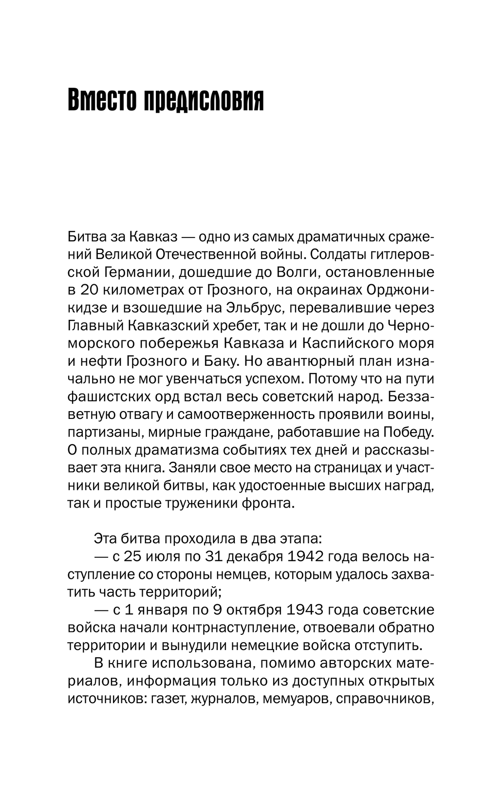 Битва за Кавказ – тяжелейшее сражение Великой Отечественной войны, проходившее в условиях ограниченного снабжения боеприпасами и продовольствием. Захват нефтяных месторождений в Кавказских горах и получение выхода к Каспийскому морю позволили бы немецким войскам успешно продолжать наступление на территорию СССР. И, понимая это, советские бойцы упорно отбивали каждую высоту и перевал. В условиях горной местности, где любой шаг мог стать последним, они находили в себе силы идти вперед, зная, что от победы на южном направлении зависит исход всей войны. Именно их героизм и сила духа сделали возможной Великую Победу.