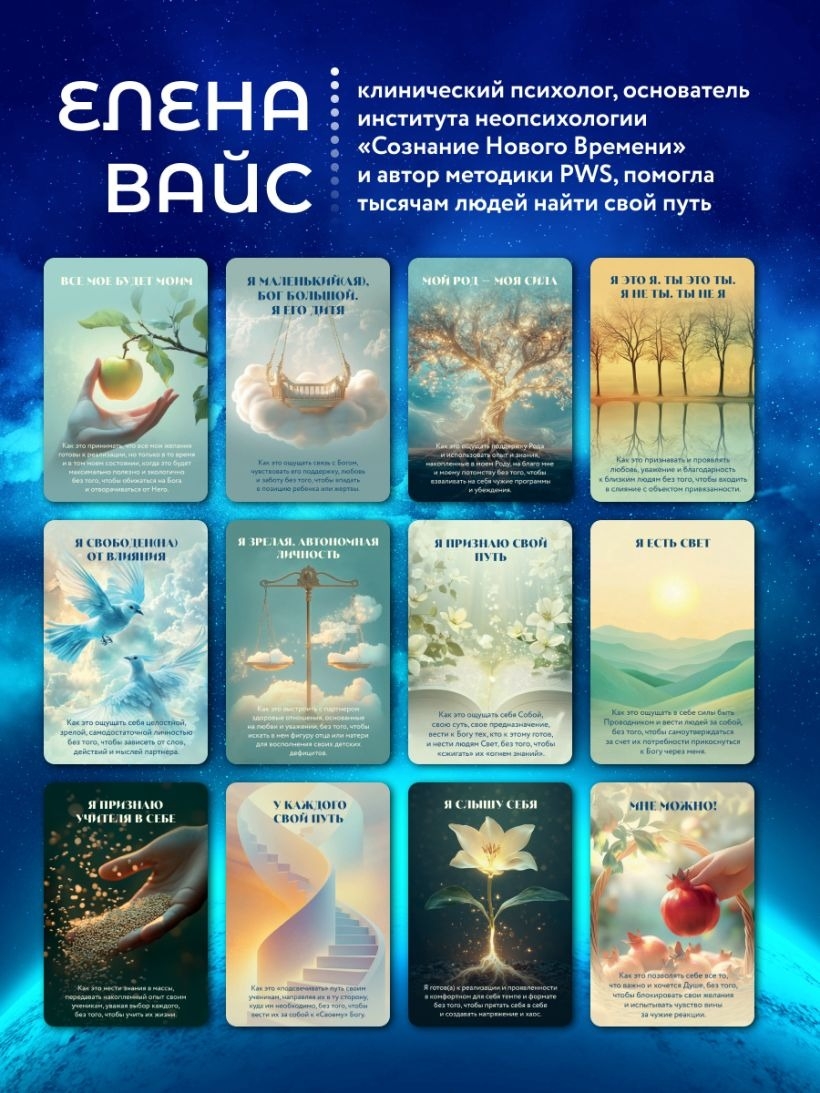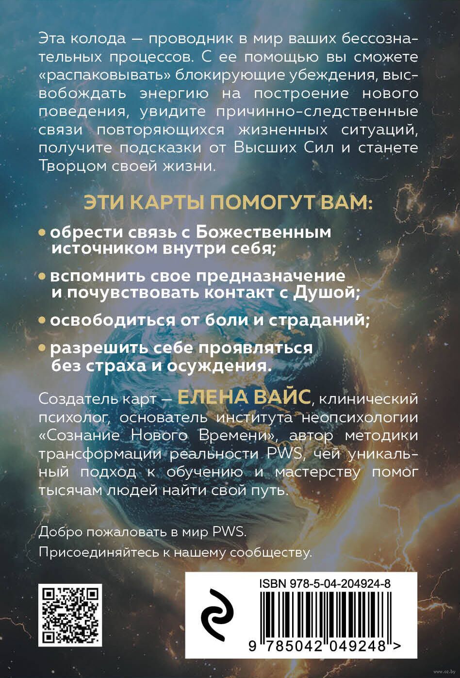 Хотите найти опору внути себя, разрешить себе проявляться без страха осуждения и достигать желаемого? Эти карты, созданные клиническим психологом и автором методики трансформации реальности PWS, Еленой Вайс, помогут вам по-новому смотреть на ситуации и чувствовать контакт со своей душой. На каждой карте – загрузка-подсказка, которая поможет обрести смысл и трансформировать свою жизнь.