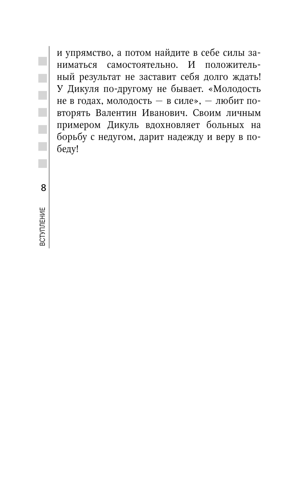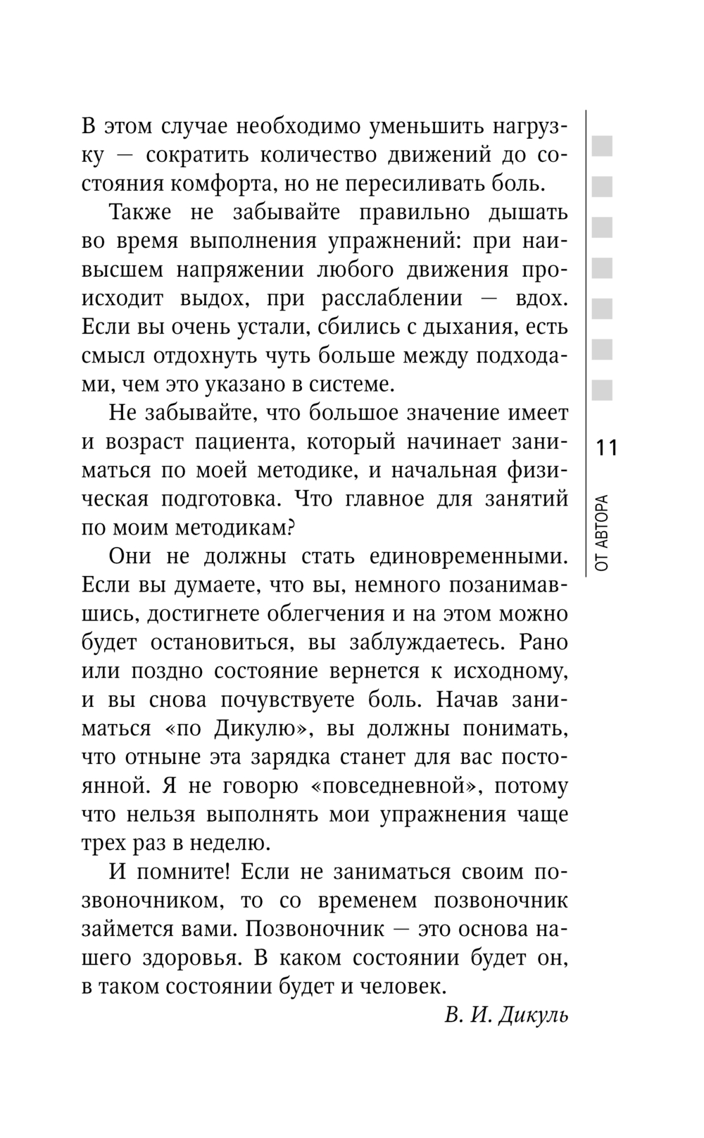 Легендарный Валентин Дикуль – самый известный специалист по болезням позвоночника. Сотни тысяч пациентов по всему миру получили исцеление по его методикам. Уже первая книга В. И. Дикуля вдохновила десятки тысяч людей разного возраста всерьез заняться своим позвоночником. А всего их было 12, и их оценили почти полмиллиона читателей. У каждого из вас – своя боль. Как от нее избавиться?