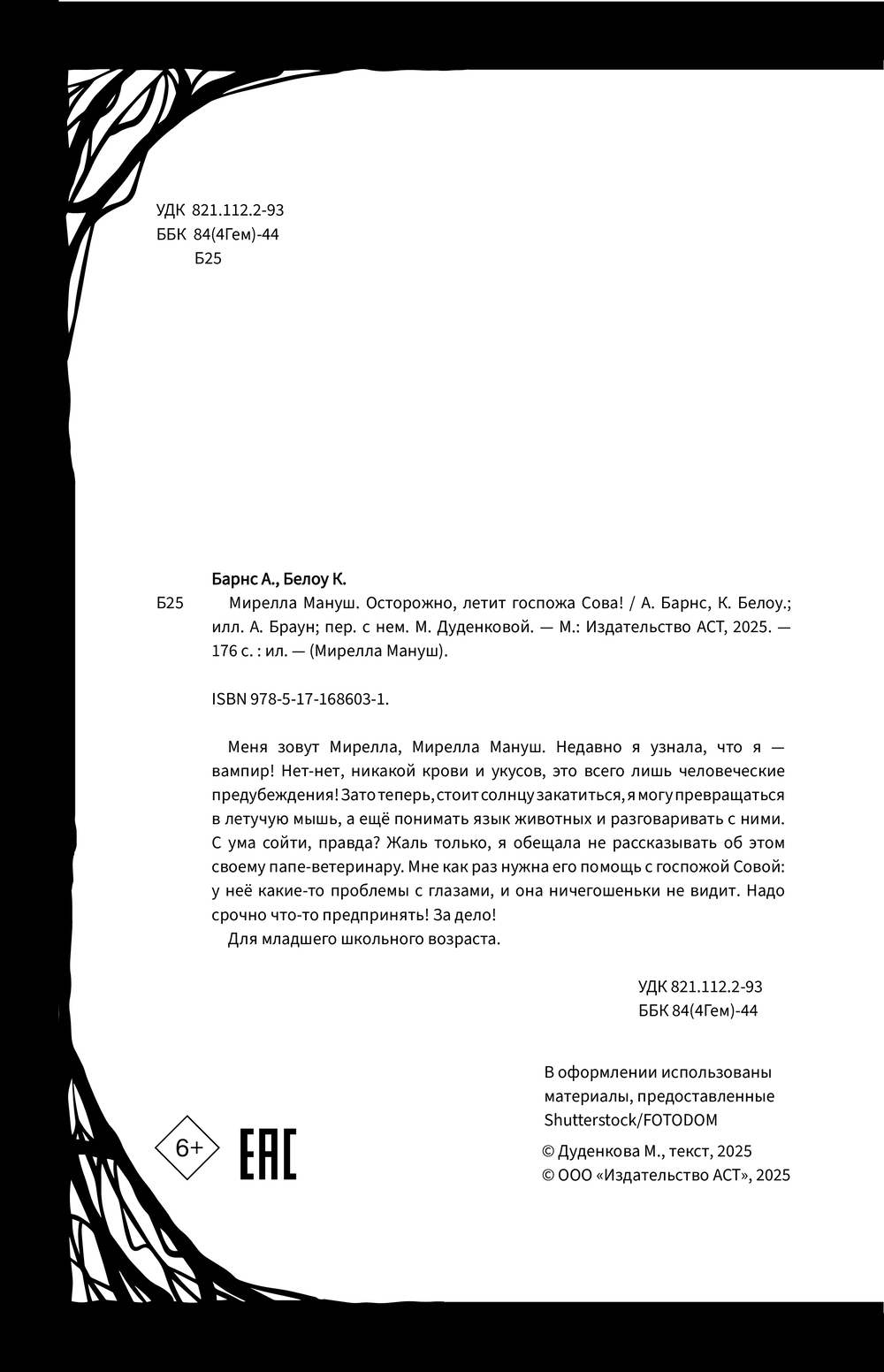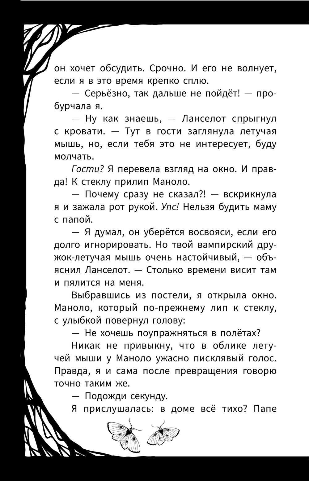 Меня зовут Мирелла, Мирелла Мануш. Недавно я узнала, что я – вампир! Нет-нет, никакой крови и укусов, это всего лишь человеческие предубеждения! Зато теперь, стоит солнцу закатиться, я могу превращаться в летучую мышь, а ещё понимать язык животных и разговаривать с ними. С ума сойти, правда? Жаль только, я обещала не рассказывать об этом своему папе-ветеринару. Мне как раз нужна его помощь с госпожой Совой: у неё какие-то проблемы с глазами, и она ничегошеньки не видит. Надо срочно что-то предпринять! За дело!