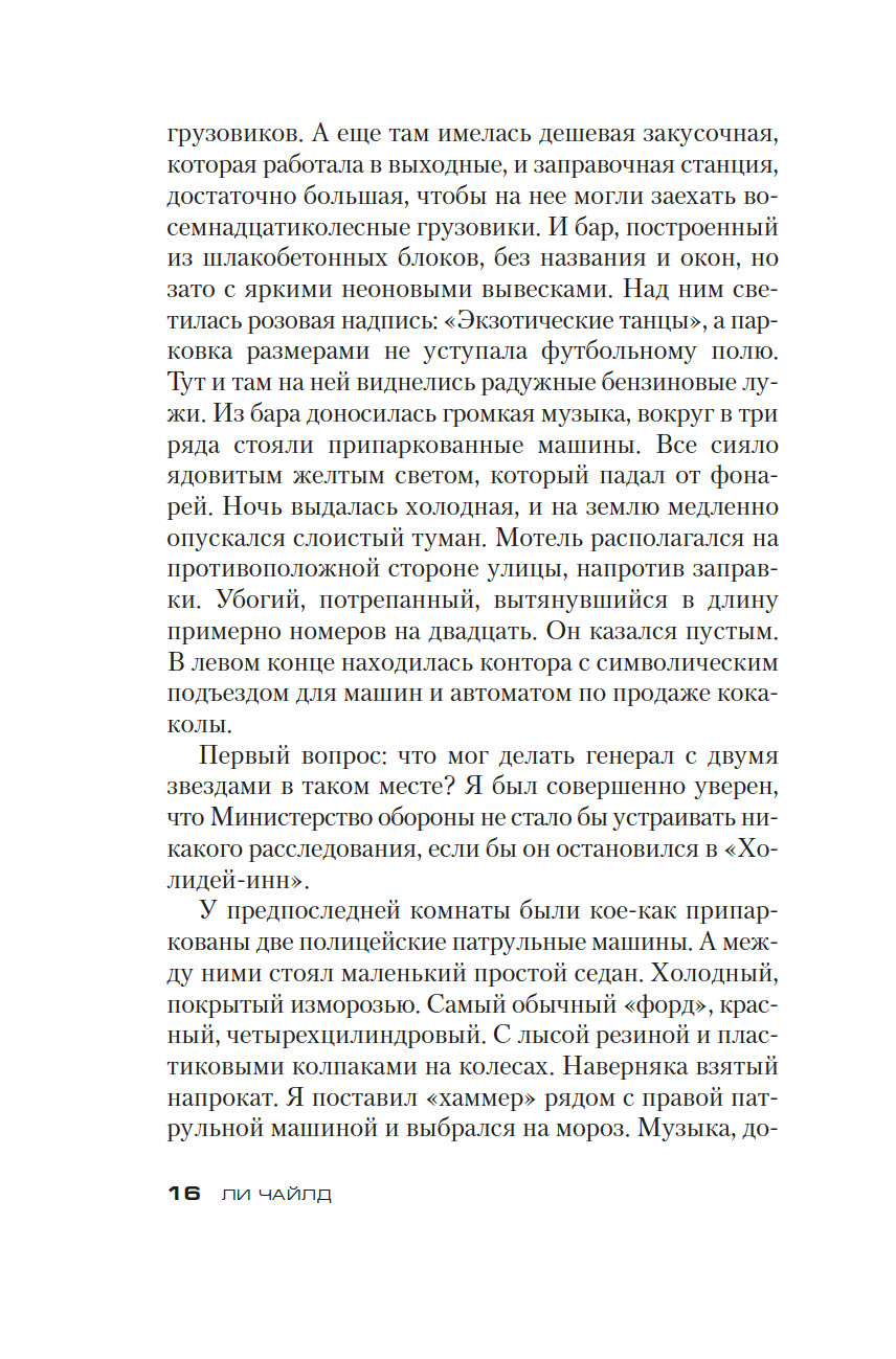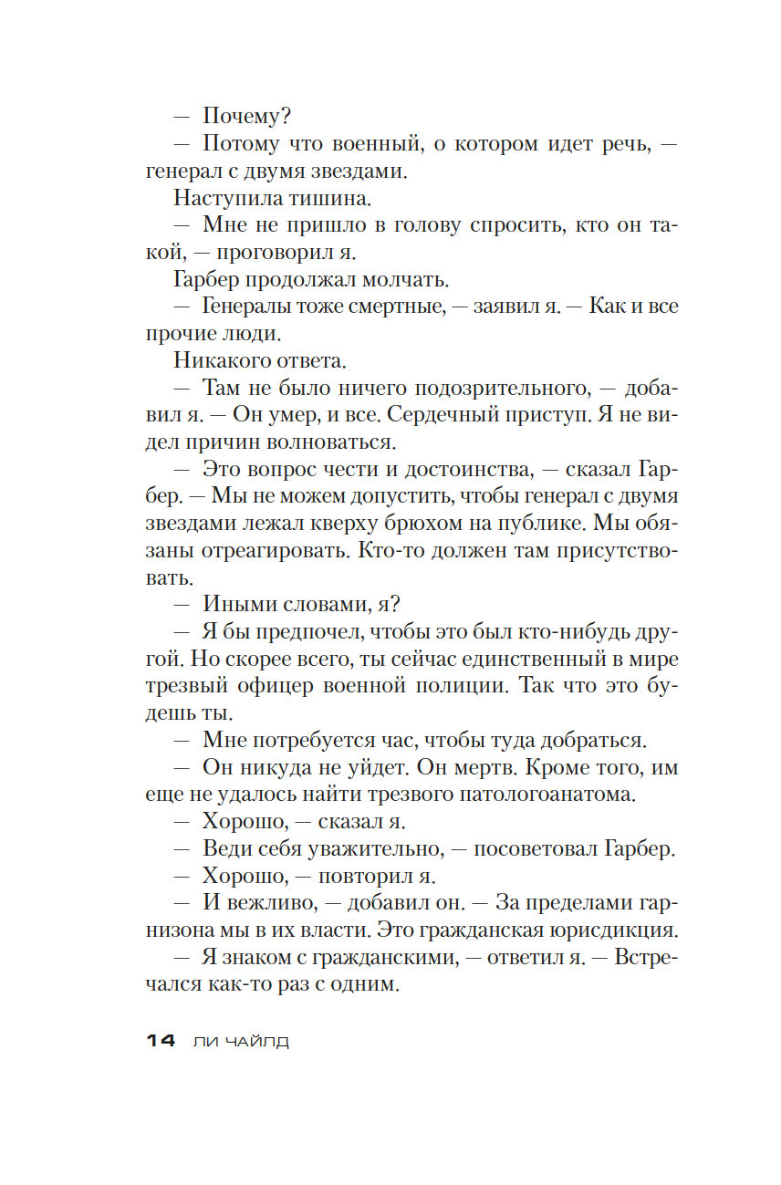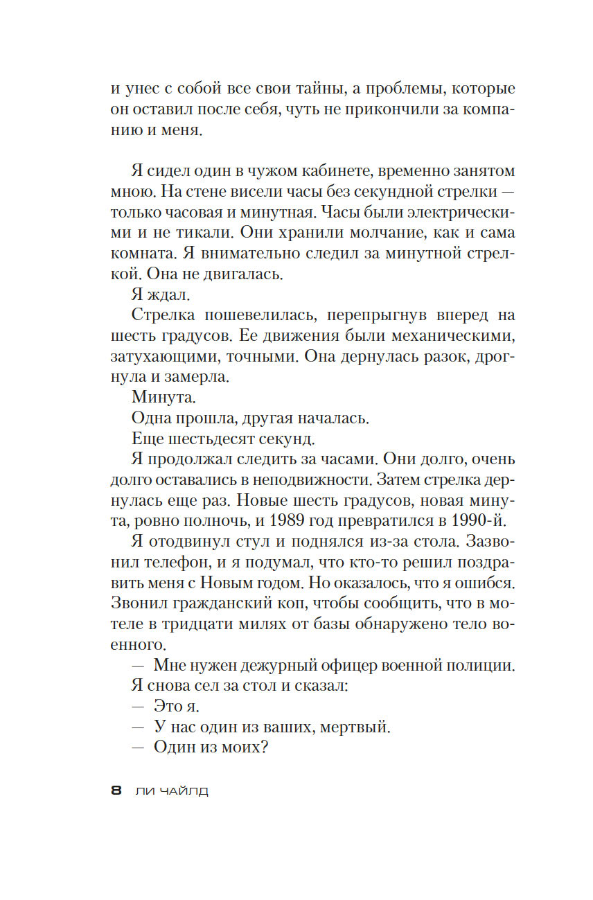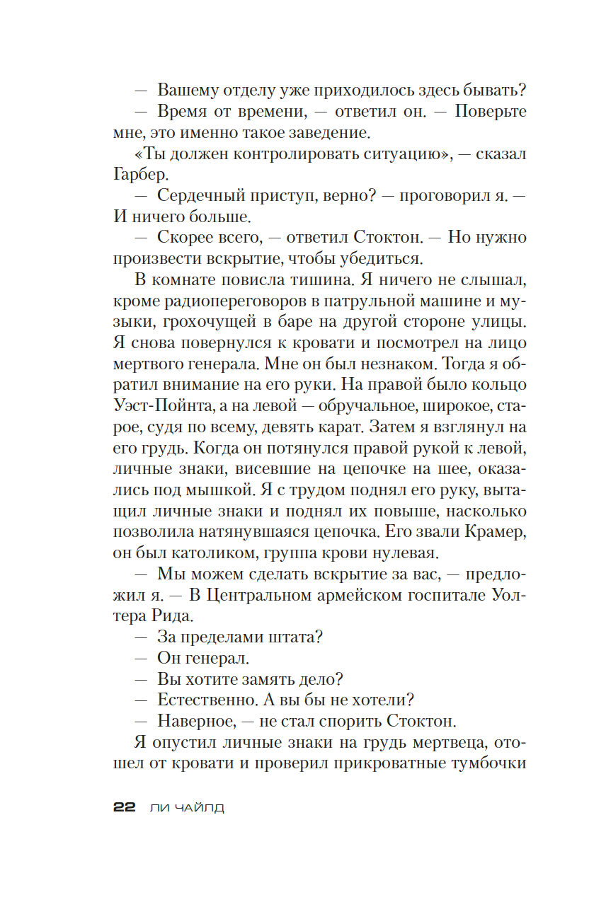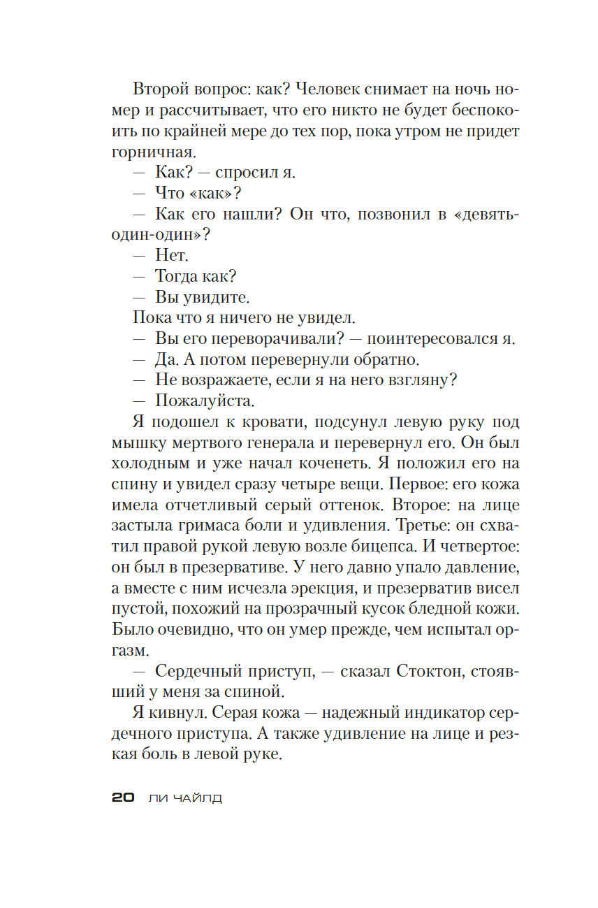 Канун нового, 1990 года. От сердечного приступа умирает генерал армии США. Ничего необычного, казалось бы, в этом нет, однако обстоятельства его смерти вызывают много вопросов. Высокий чин найден обнаженным в номере неприглядного мотеля, и дежурному офицеру военной полиции Джеку Ричеру приходится ехать на вызов. Он выясняет, что из номера похищен генеральский портфель, в котором, предположительно, были сверхсекретные бумаги, а вскоре находит тело вдовы генерала, убитой в собственном доме той же ночью. "Зачистка" продолжается: одного за другим уничтожают двух солдат спецназа. Происходят перестановки в высшем командовании. И кто-то внутри огромного бастиона, которым является американская армия, очень хочет подставить Джека Ричера – ранее неприкасаемого следователя особого отдела, – чтобы сделать его козлом отпущения для тех, кто привык убивать...