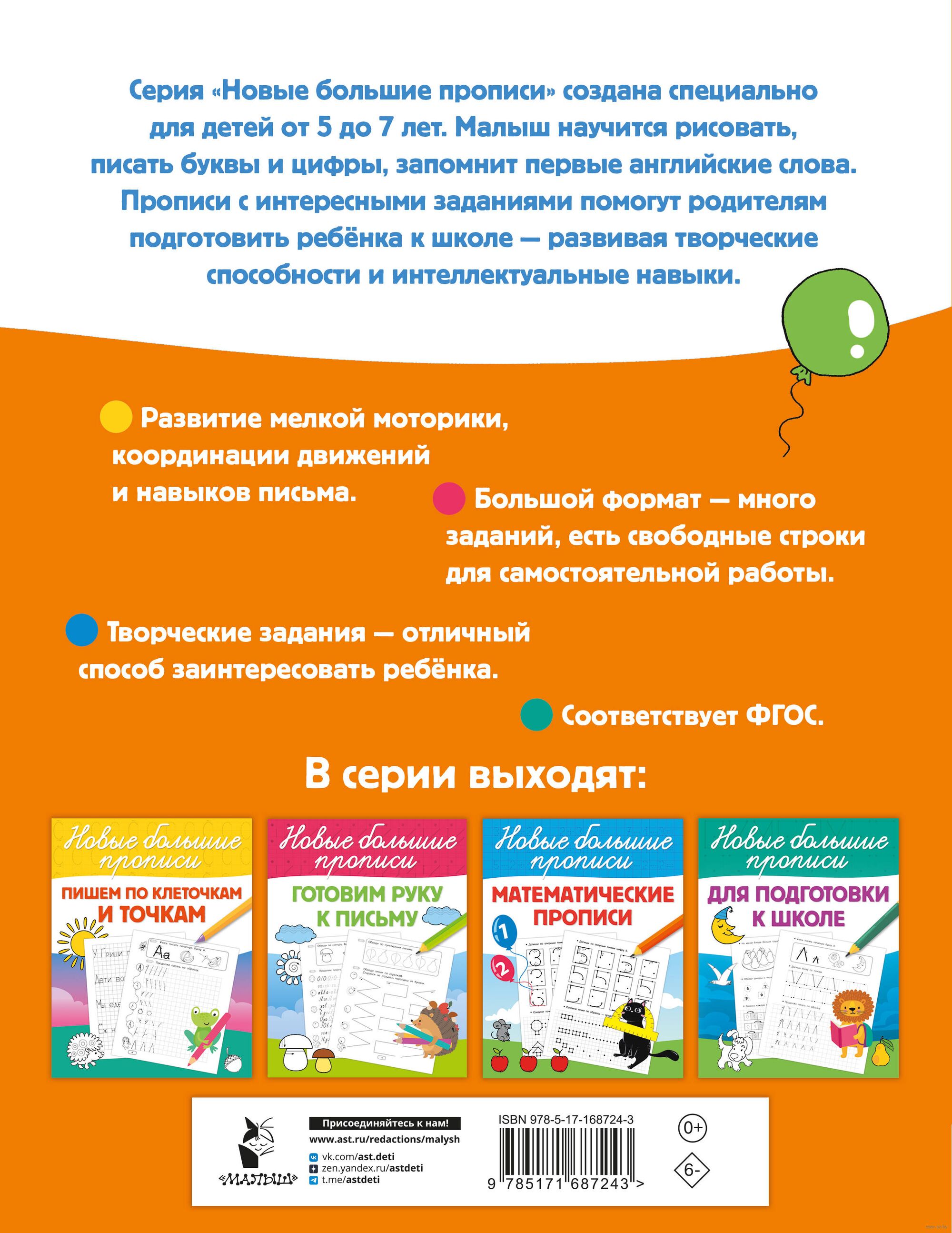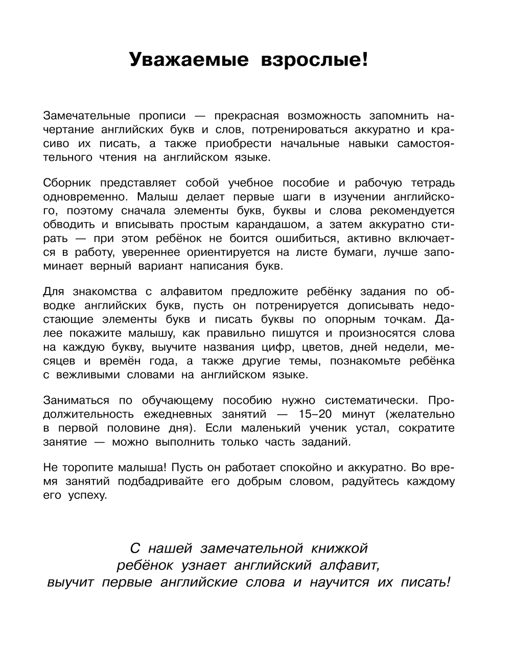 Совсем скоро ваш малыш пойдёт в первый класс! Занимательные развивающие прописи "Английский язык" помогут подготовить ребёнка к обучению в школе и к овладению полезными навыками: ребёнок шаг за шагом освоит английский алфавит, запомнит начертание английских букв и слов, сможет потренироваться аккуратно и красиво их писать, а также выучит более 100 английских слов и освоит азы самостоятельного чтения на английском языке. Прекрасно оформленная и методически выверенная книга большого формата поможет вам в ваших занятиях с дошкольником и превратит их в чудесное путешествие в Страну знаний.