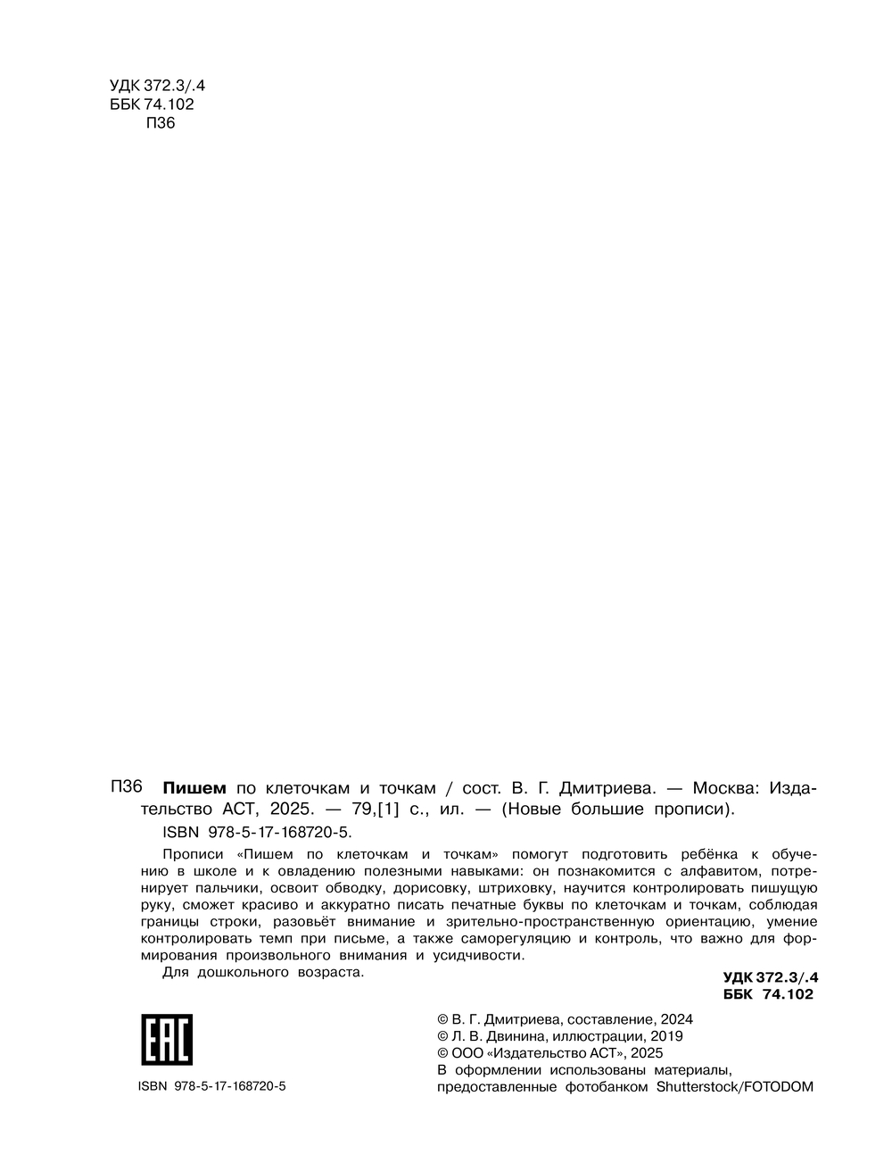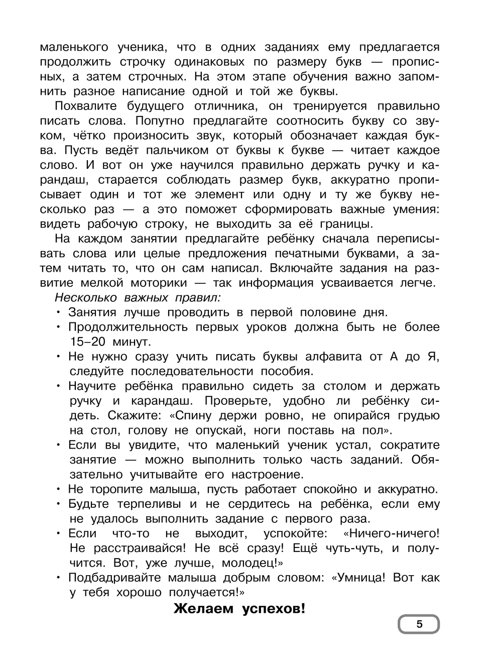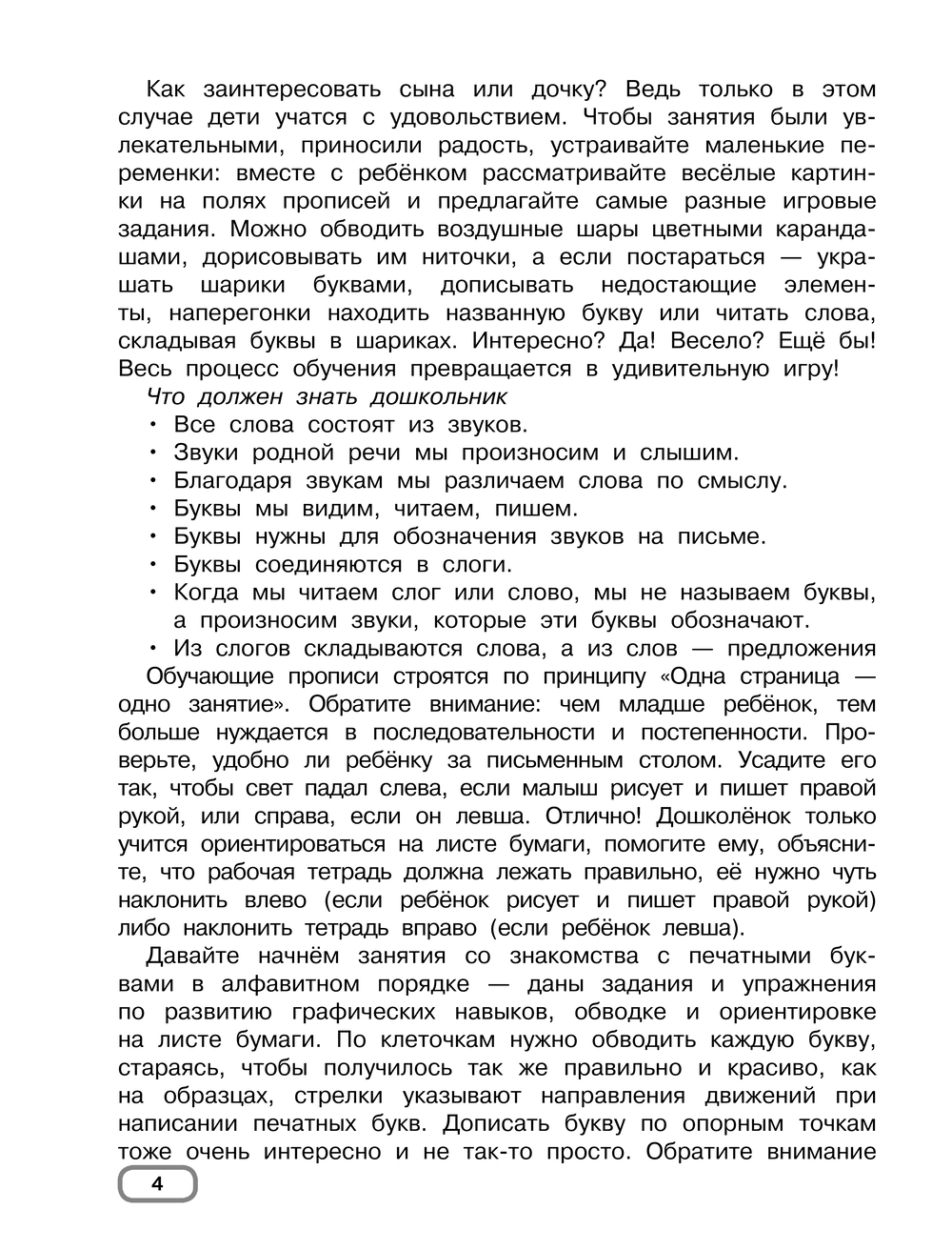 Совсем скоро ваш малыш пойдёт в первый класс! Занимательные развивающие прописи "Пишем по клеточкам и точкам" помогут подготовить ребёнка к обучению в школе и к овладению полезными навыками: он познакомится с алфавитом, потренирует пальчики, освоит обводку, дорисовку, научится контролировать пишущую руку, сможет красиво и аккуратно писать печатные буквы по клеточкам и точкам, соблюдая границы строки, разовьёт внимание и зрительно-пространственную ориентацию, умение контролировать темп при письме, а также саморегуляцию и контроль, что важно для формирования произвольного внимания и усидчивости.